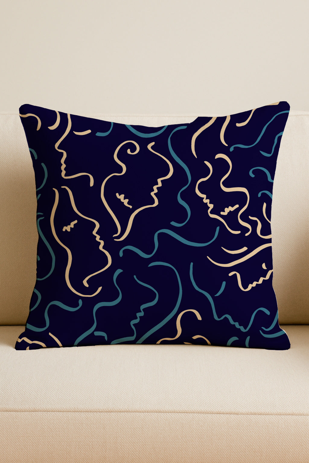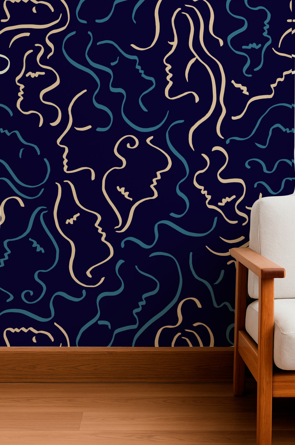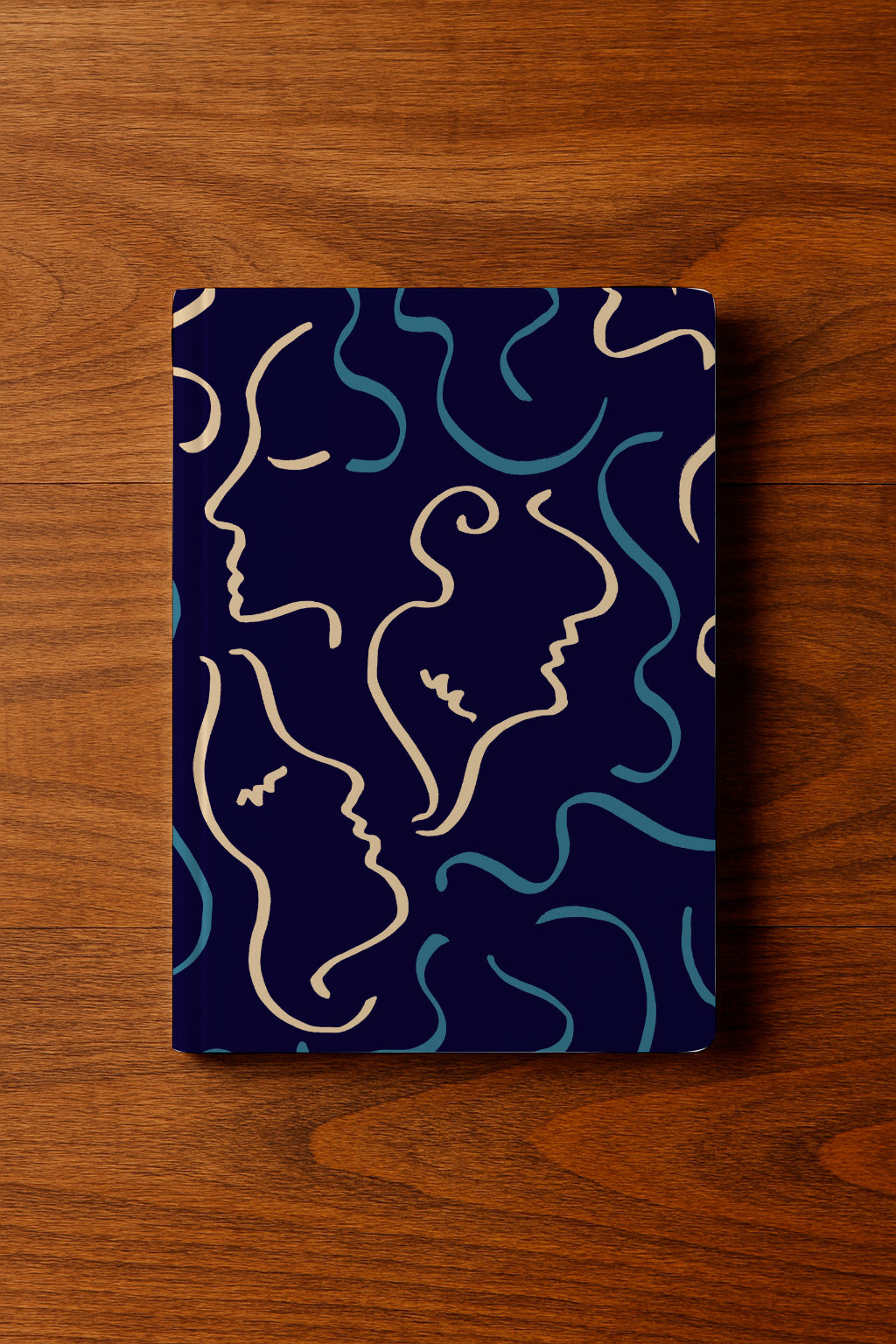 Siluetas de rostros en tonos crema y azul sobre un fondo azul marino intenso.