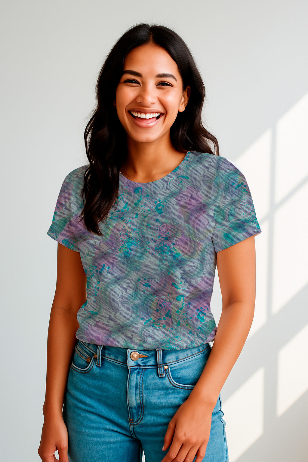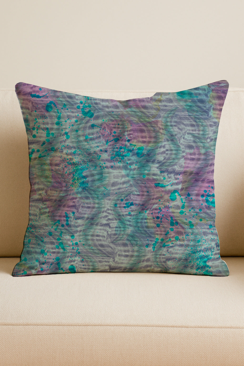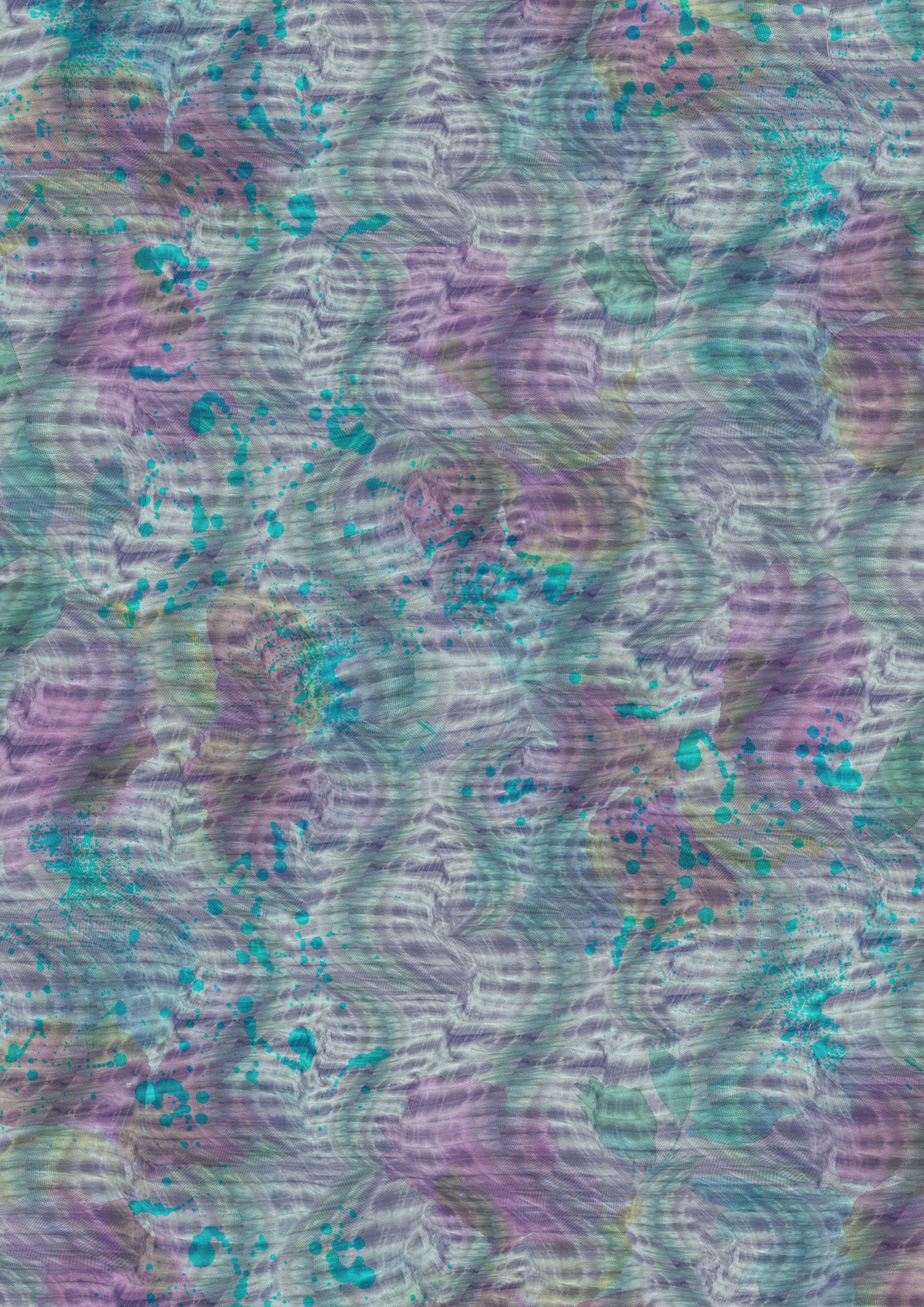 Salpicaduras orgánicas de color turquesa y púrpura sobre un fondo suave y texturizado.