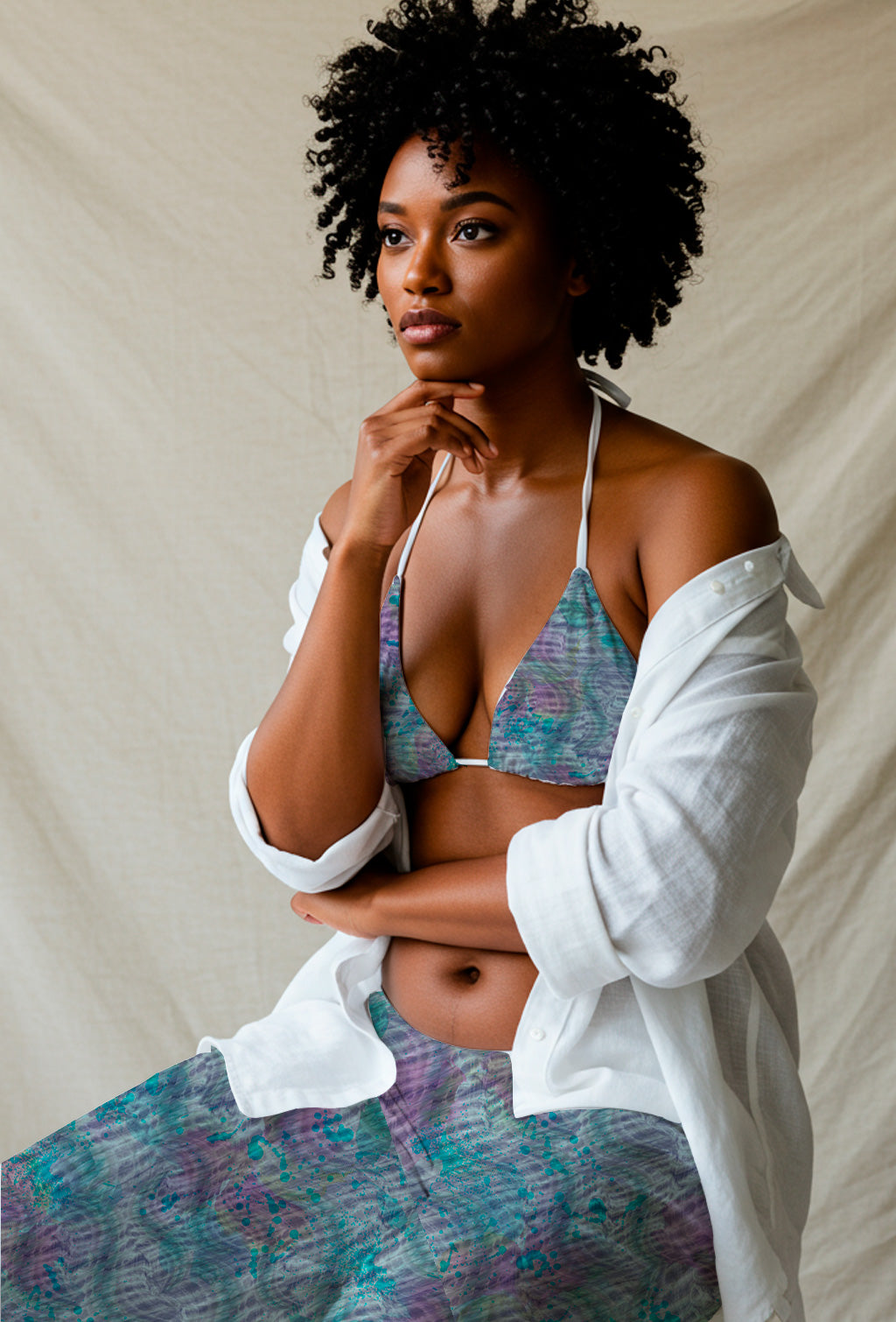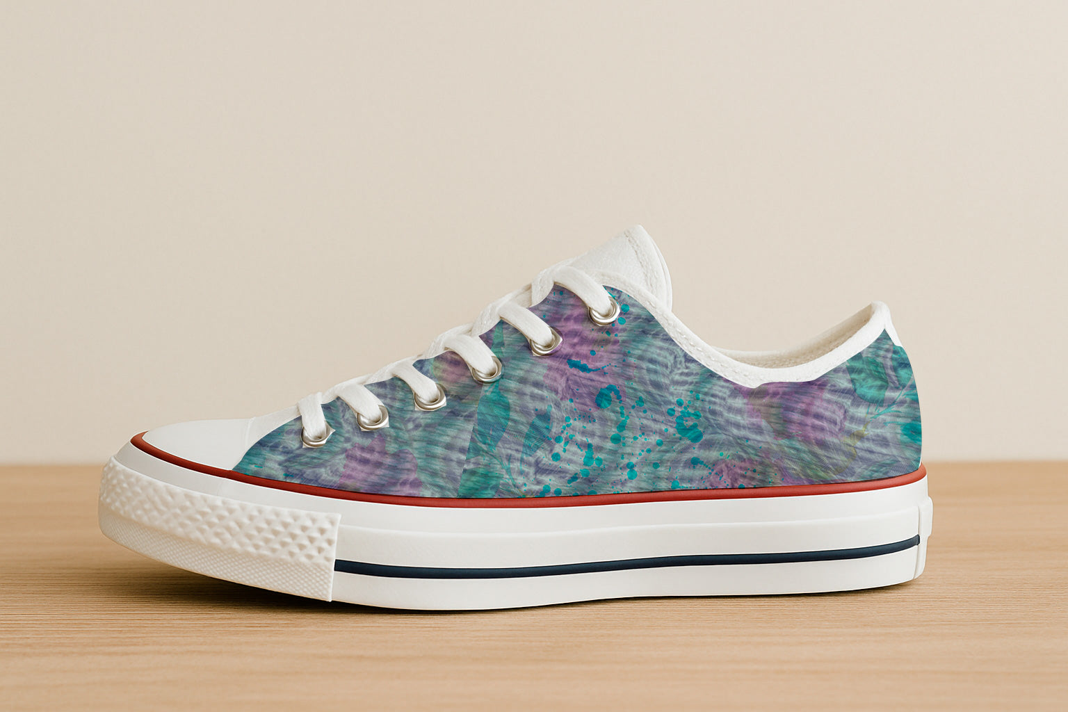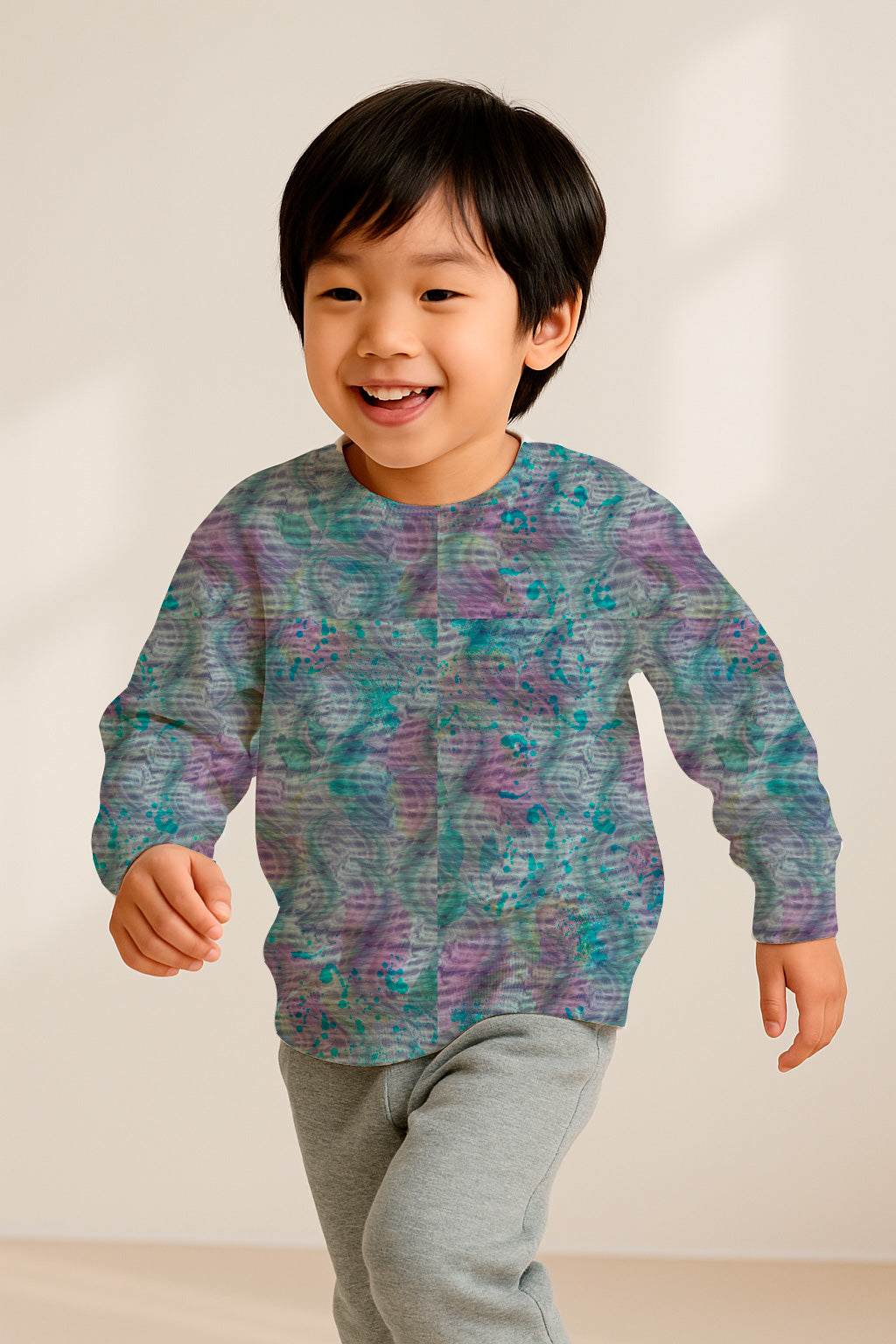 Salpicaduras orgánicas de color turquesa y púrpura sobre un fondo suave y texturizado.