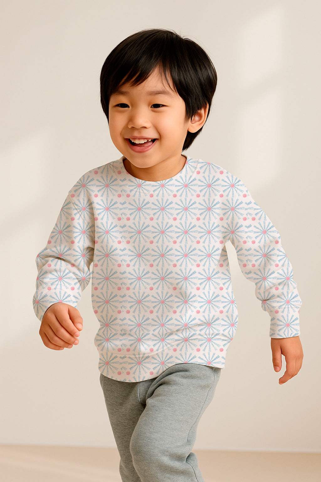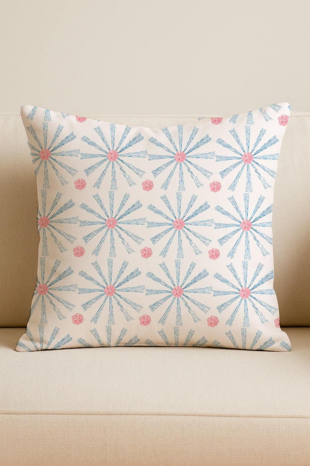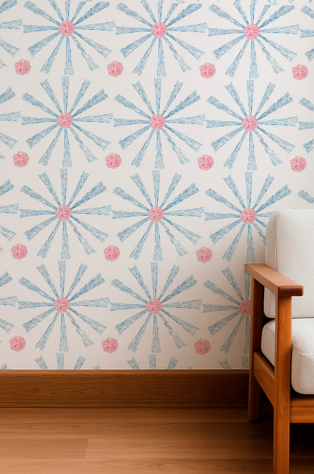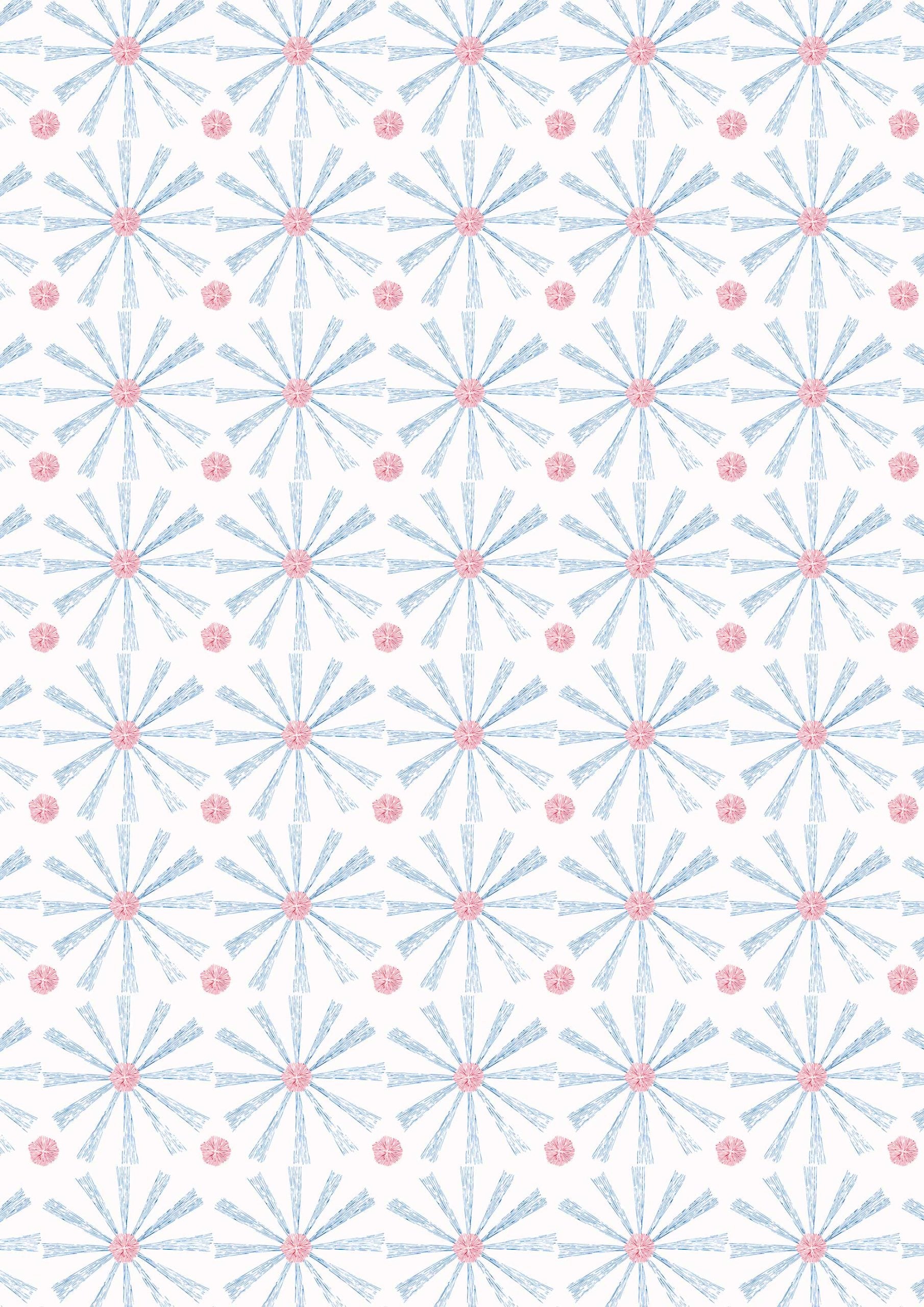 Estallidos geométricos de flores con trazos de tinta azul y roja dispuestos en una cuadrícula ordenada sobre un fondo blanco.
