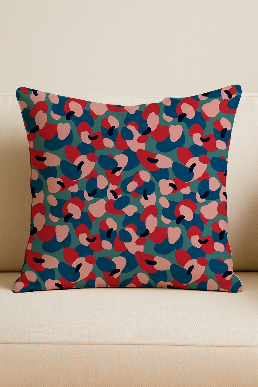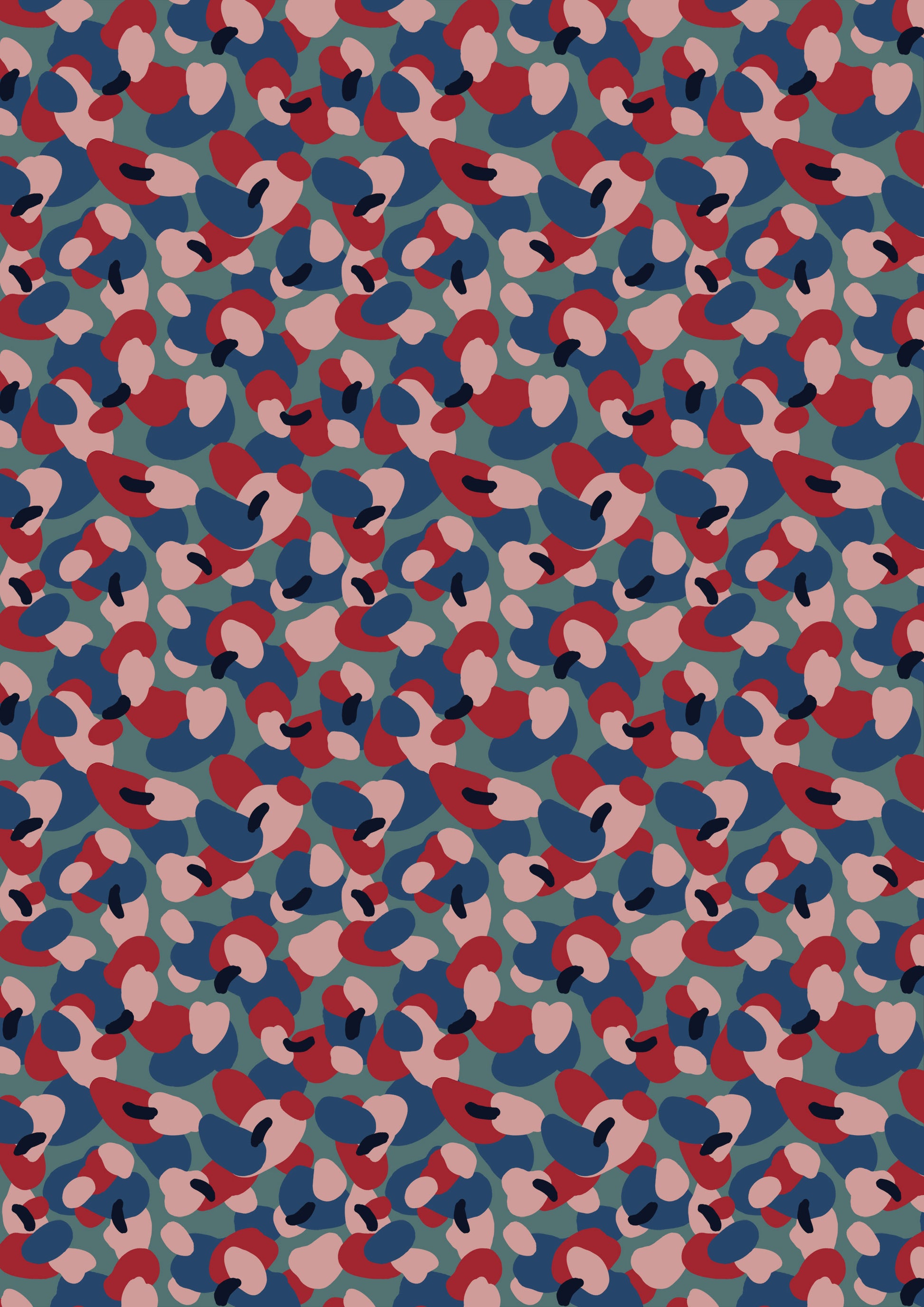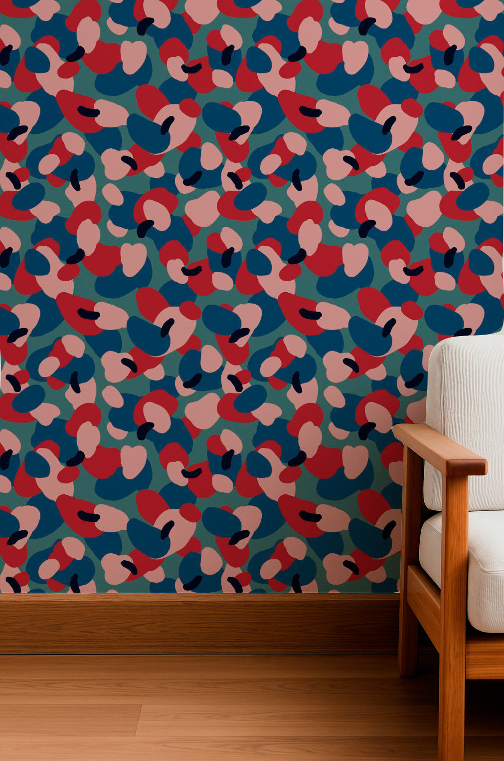 Una composición abstracta de formas inspiradas en pinceladas en rojo, rosa, azul marino y verde azulado. Llena de energía y movimiento.