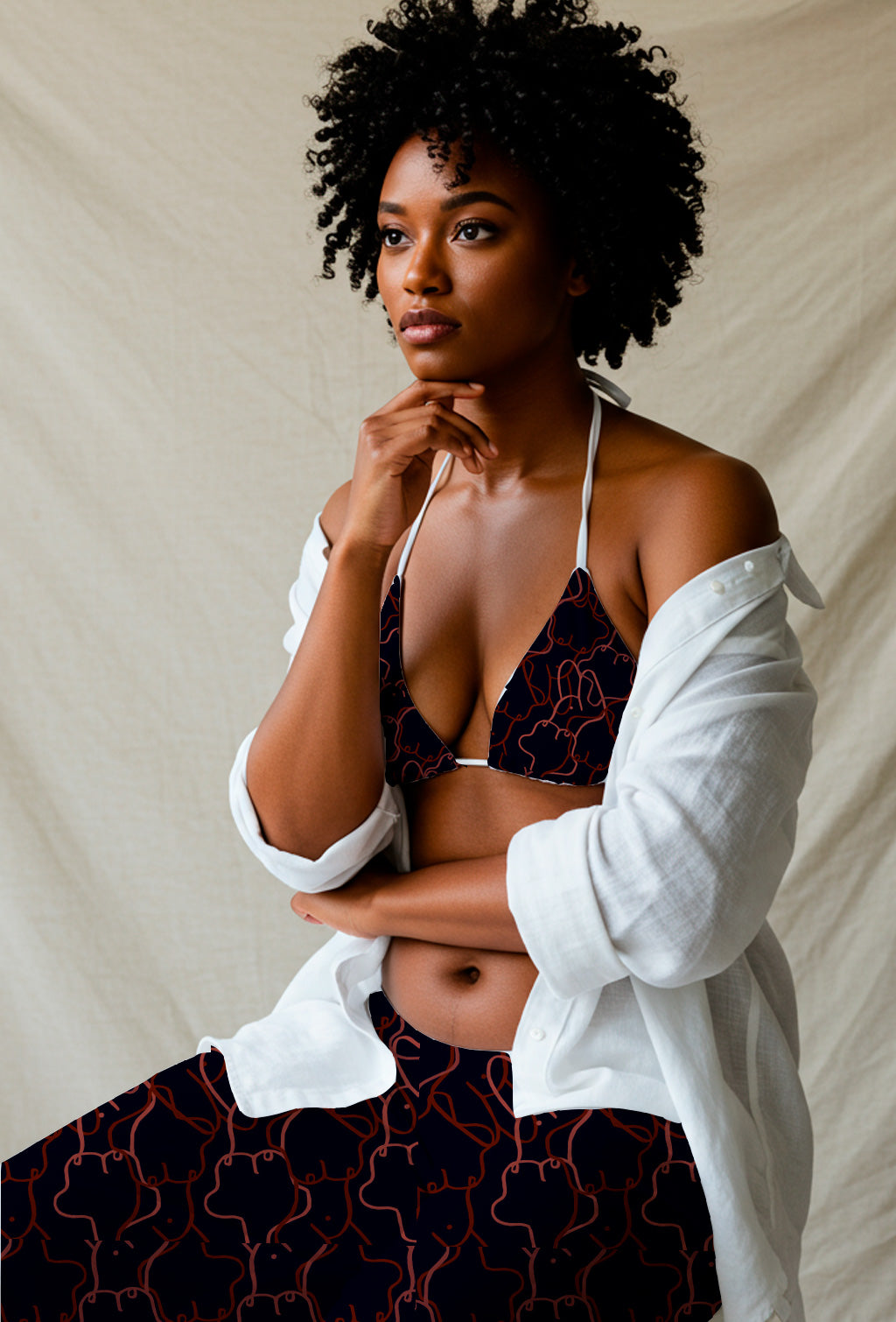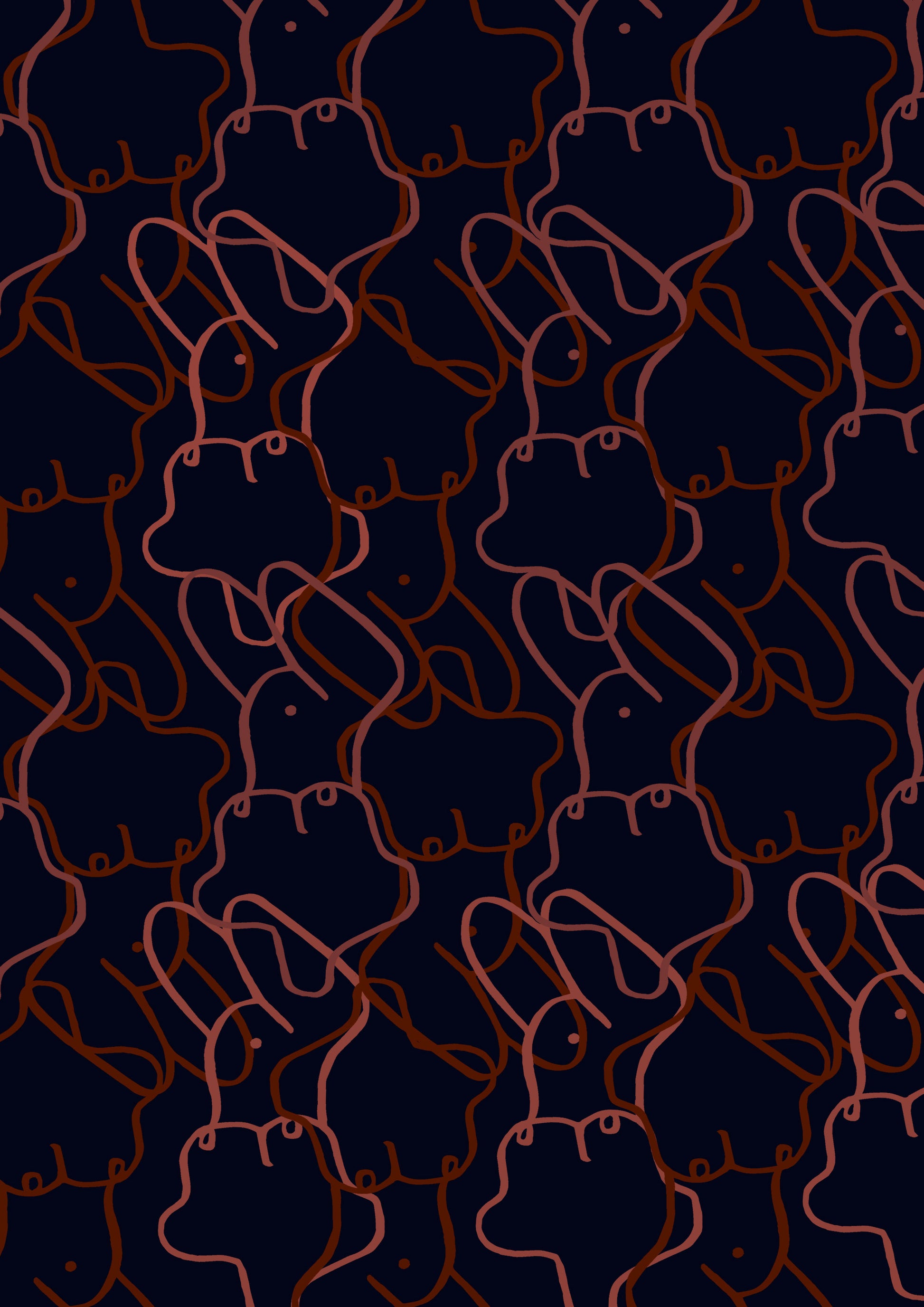 Dibujos de contornos marcados de formas femeninas en tonos rojo parduzco sobre un fondo azul marino oscuro. Expresivos y minimalistas a la vez.