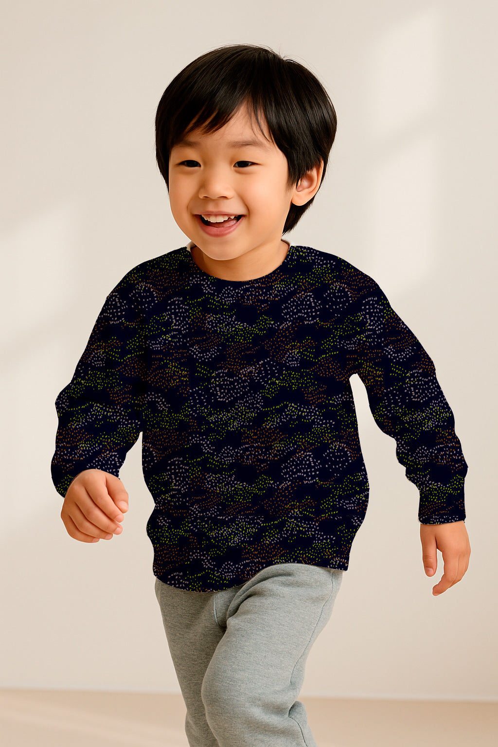 Textura orgánica punteada que evoca la naturaleza, utilizando verdes, marrones, grises y chartreuse sobre una base oscura.