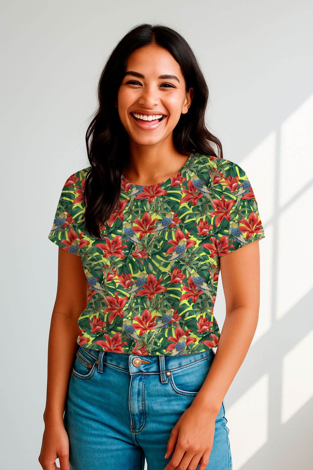 Lirios rojos realistas y loros azul-amarillos sobre grandes hojas tropicales y fondo verde ácido. Exuberante y exótico.