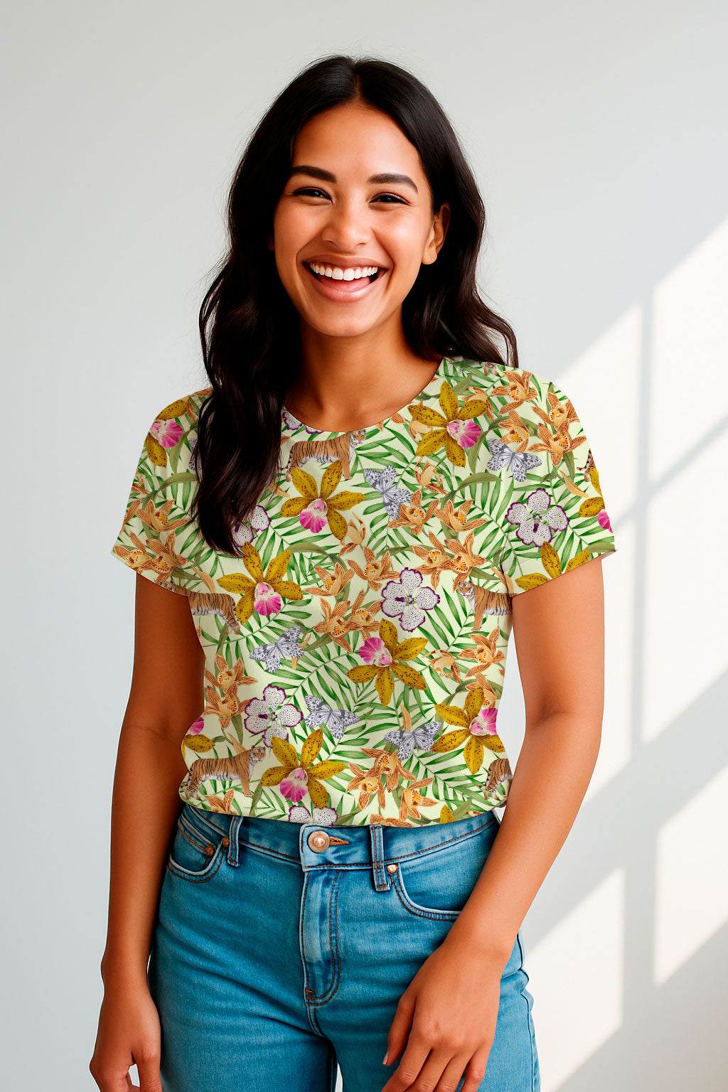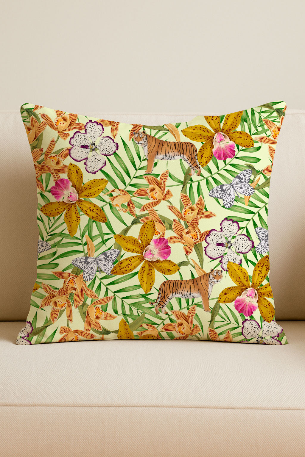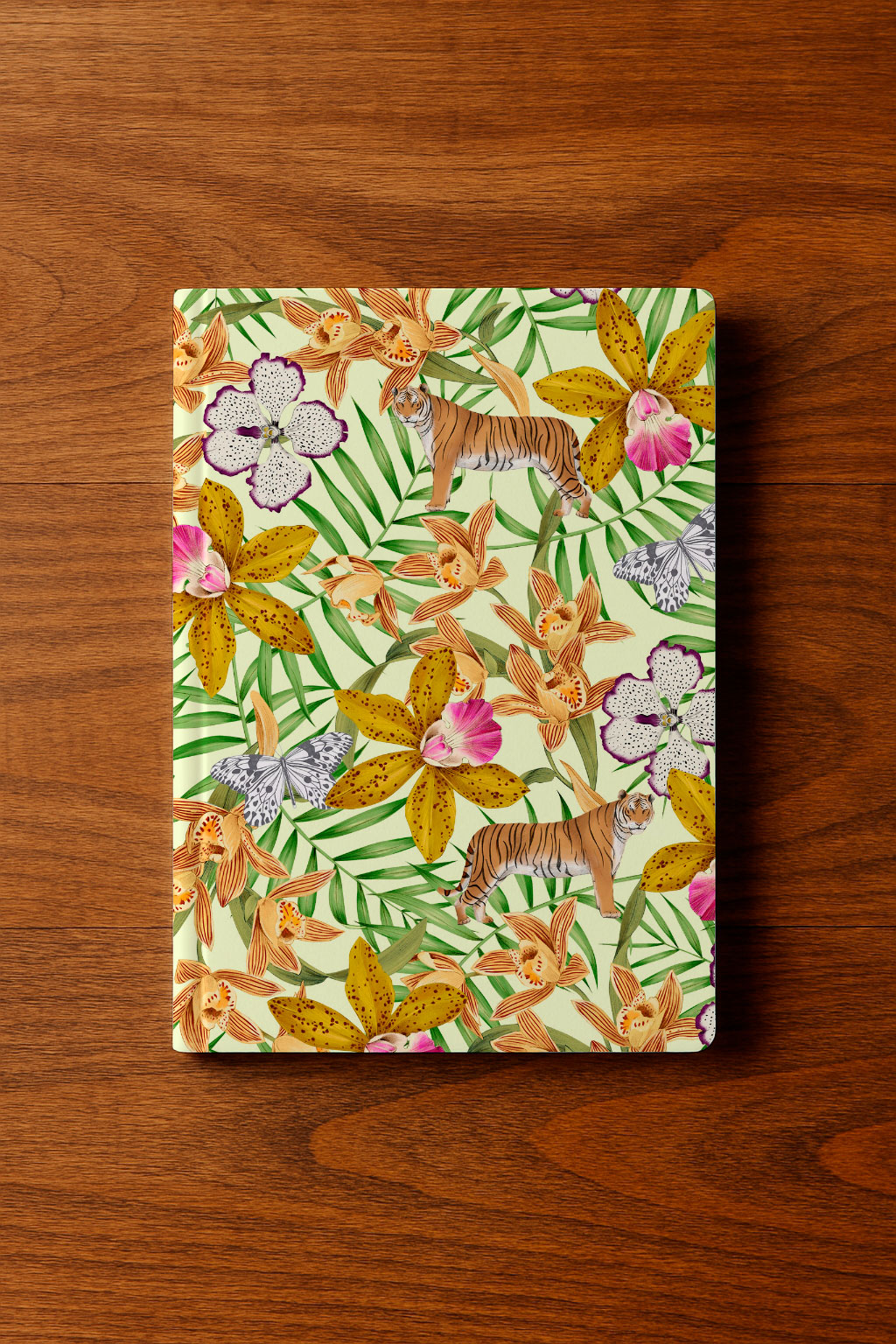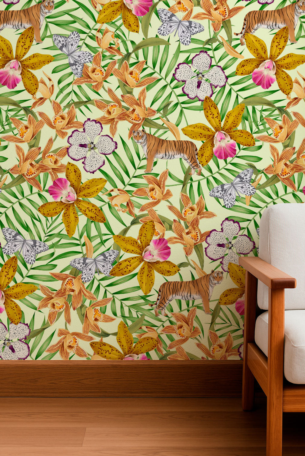 Tigres ilustrados rodeados de orquídeas, mariposas y hojas de bambú. Salvaje y femenino.