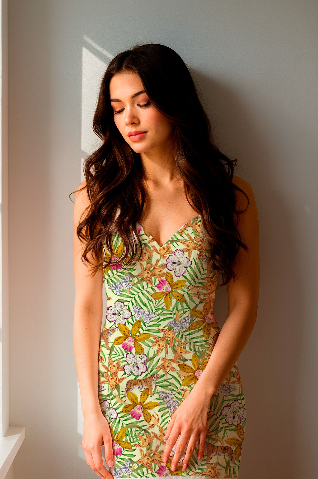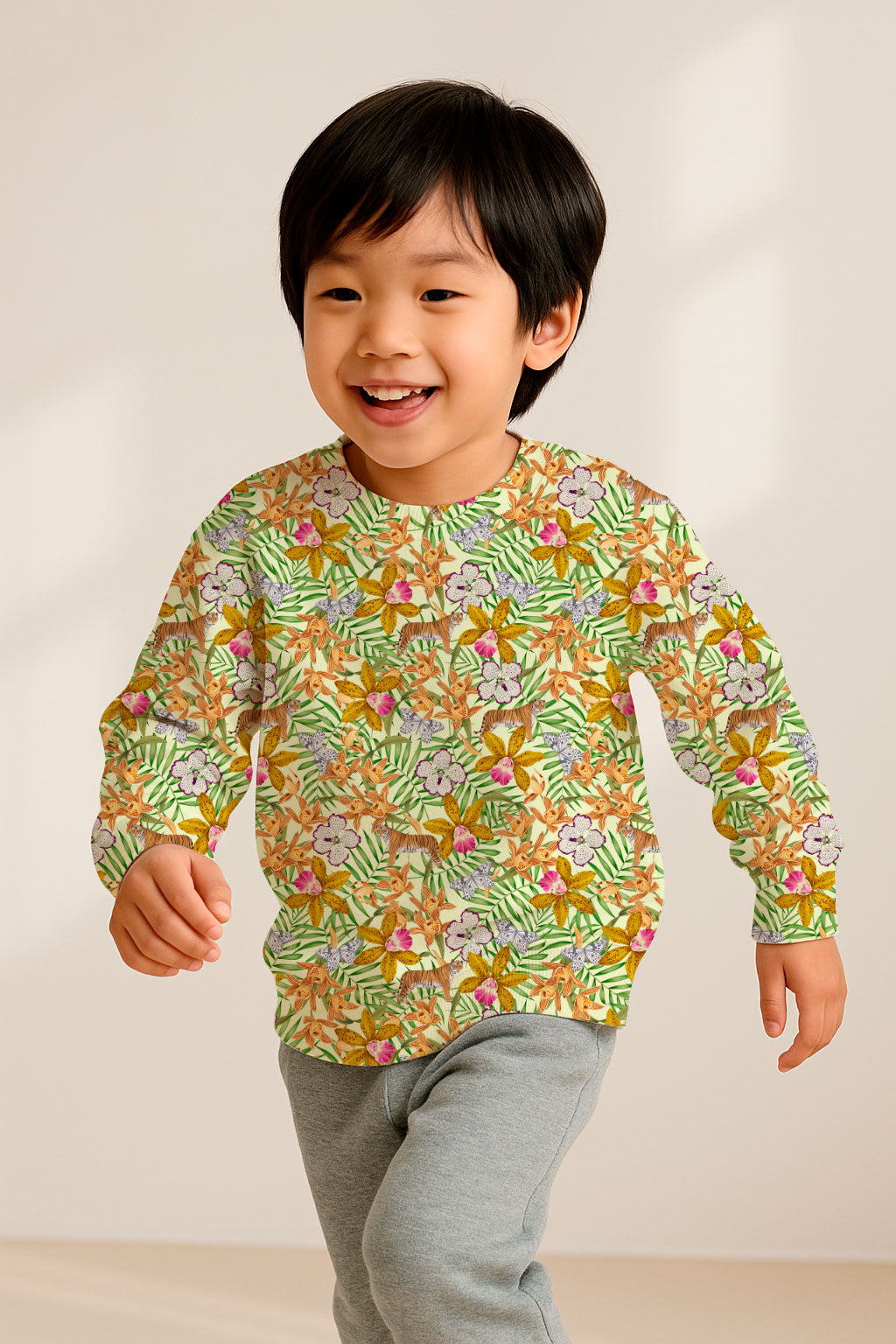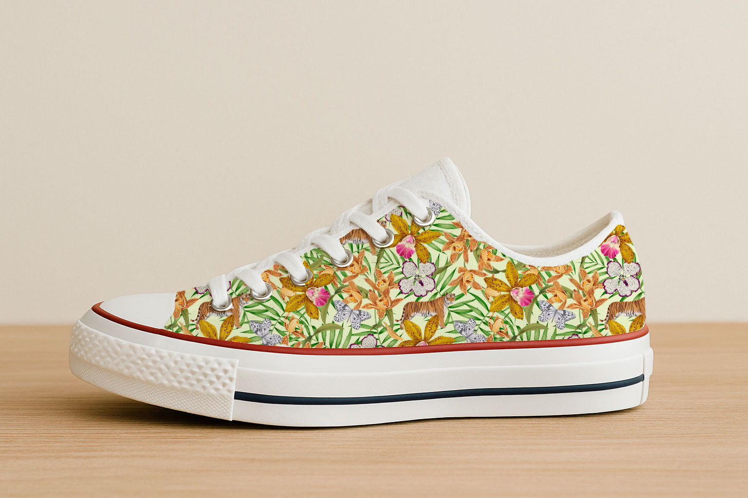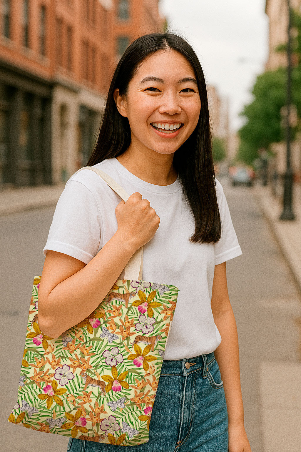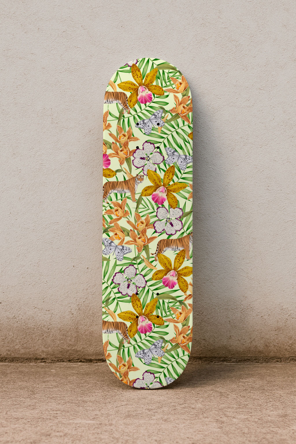 Tigres ilustrados rodeados de orquídeas, mariposas y hojas de bambú. Salvaje y femenino.