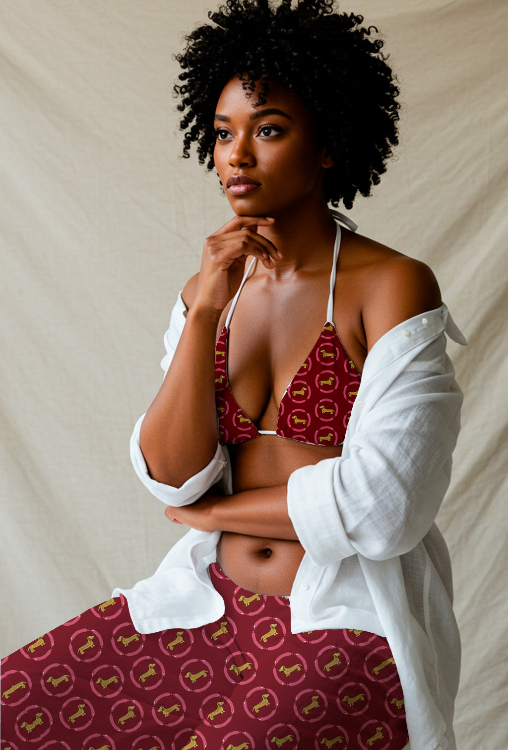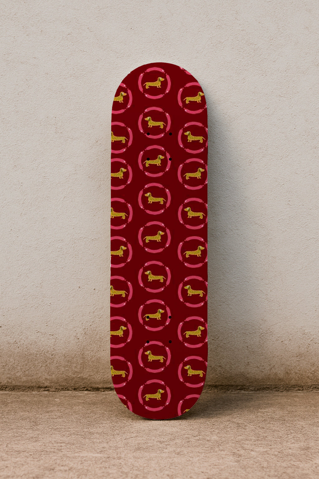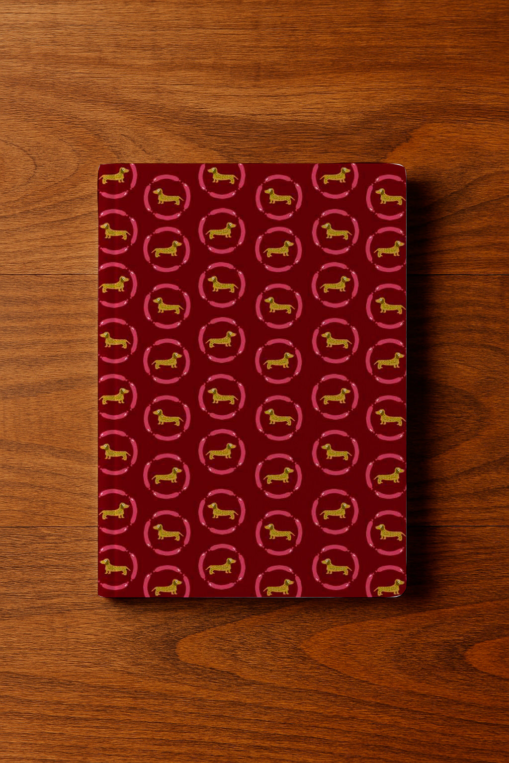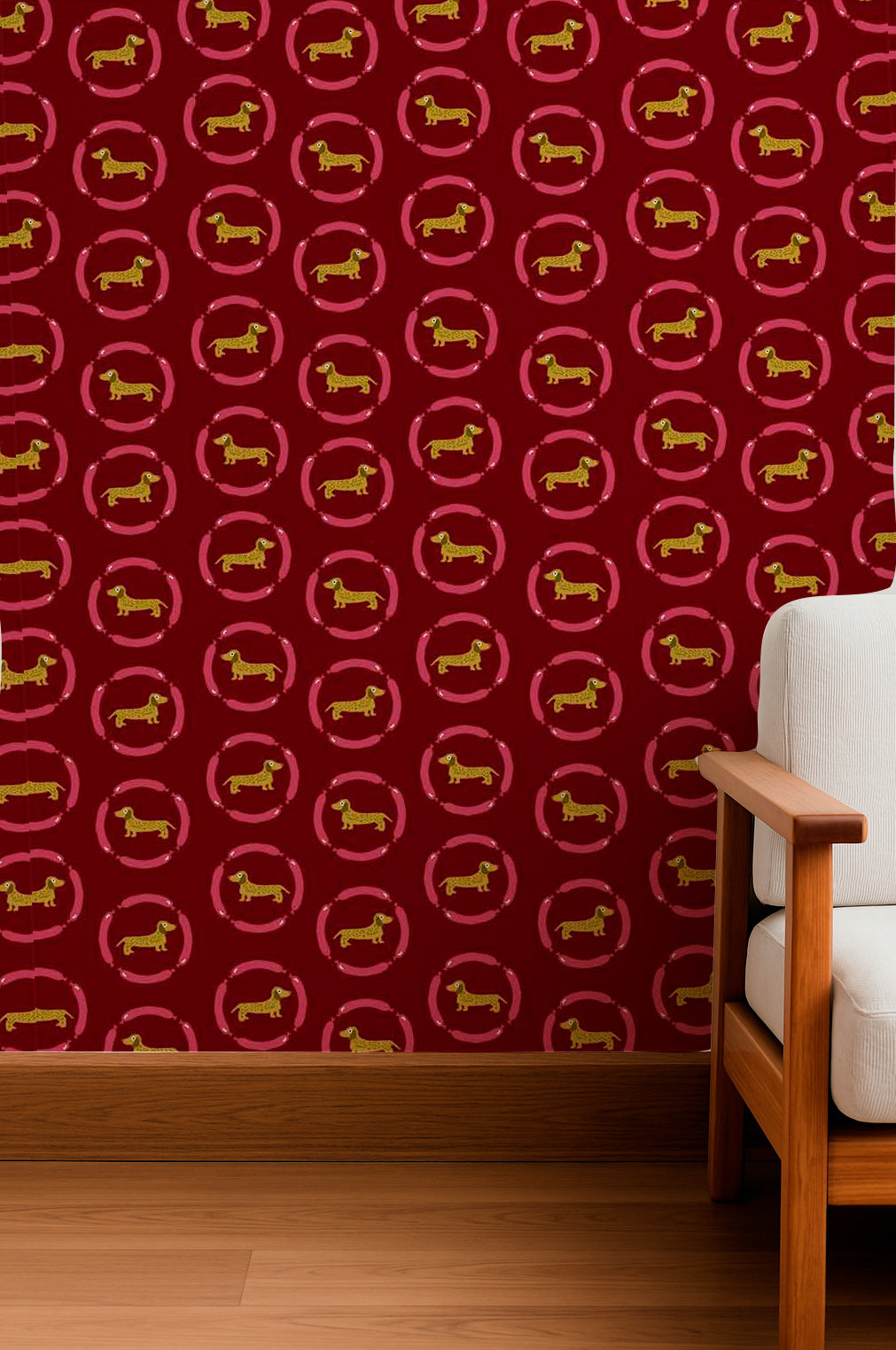 Un estampado divertido con perros salchicha dorados dentro de marcos circulares rosas sobre un fondo burdeos intenso.