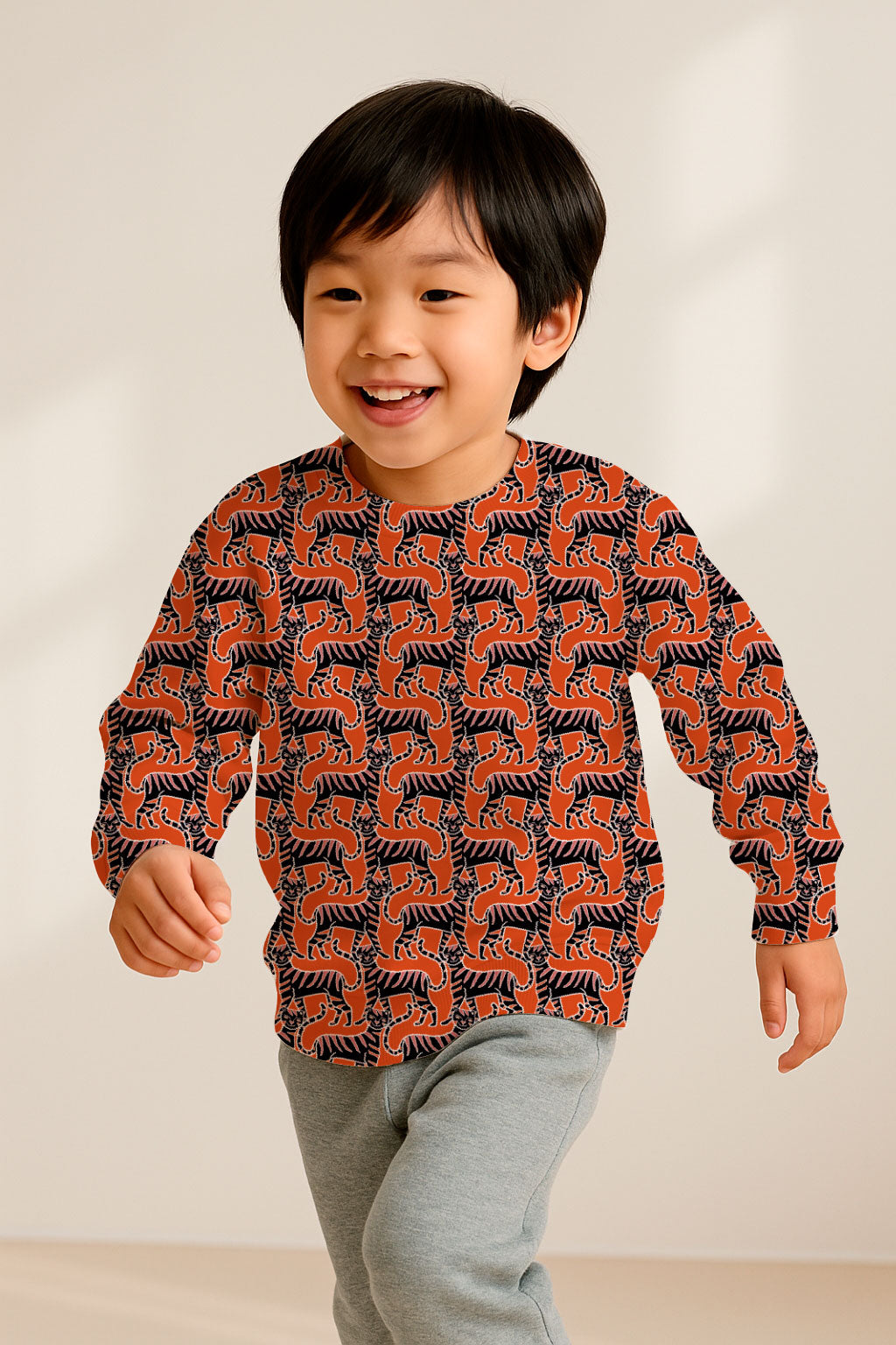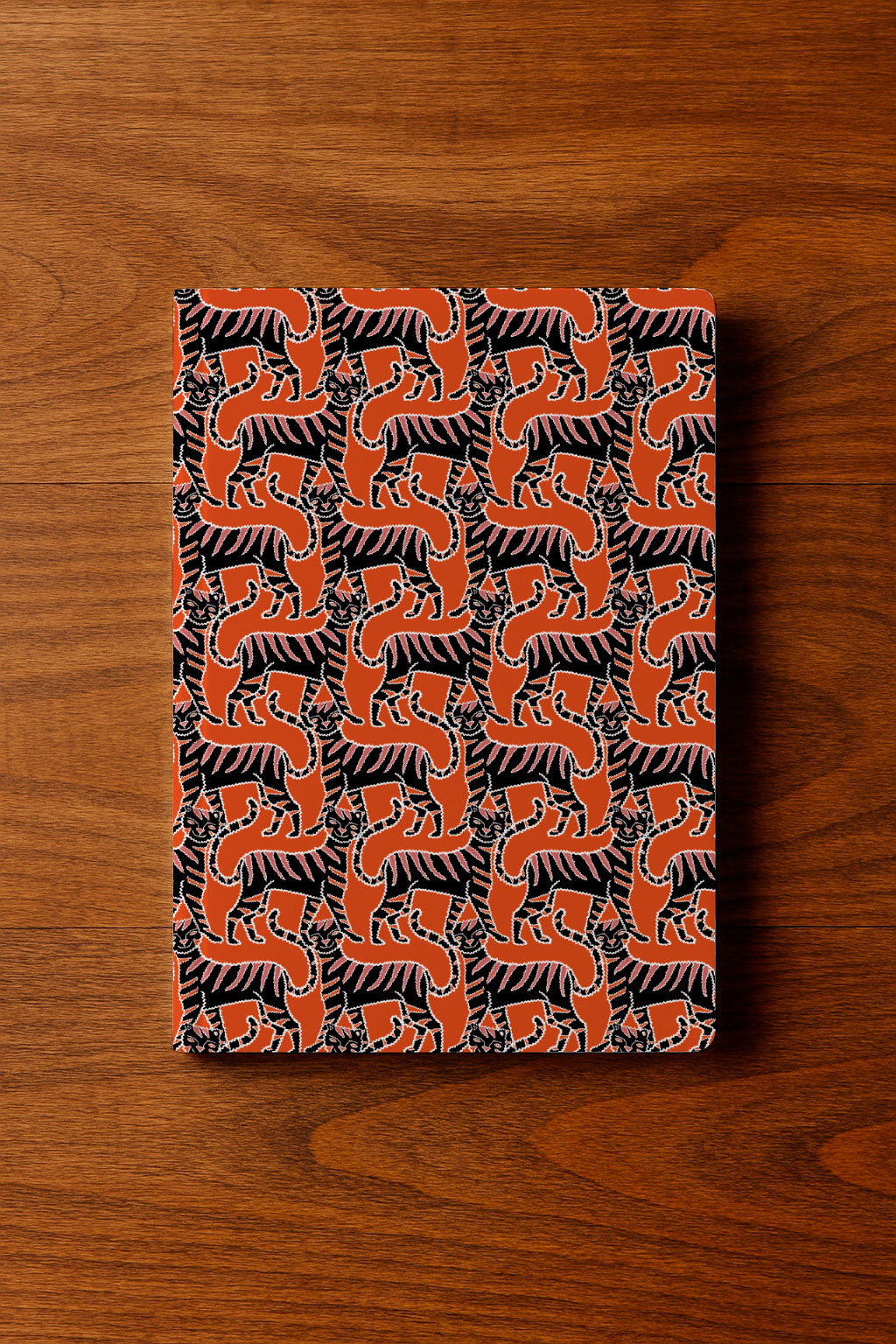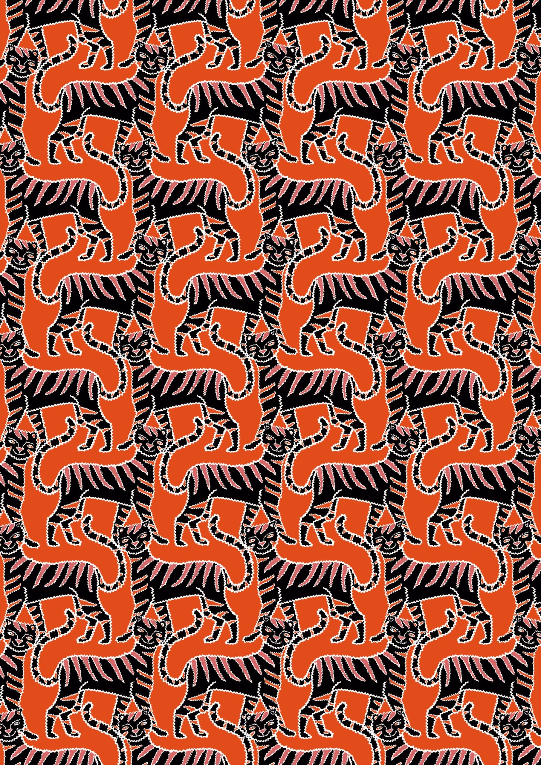 Siluetas de gatos de color naranja intenso crean un patrón geométrico dinámico sobre un fondo negro.