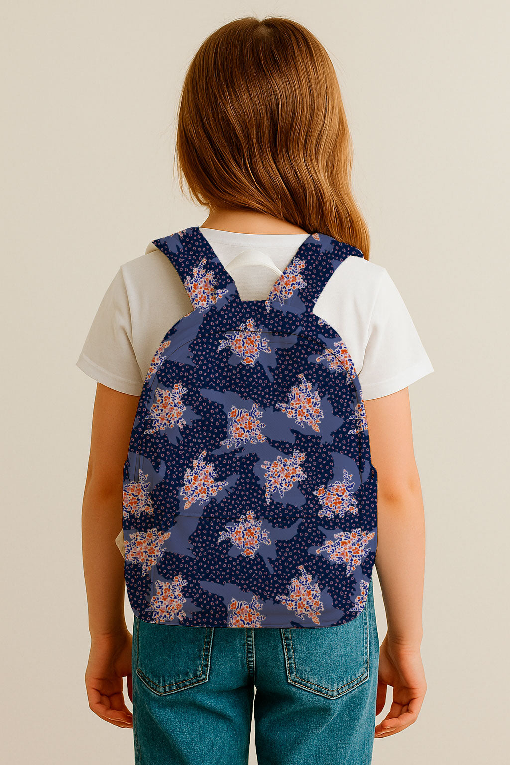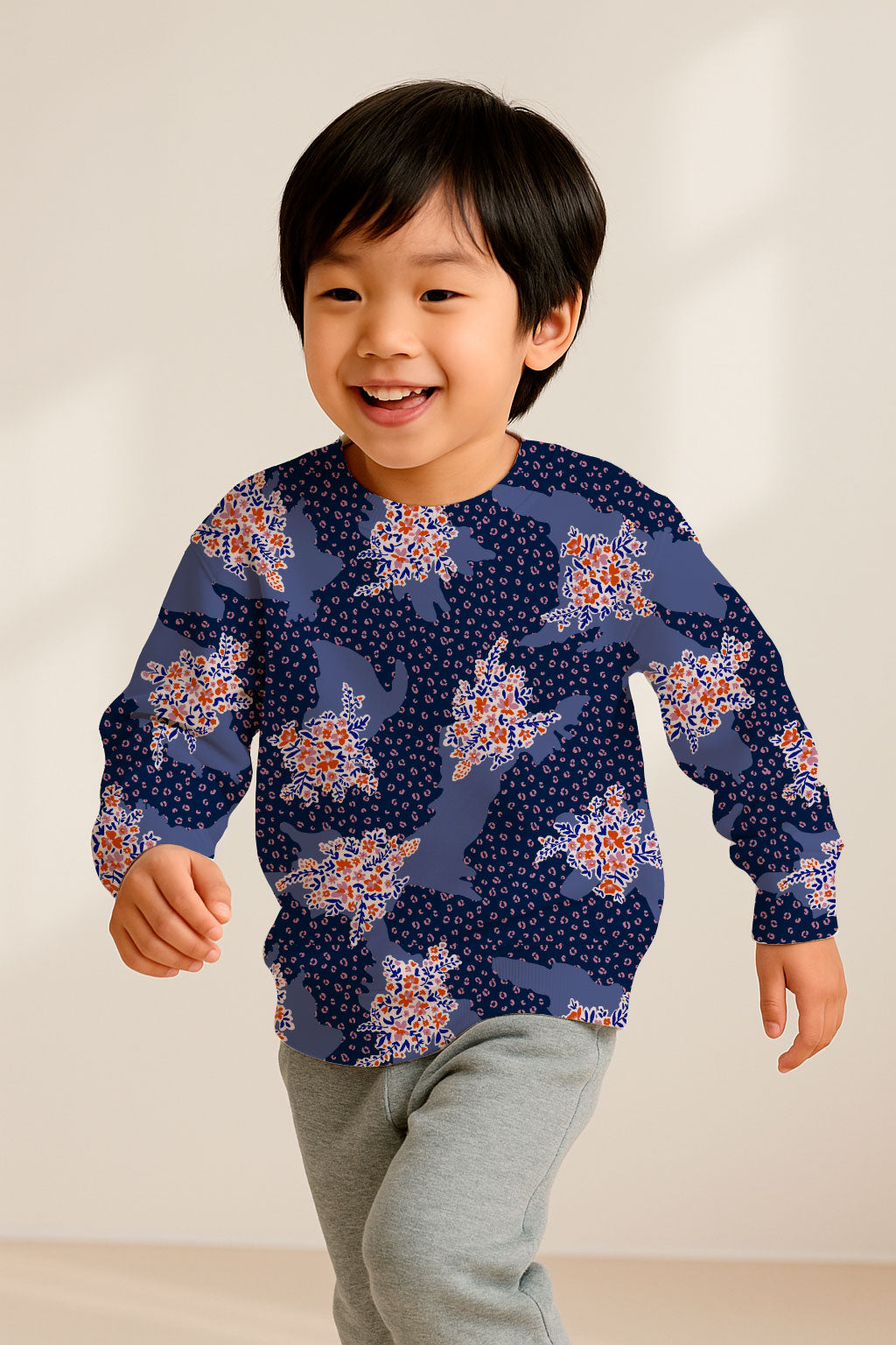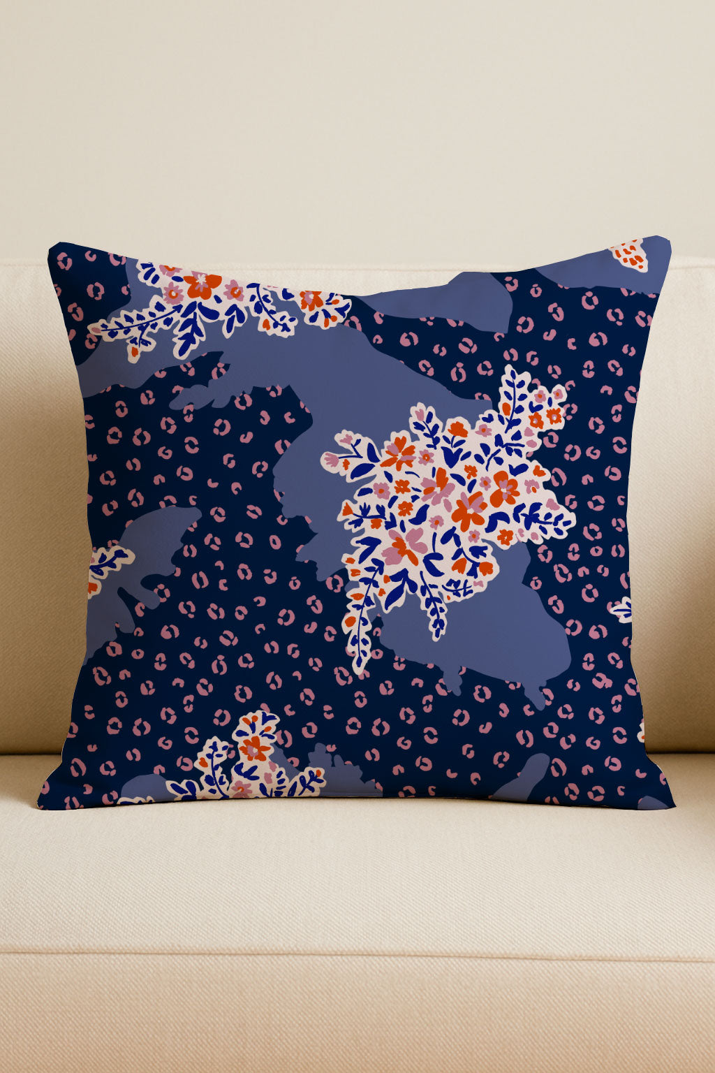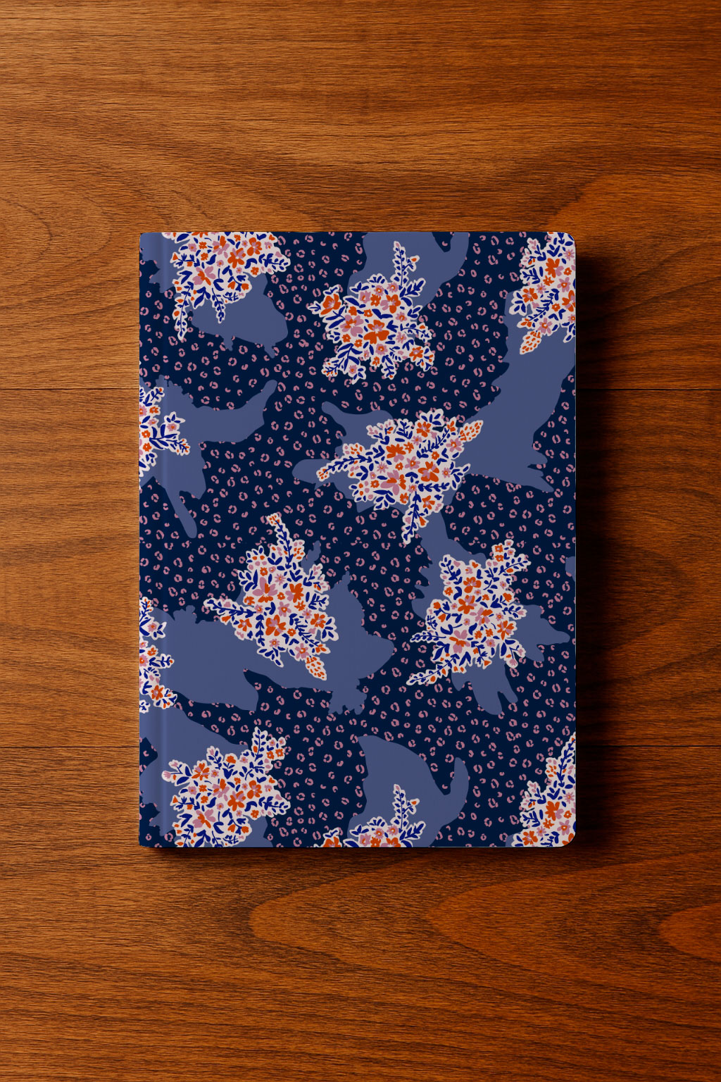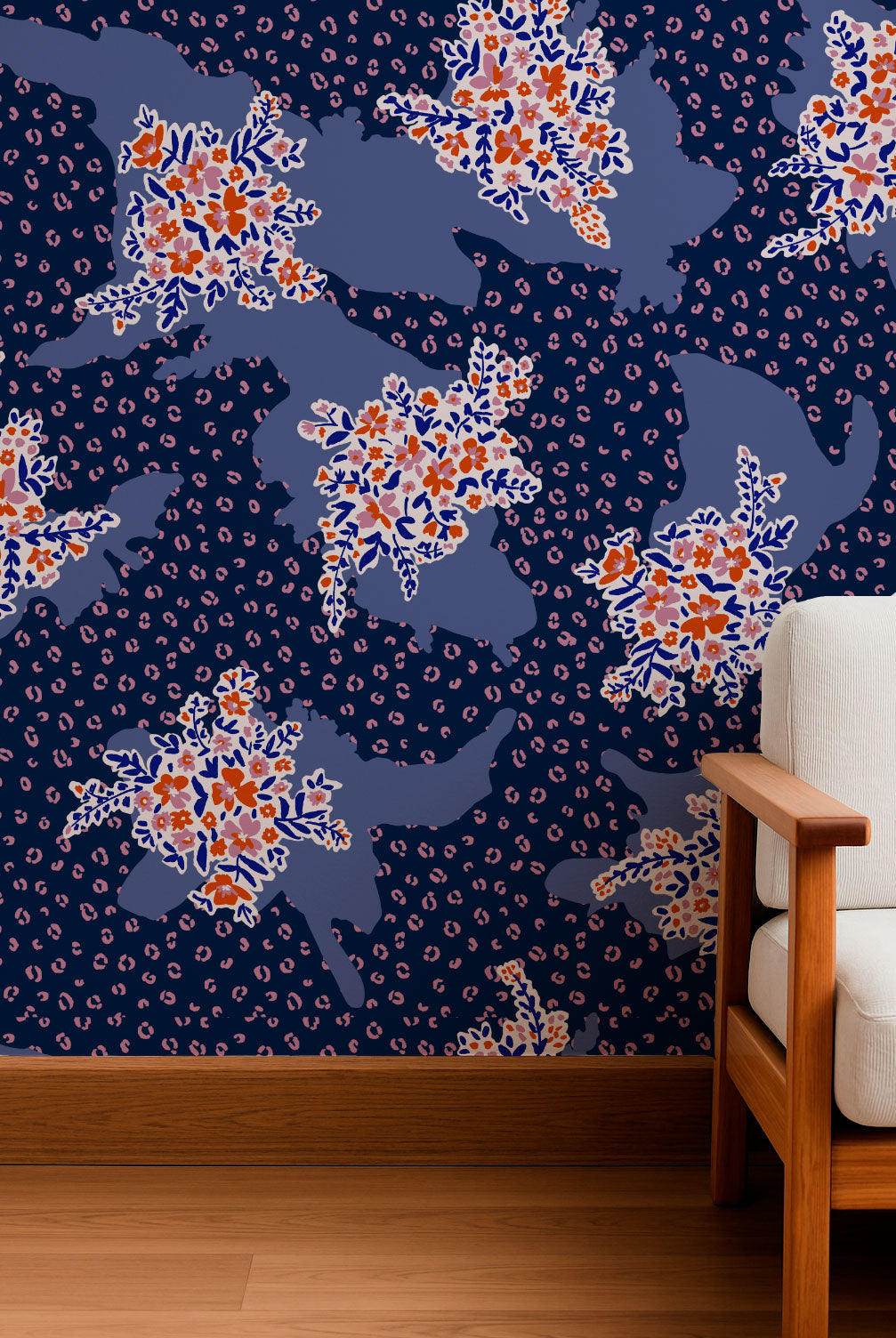 Ramos de flores sobre siluetas abstractas de animales azules sobre fondo azul marino. Gráfico y llamativo.