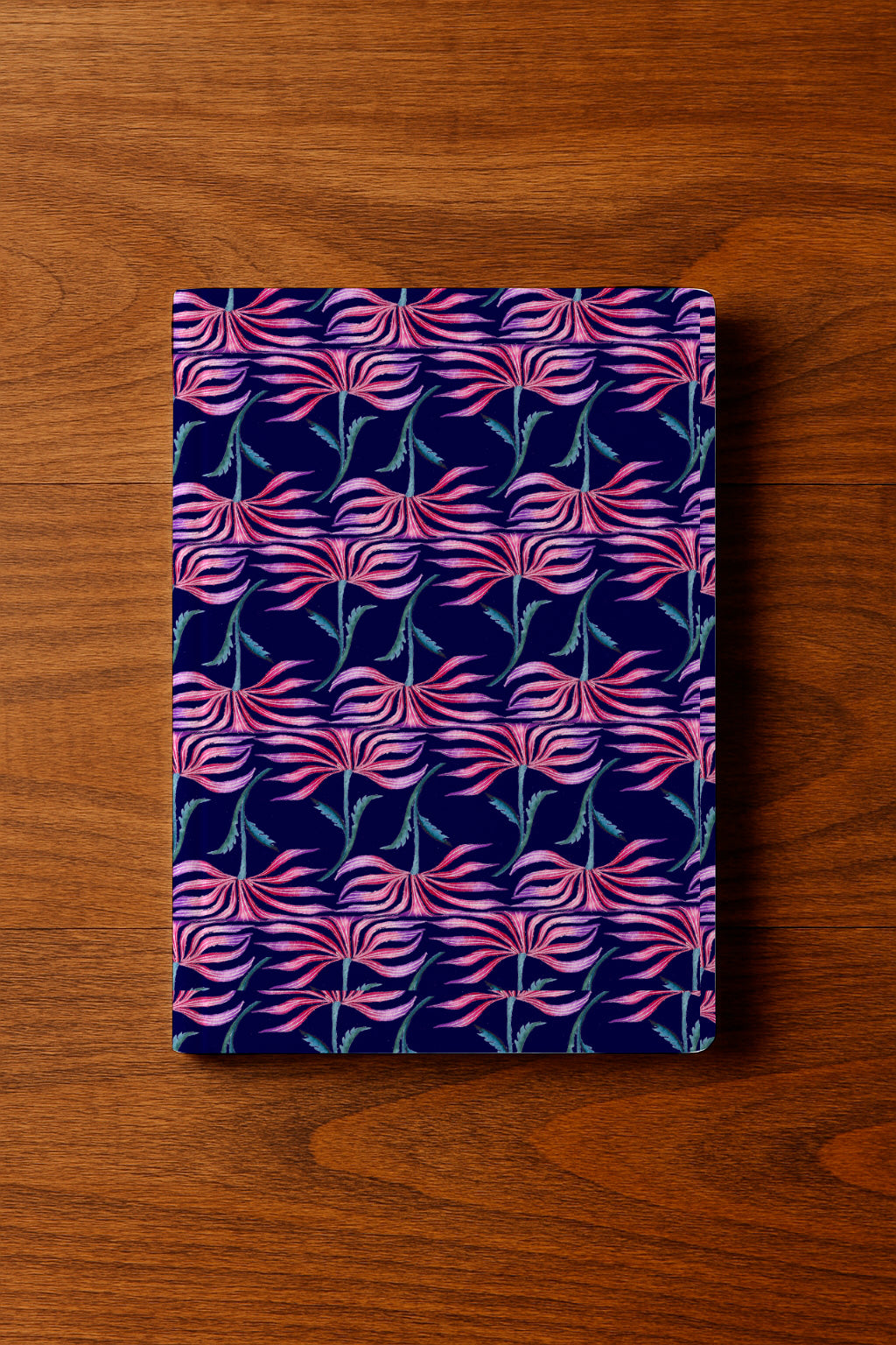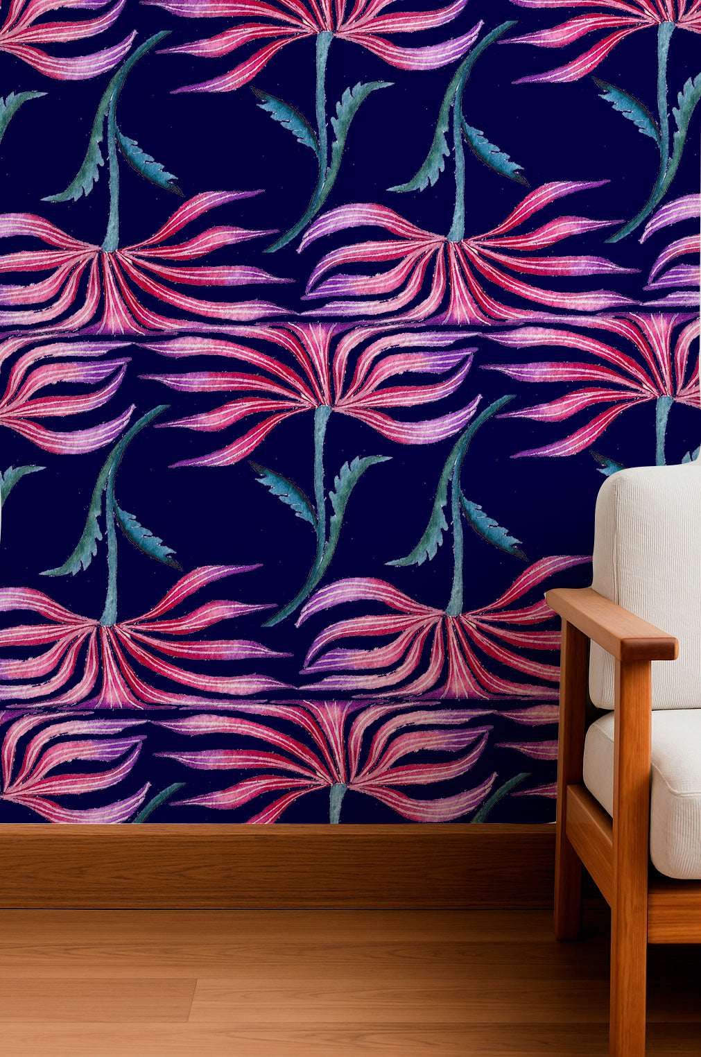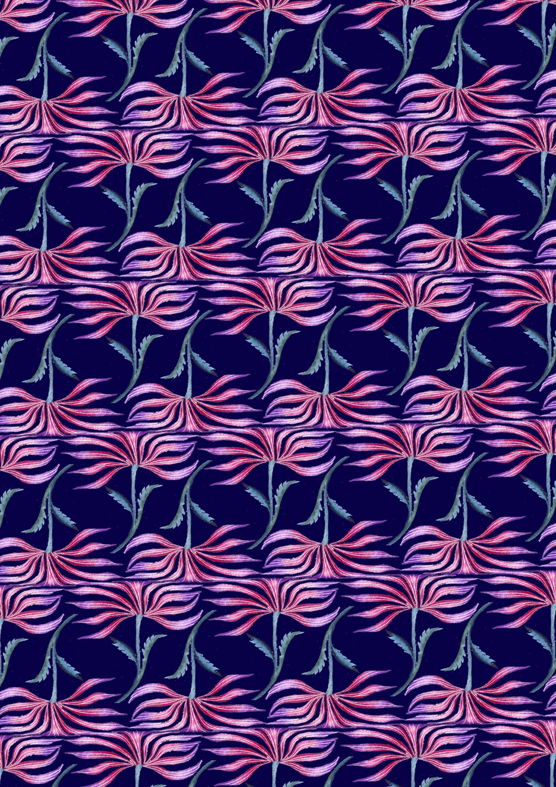 Orquídeas estilizadas rojas y rosas con largos pétalos ondulados sobre fondo oscuro. Una composición floral rítmica de elegante simetría.