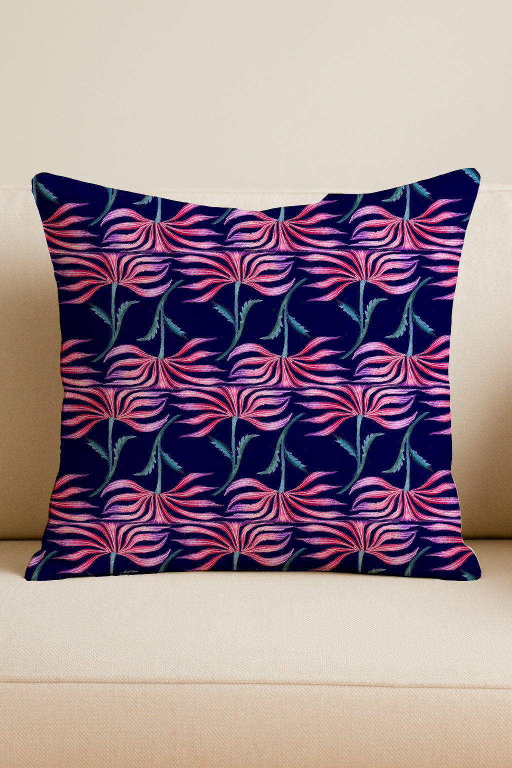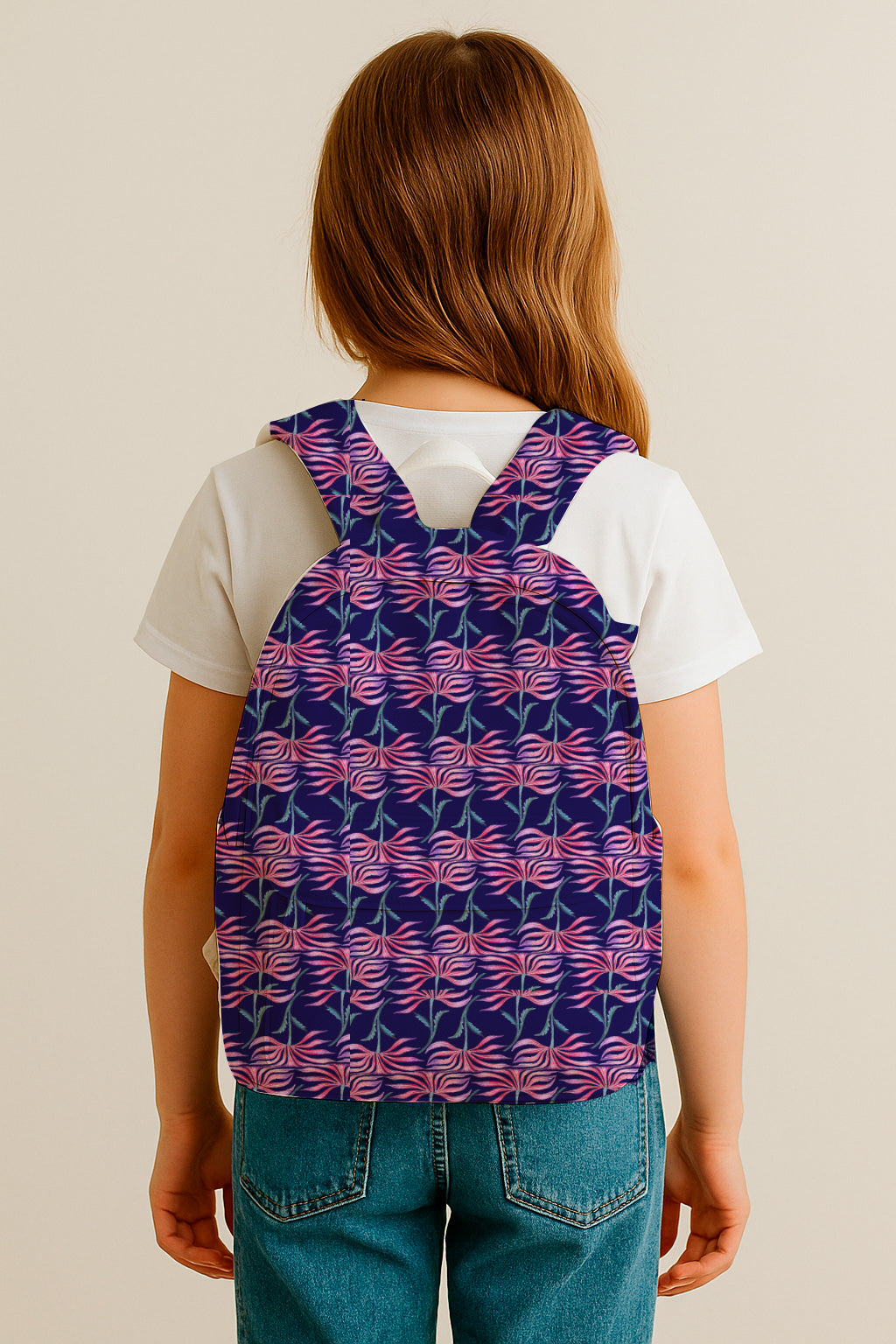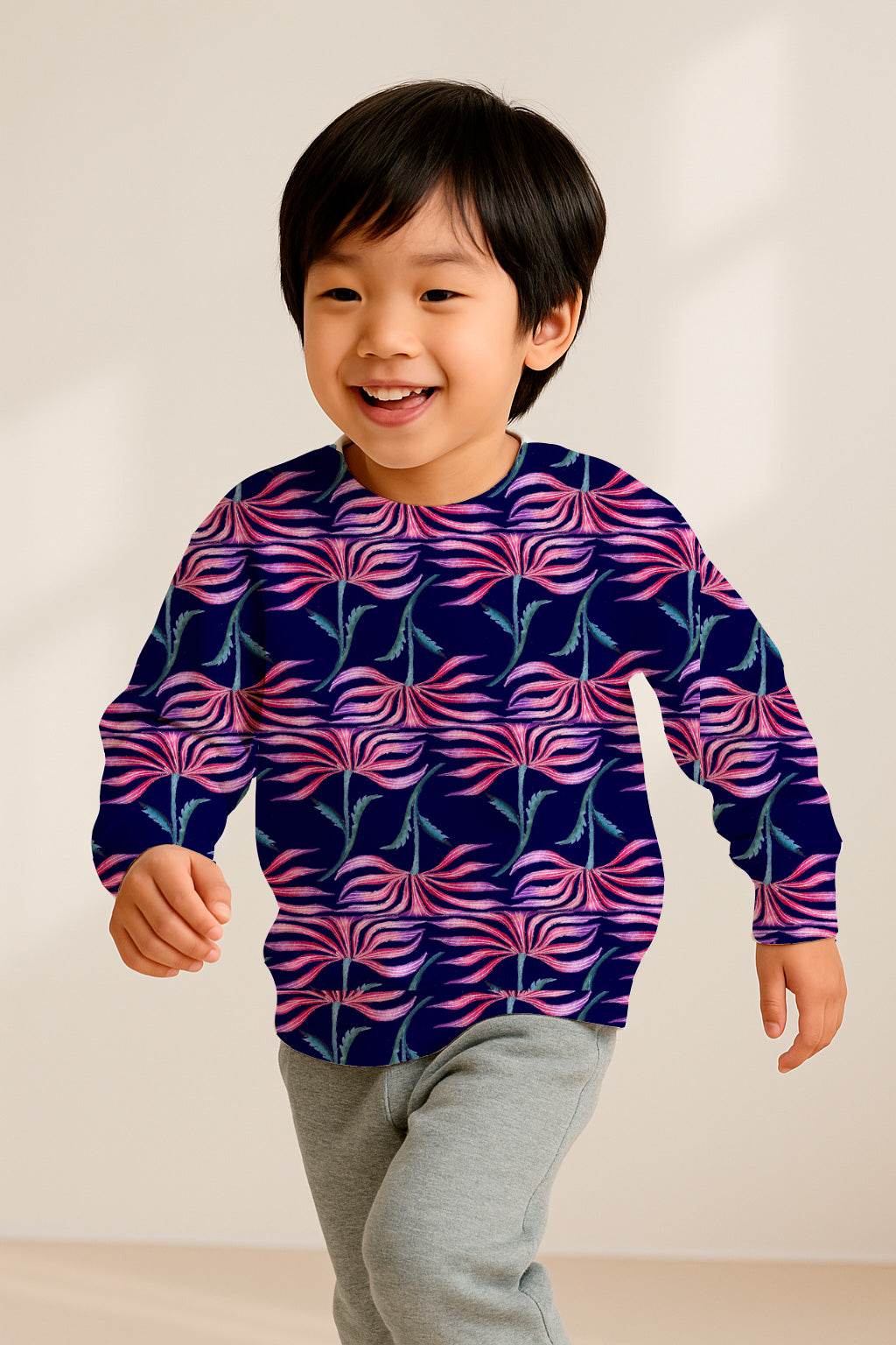 Orquídeas estilizadas rojas y rosas con largos pétalos ondulados sobre fondo oscuro. Una composición floral rítmica de elegante simetría.
