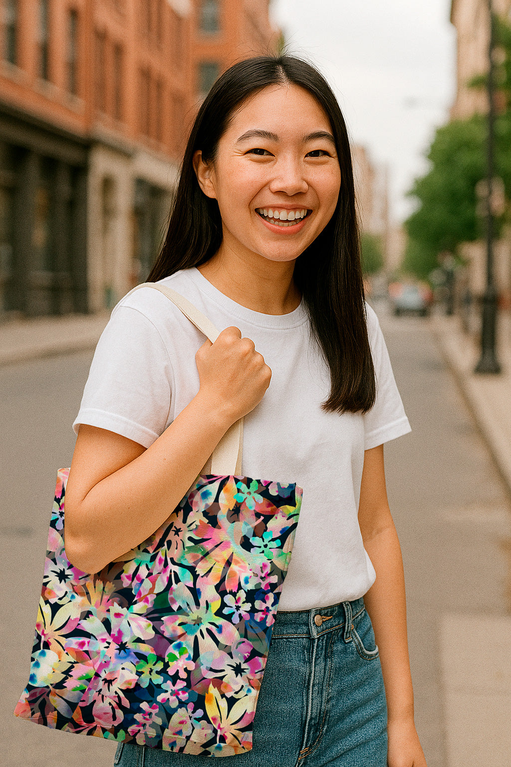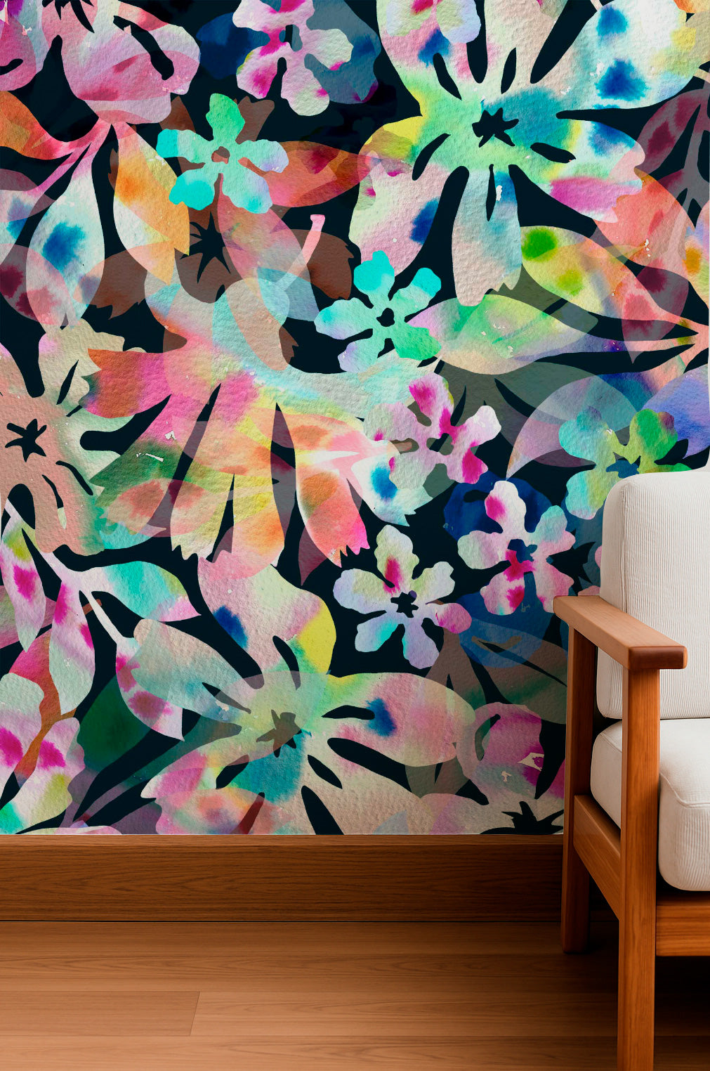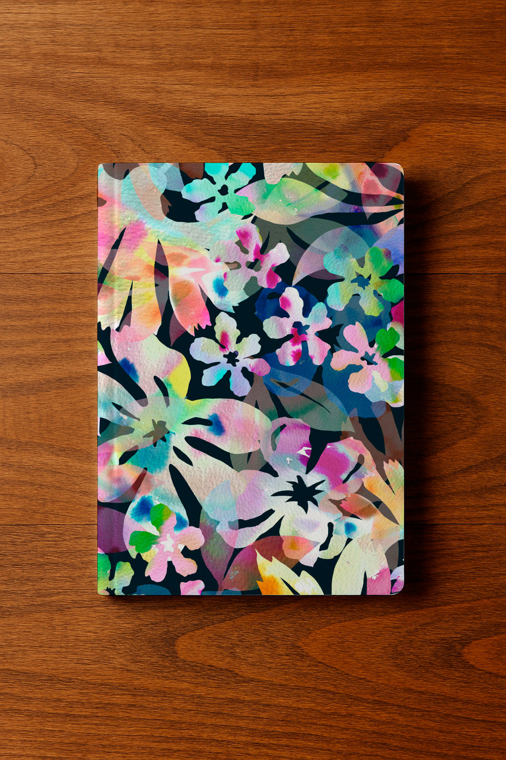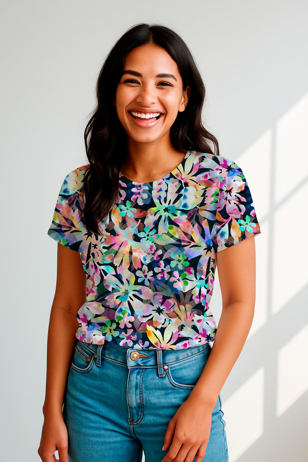 Un delicado estampado floral con transparencias de acuarela y colores vibrantes. Ideal para moda, accesorios o artículos para el hogar con un toque fresco y artístico.