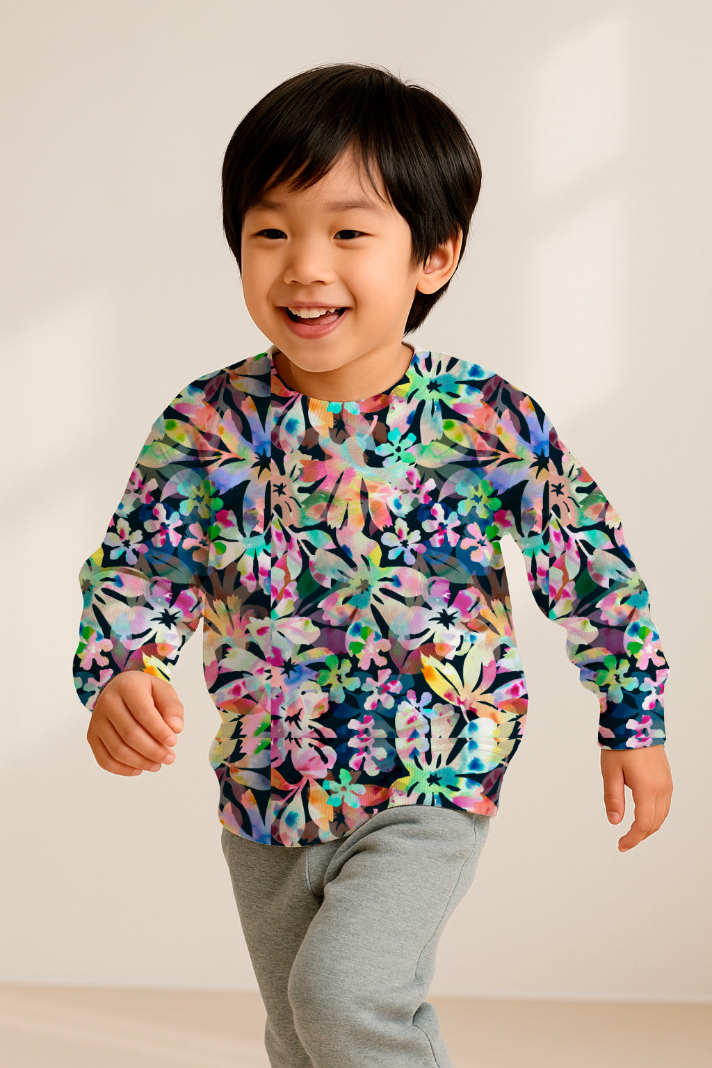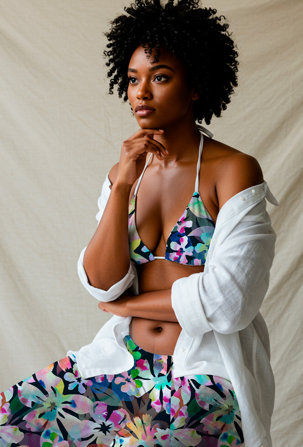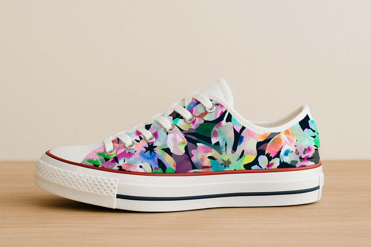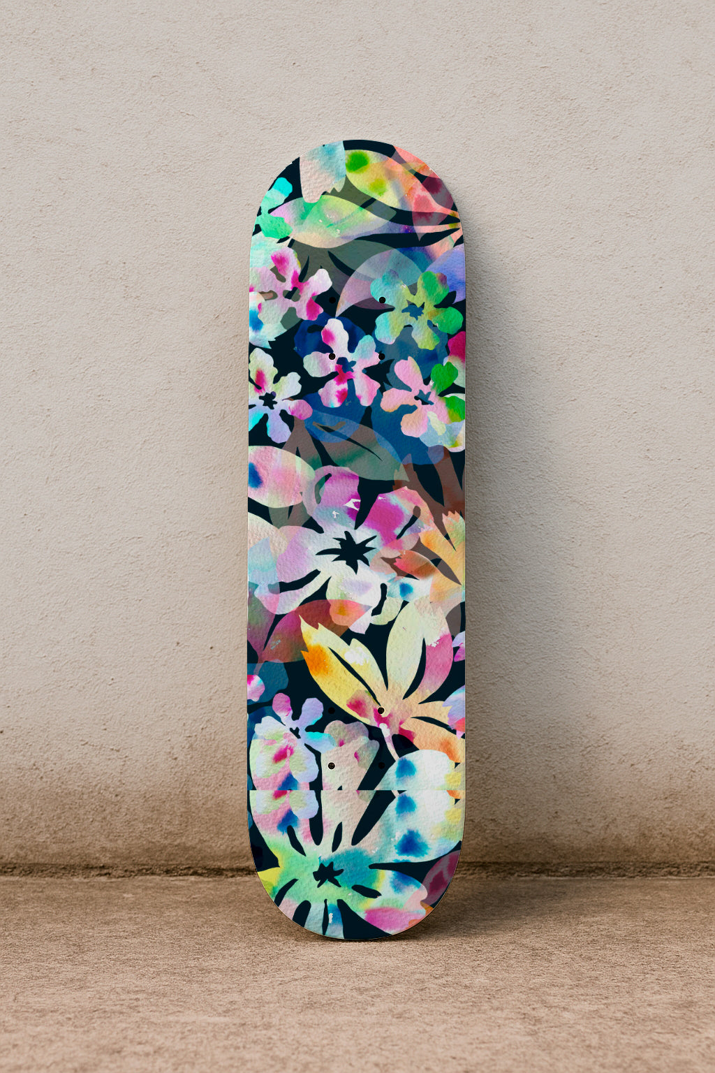 Un delicado estampado floral con transparencias de acuarela y colores vibrantes. Ideal para moda, accesorios o artículos para el hogar con un toque fresco y artístico.