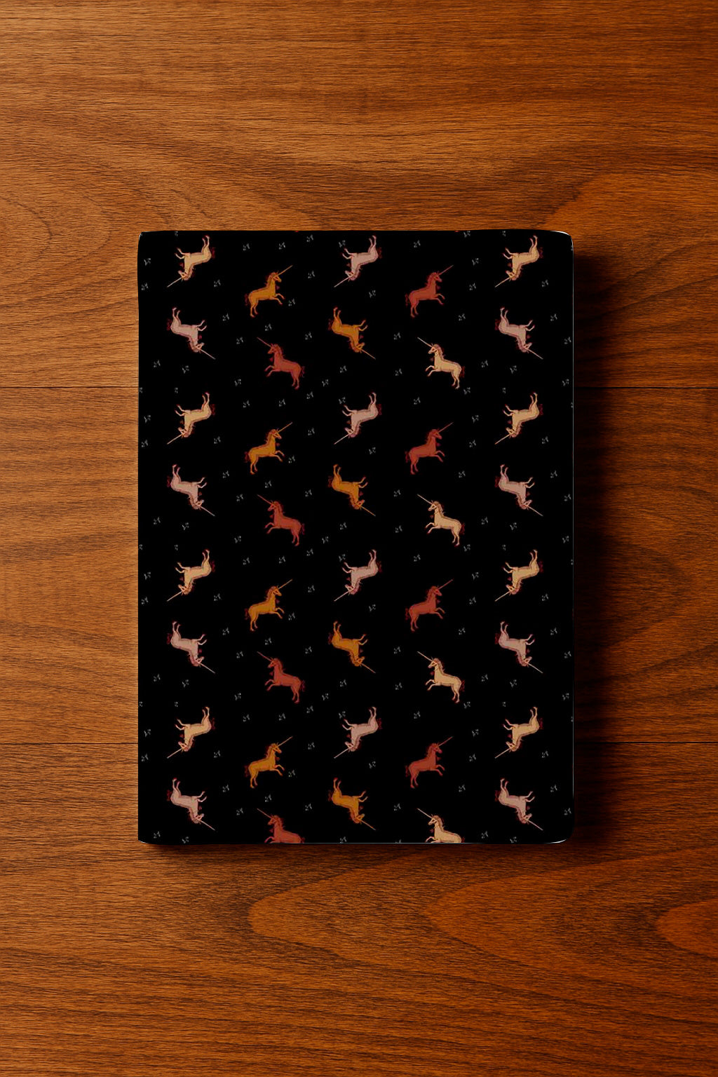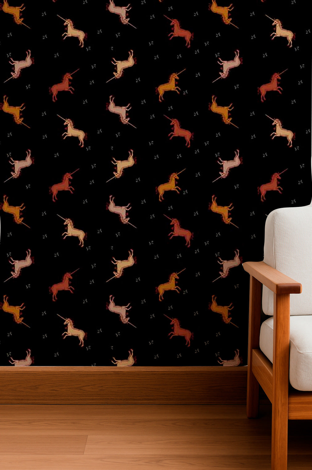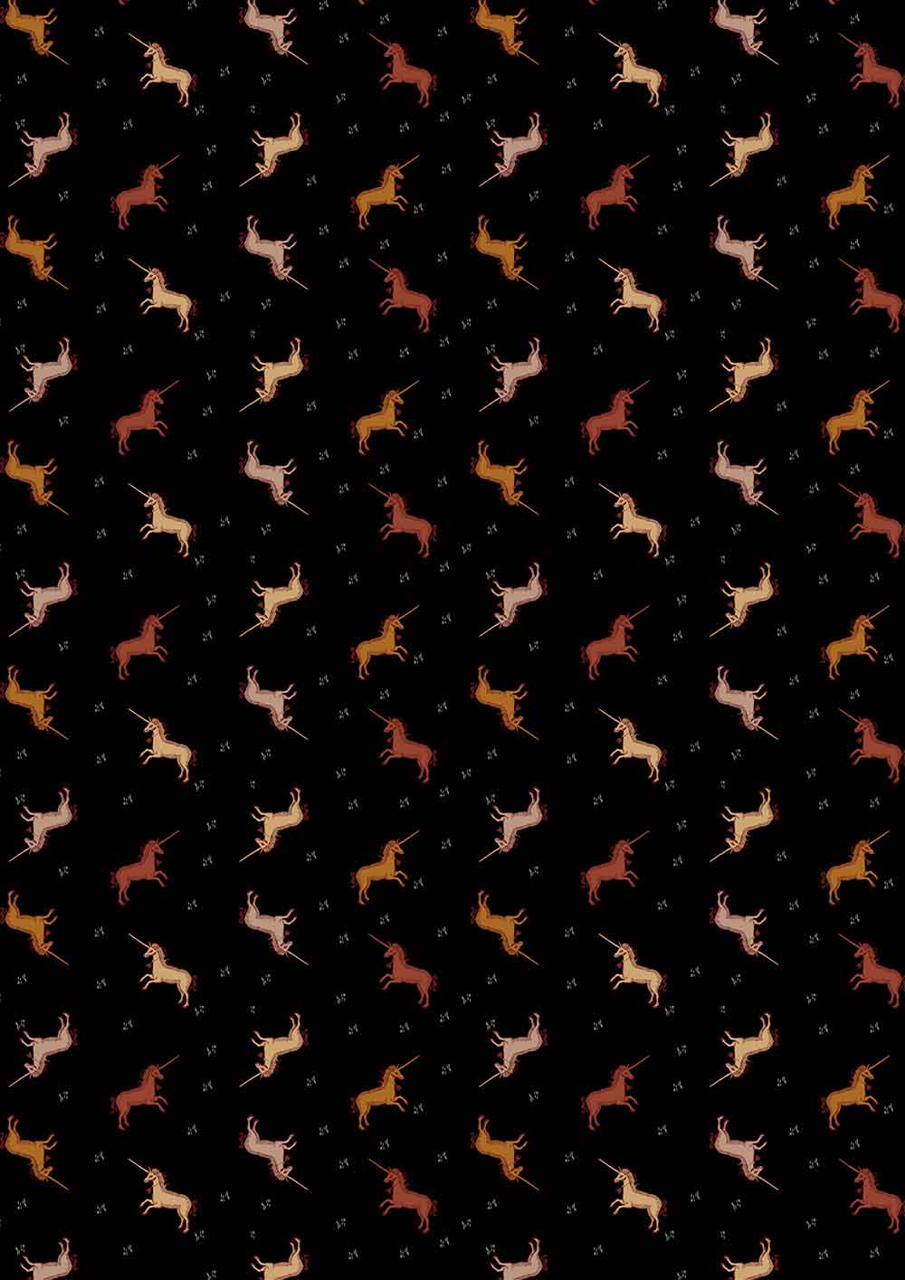 Siluetas de unicornios repetidas en cálidos tonos tierra retozan sobre un fondo negro azabache con pequeñas estrellas.