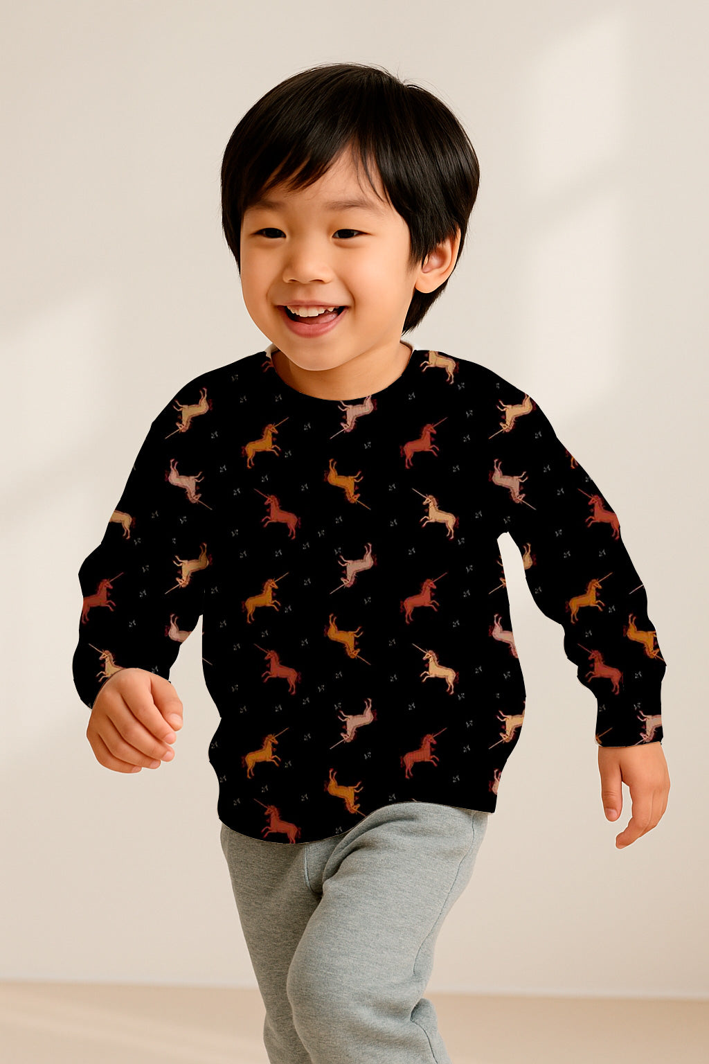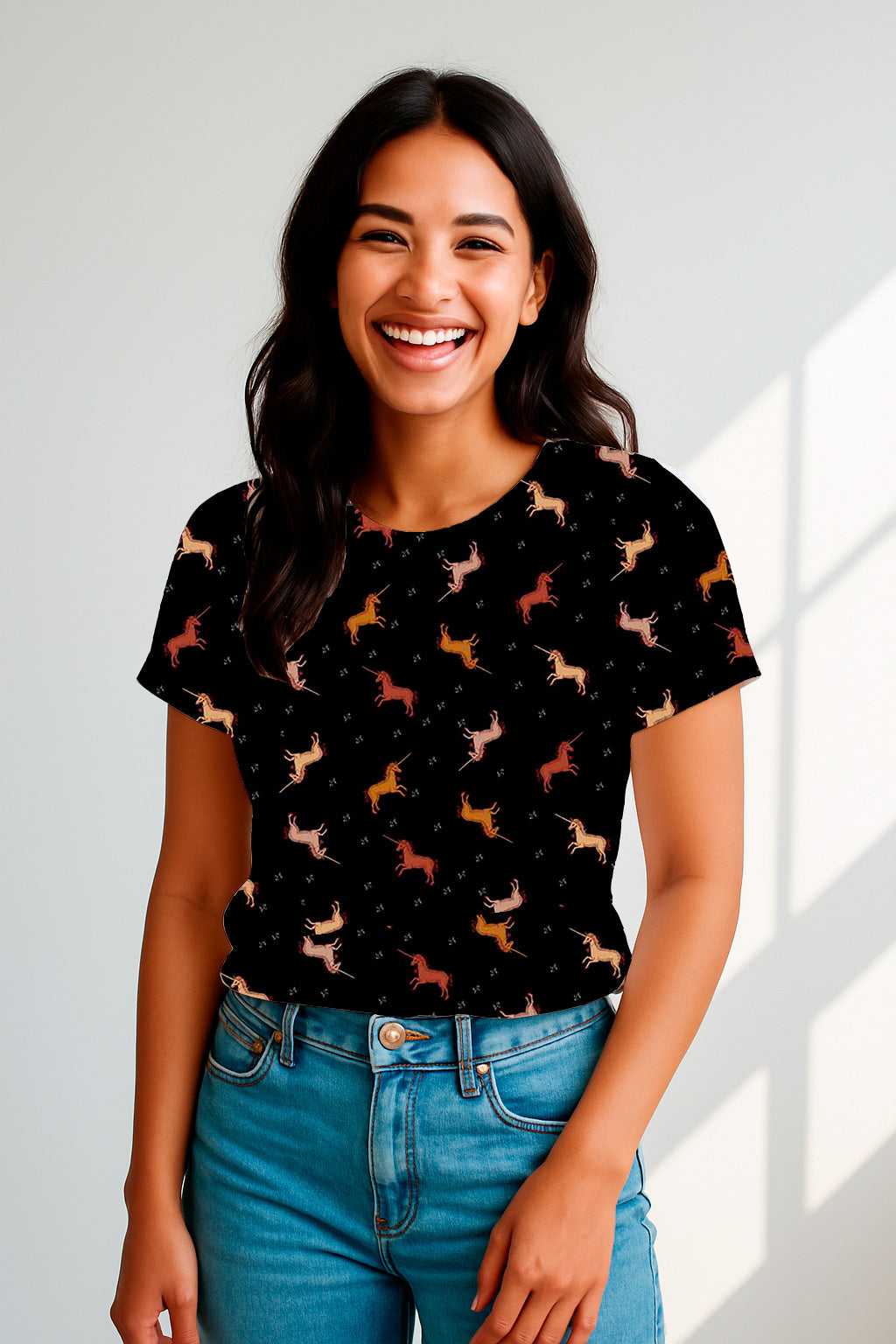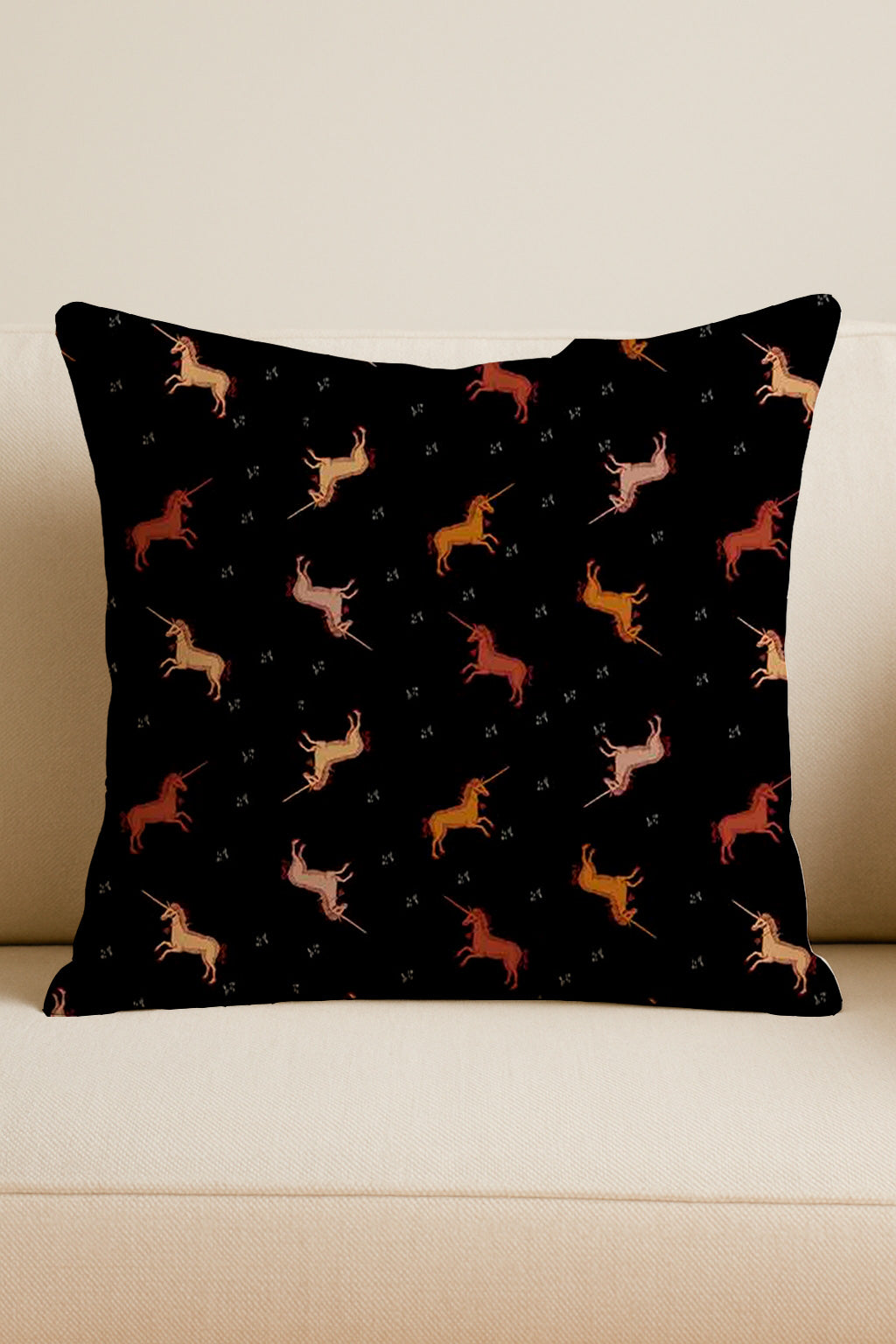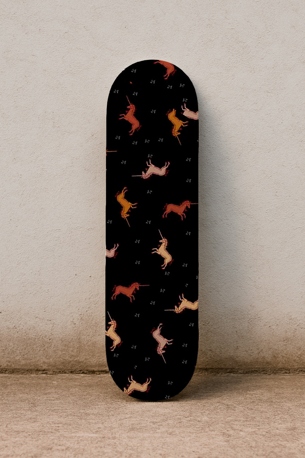 Siluetas de unicornios repetidas en cálidos tonos tierra retozan sobre un fondo negro azabache con pequeñas estrellas.