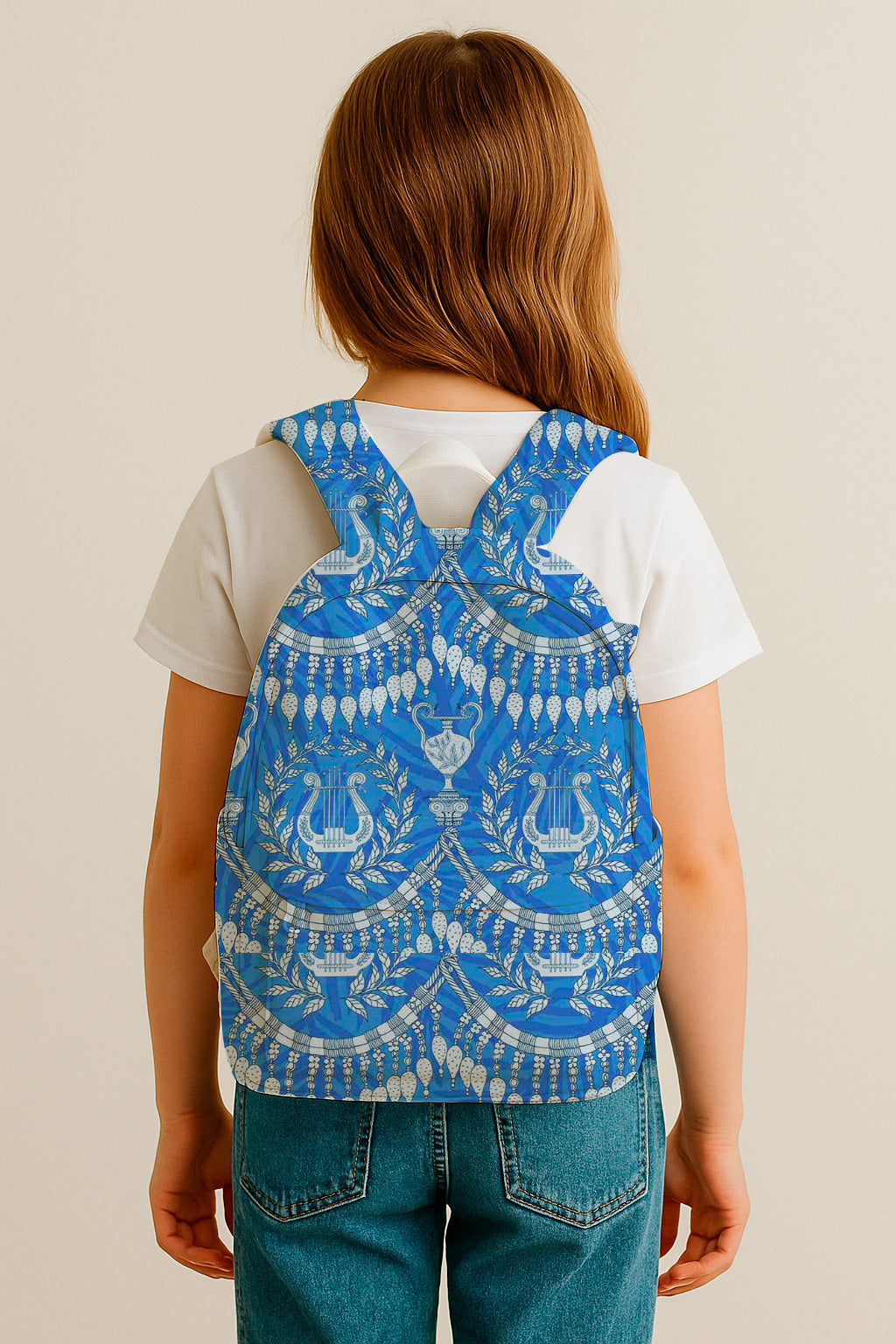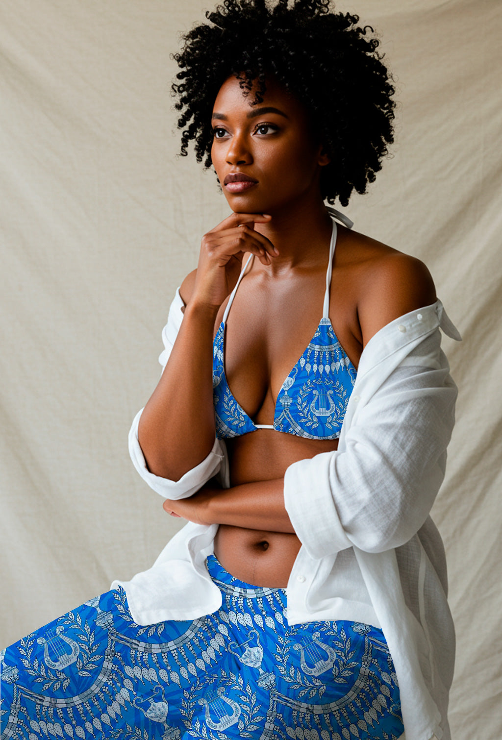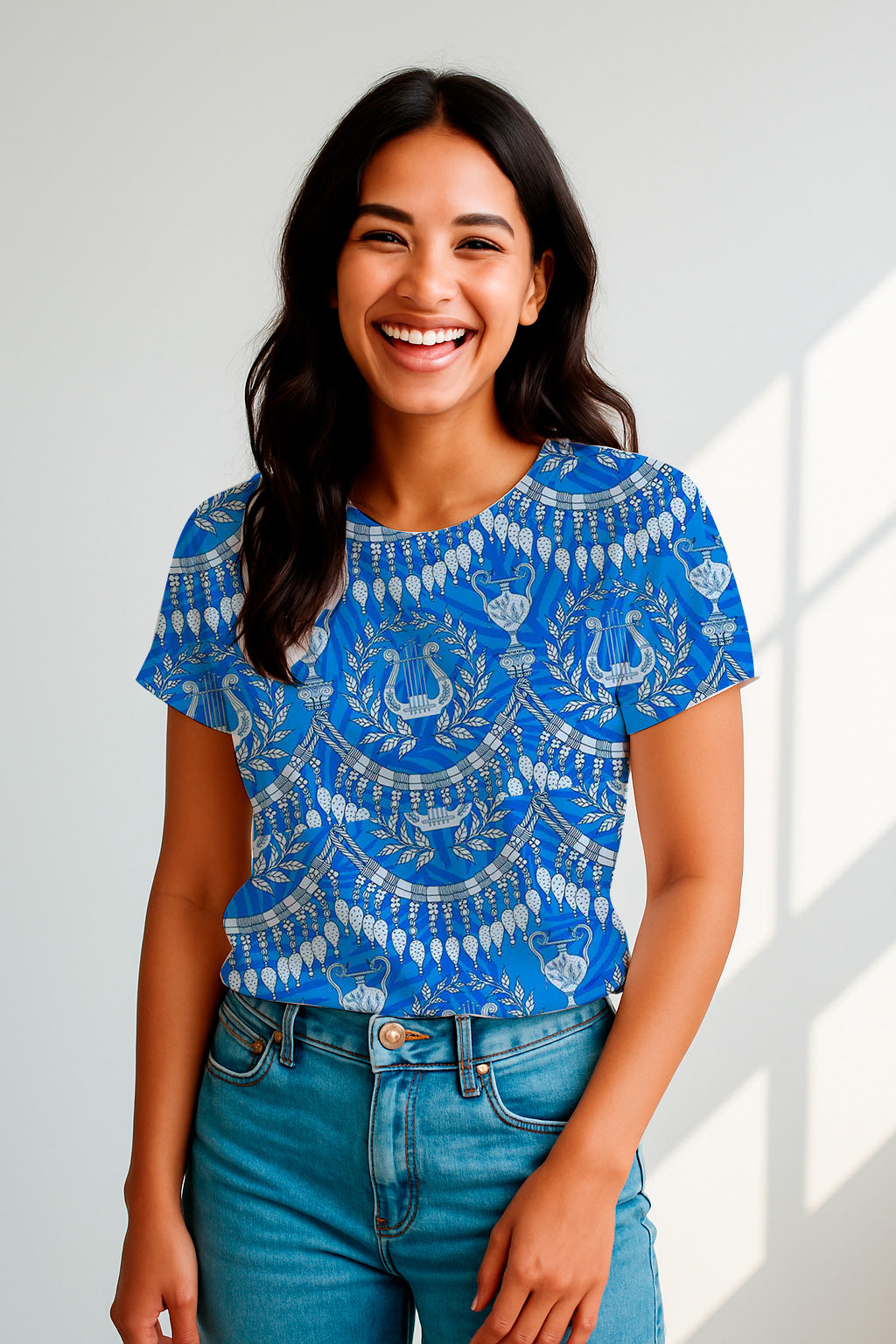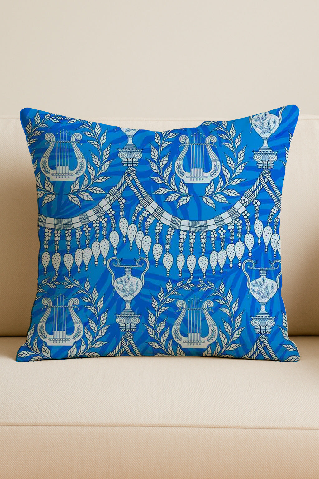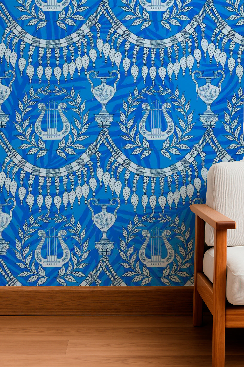 Liras regias y guirnaldas ornamentales blancas contrastan con un azul vibrante, creando un ritmo neoclásico.