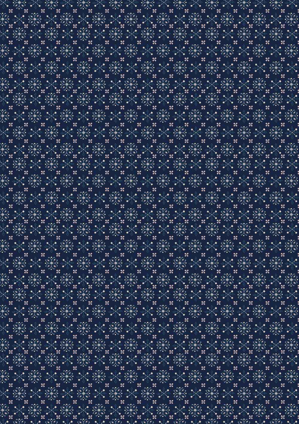 Pequeñas estrellas y puntos forman intrincadas figuras geométricas sobre un fondo azul marino, evocando motivos textiles.