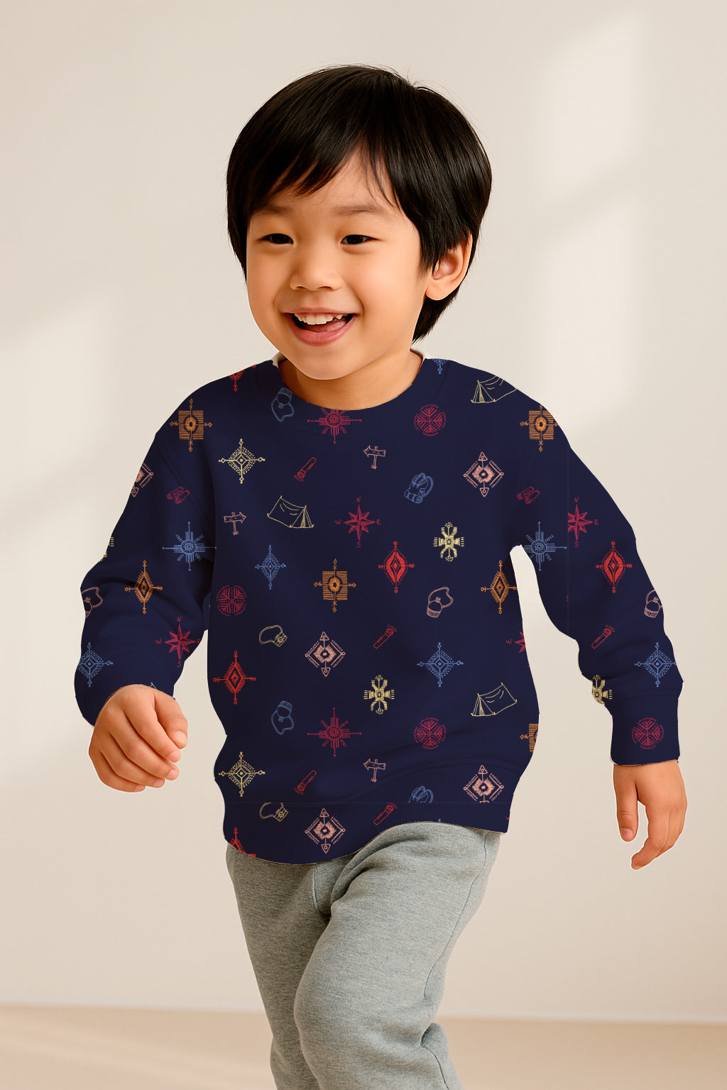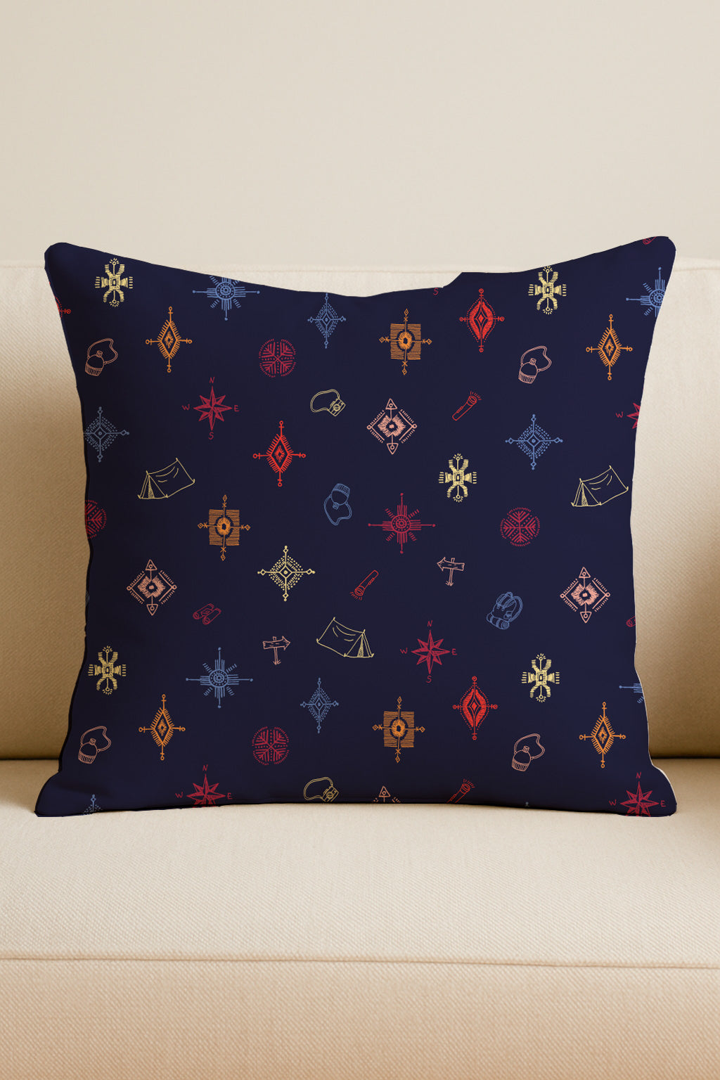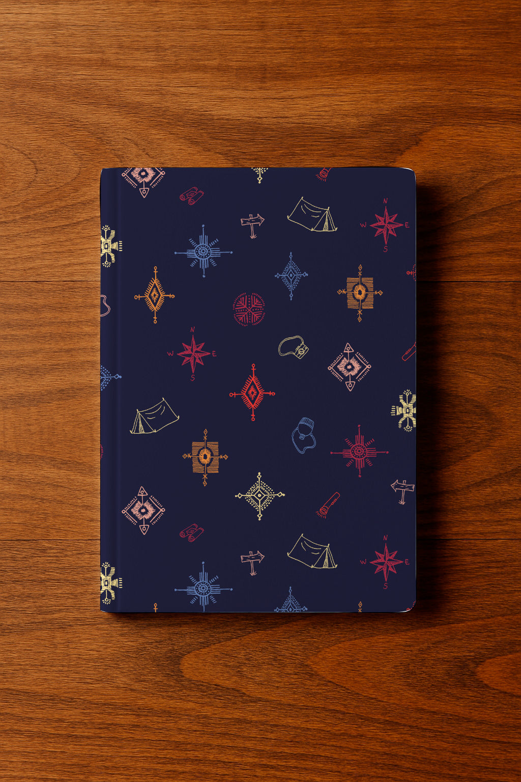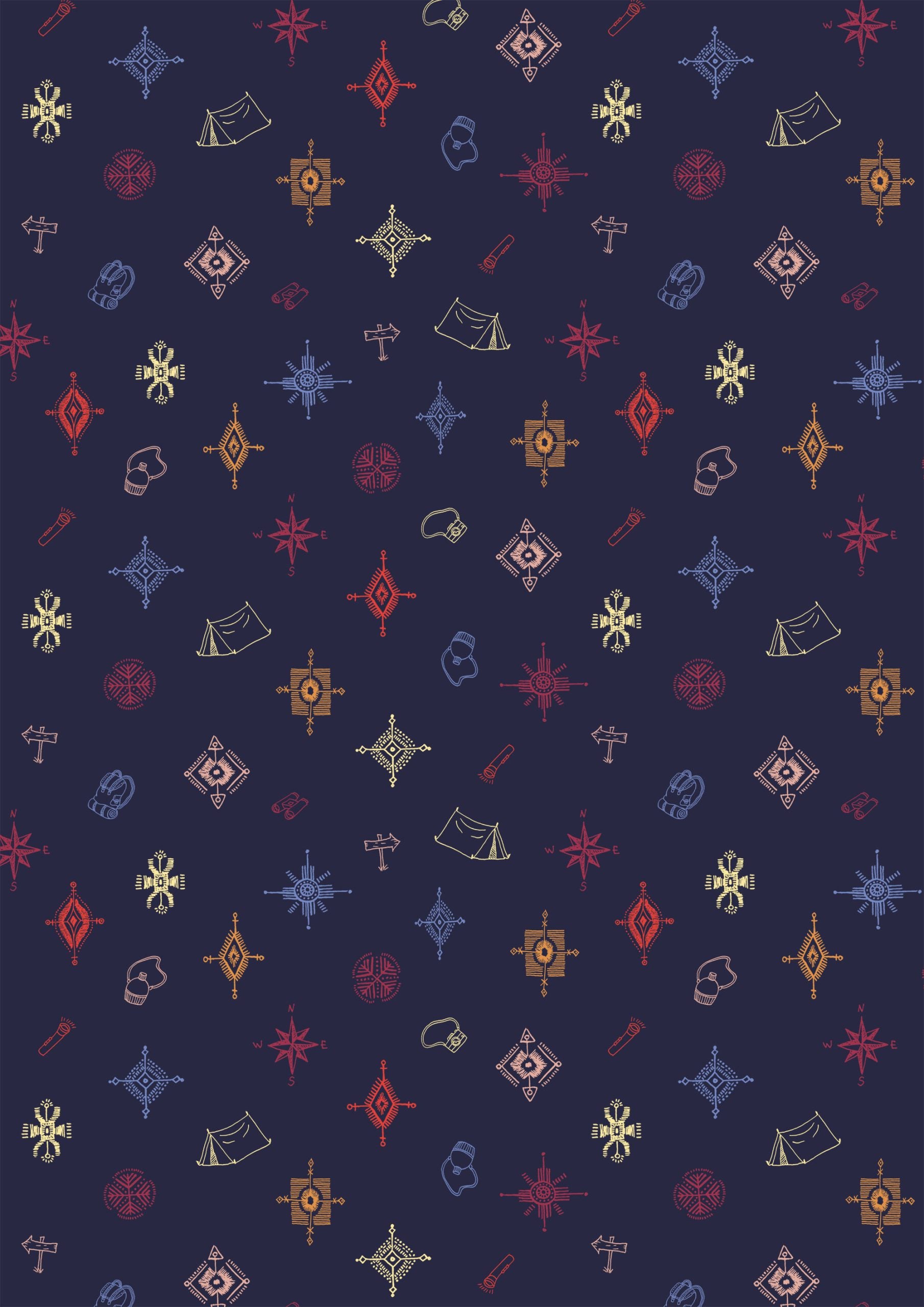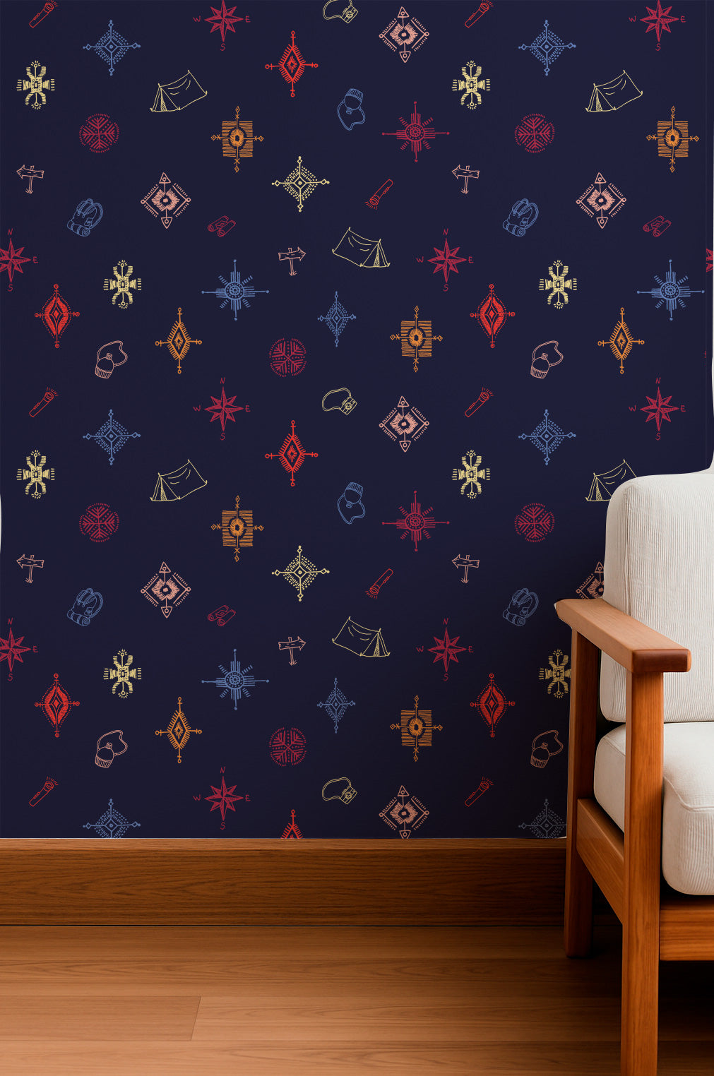 Estampado inspirado en la aventura con tiendas de campaña, brújulas, antorchas y formas geométricas abstractas en rojo, amarillo, azul y blanco sobre azul marino.