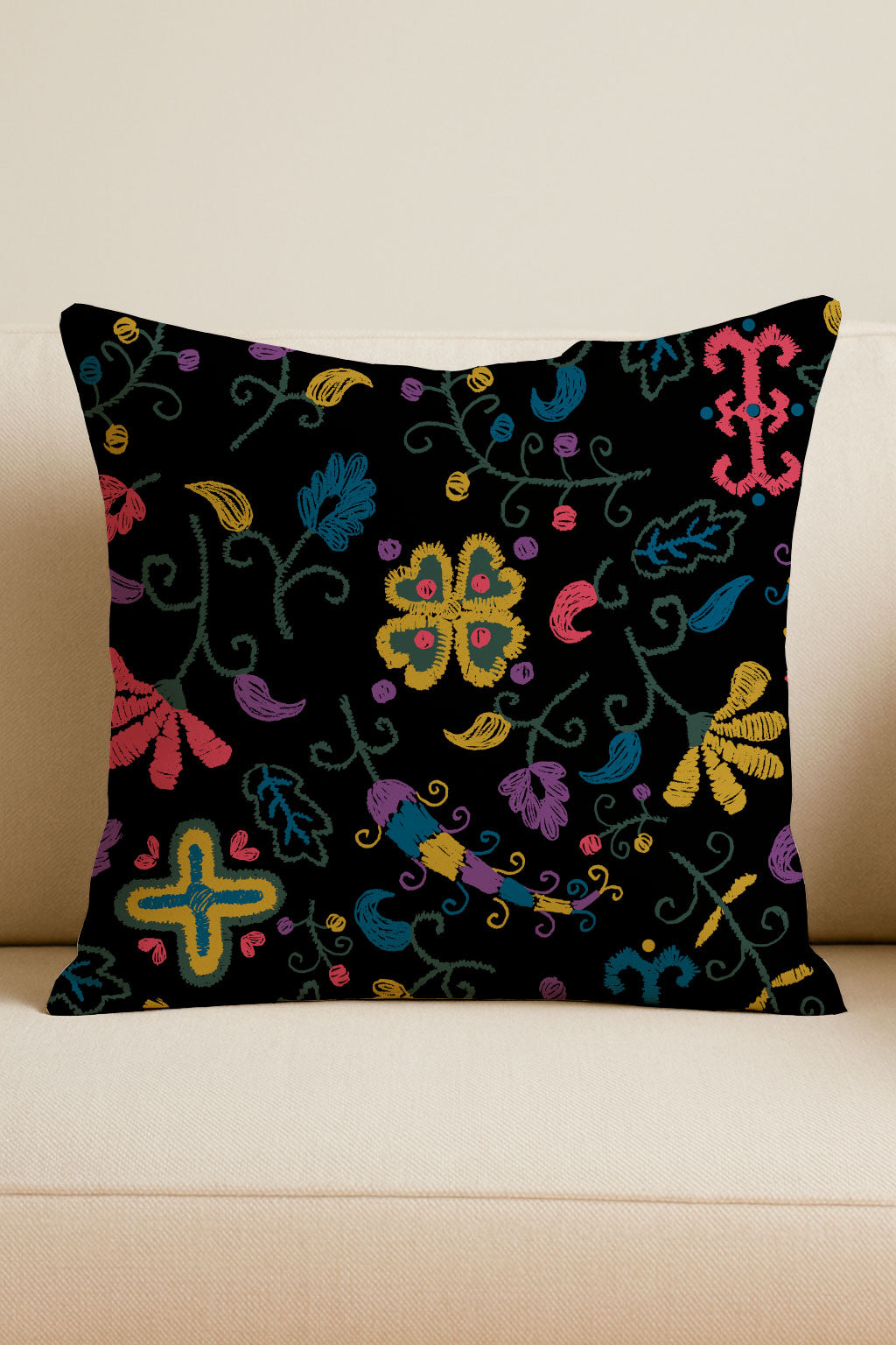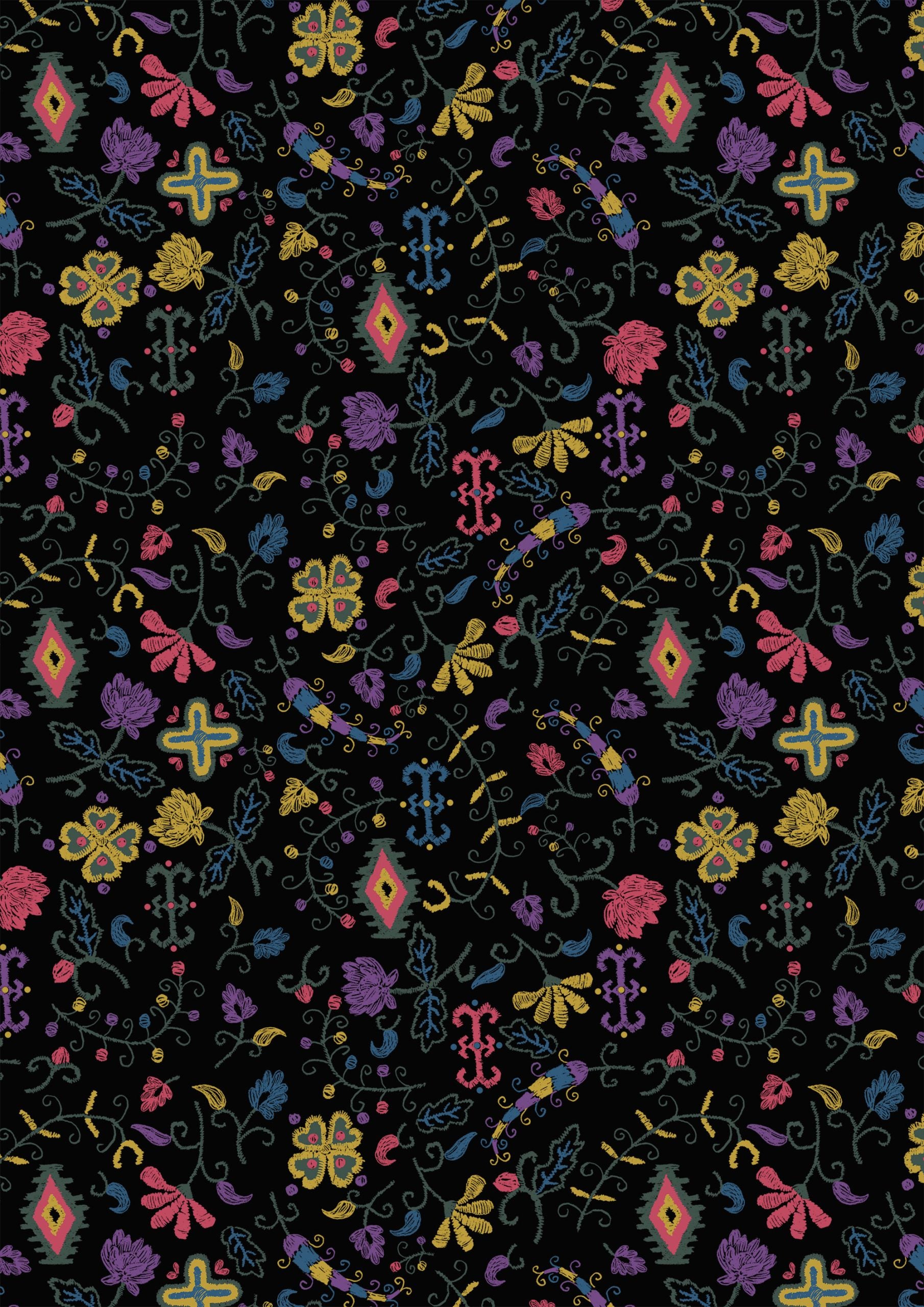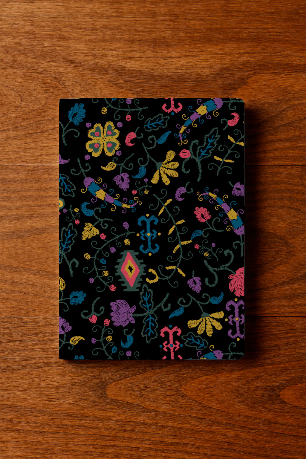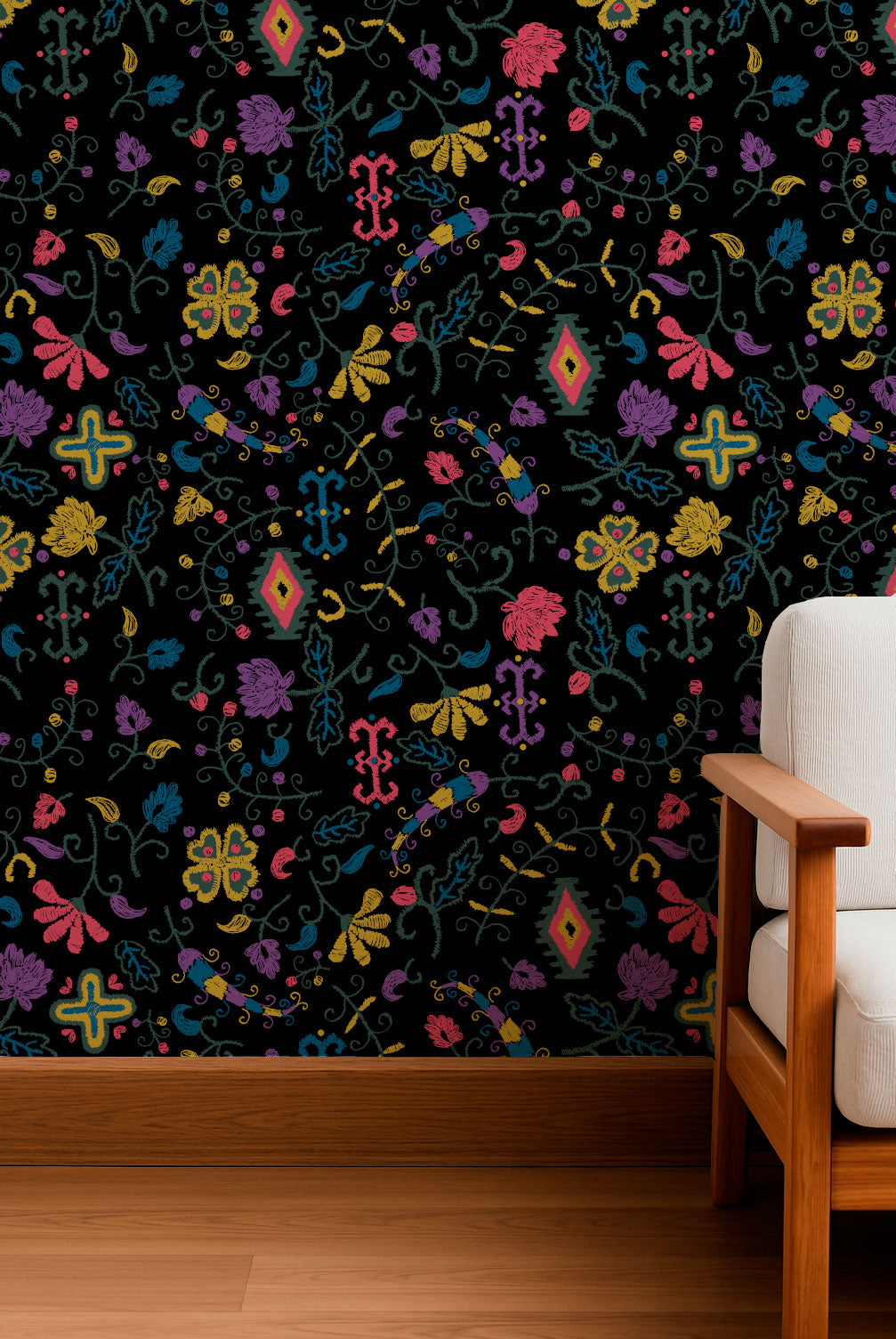 Motivos bordados eclécticos en colores vivos sobre fondo negro. Ideal para textiles de estilo bohemio y étnico.