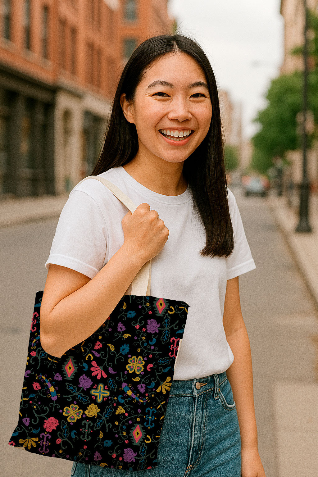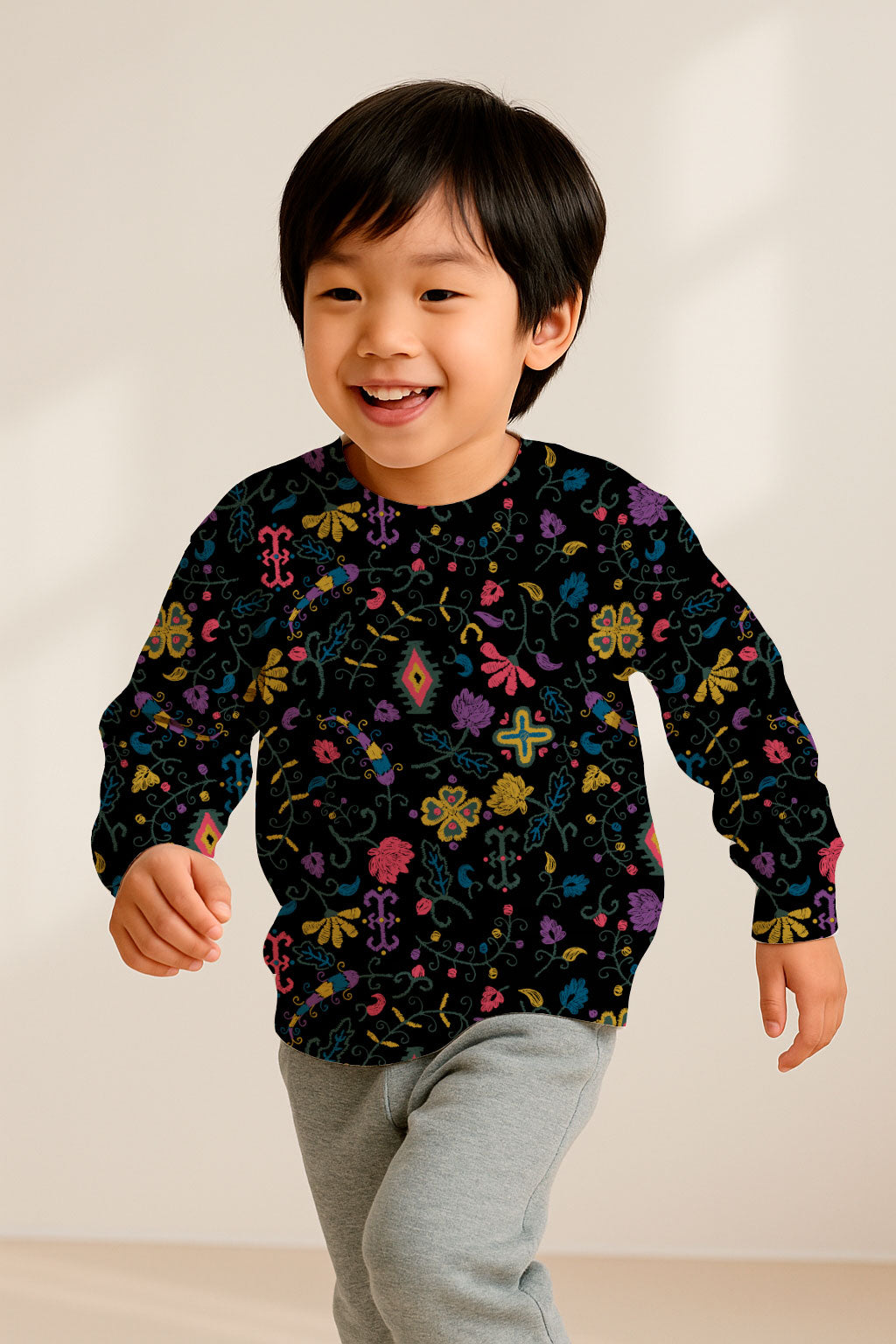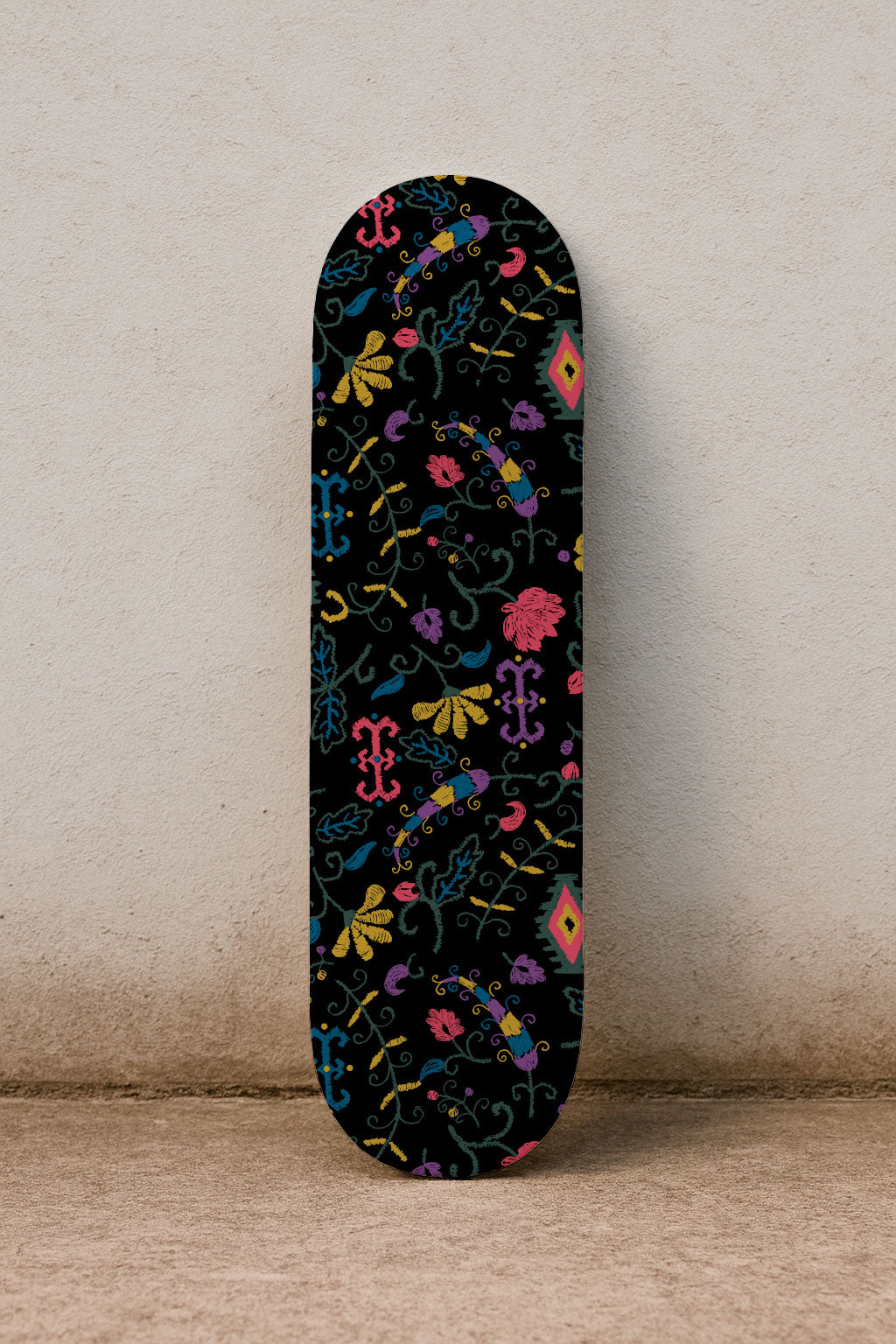 Motivos bordados eclécticos en colores vivos sobre fondo negro. Ideal para textiles de estilo bohemio y étnico.