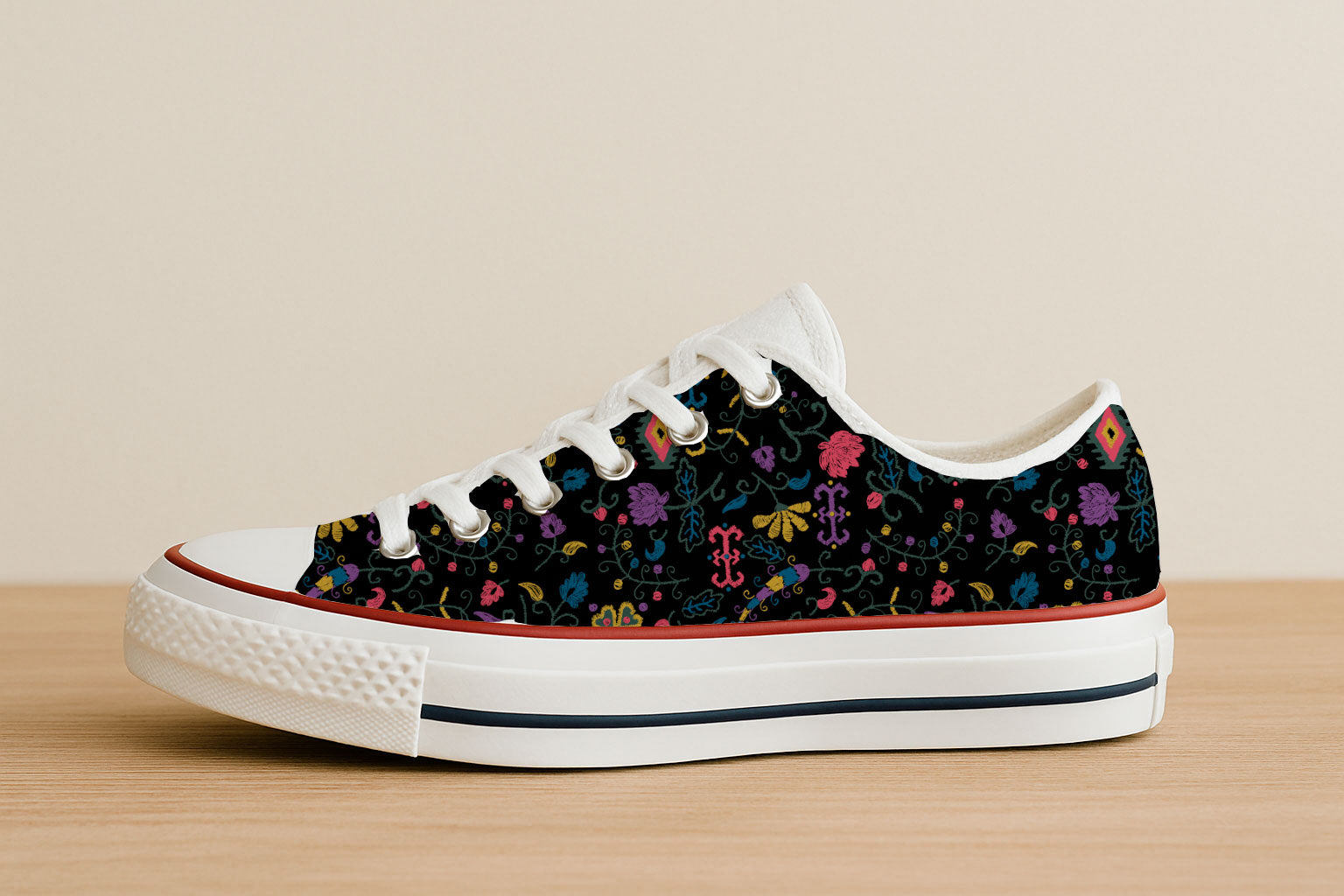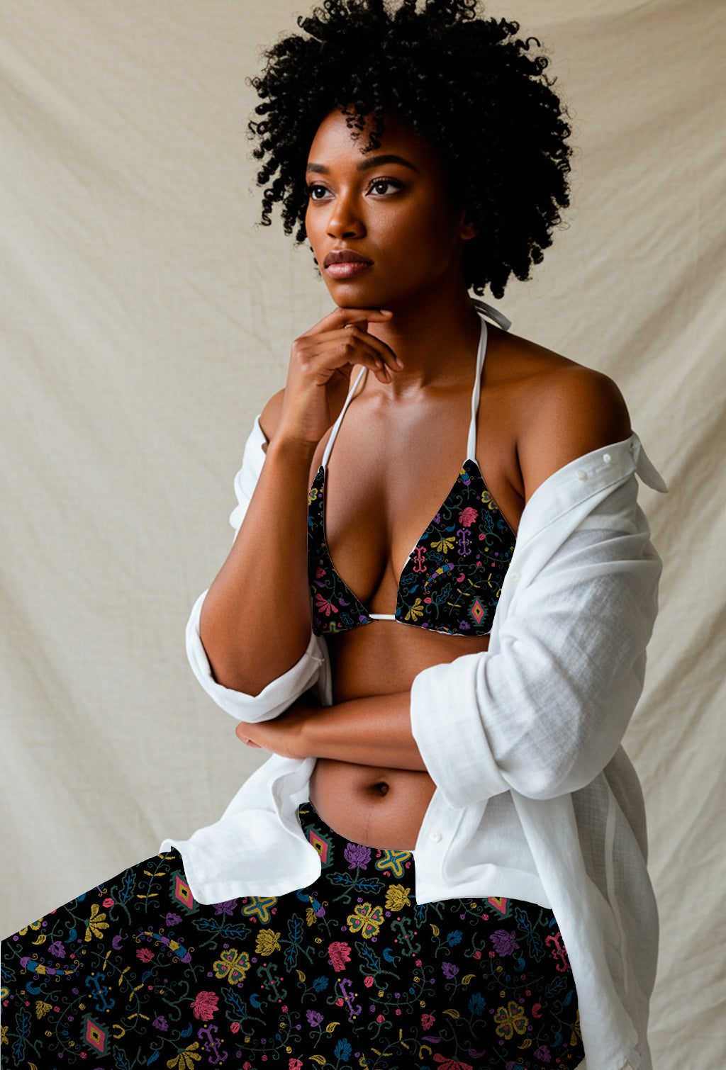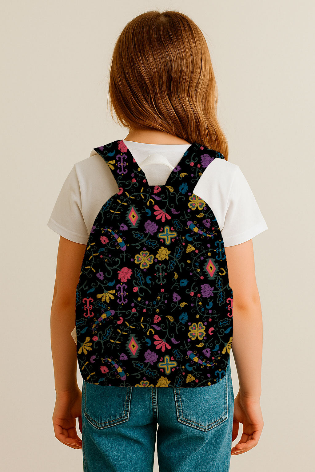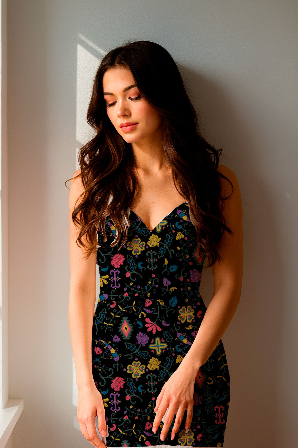 Motivos bordados eclécticos en colores vivos sobre fondo negro. Ideal para textiles de estilo bohemio y étnico.