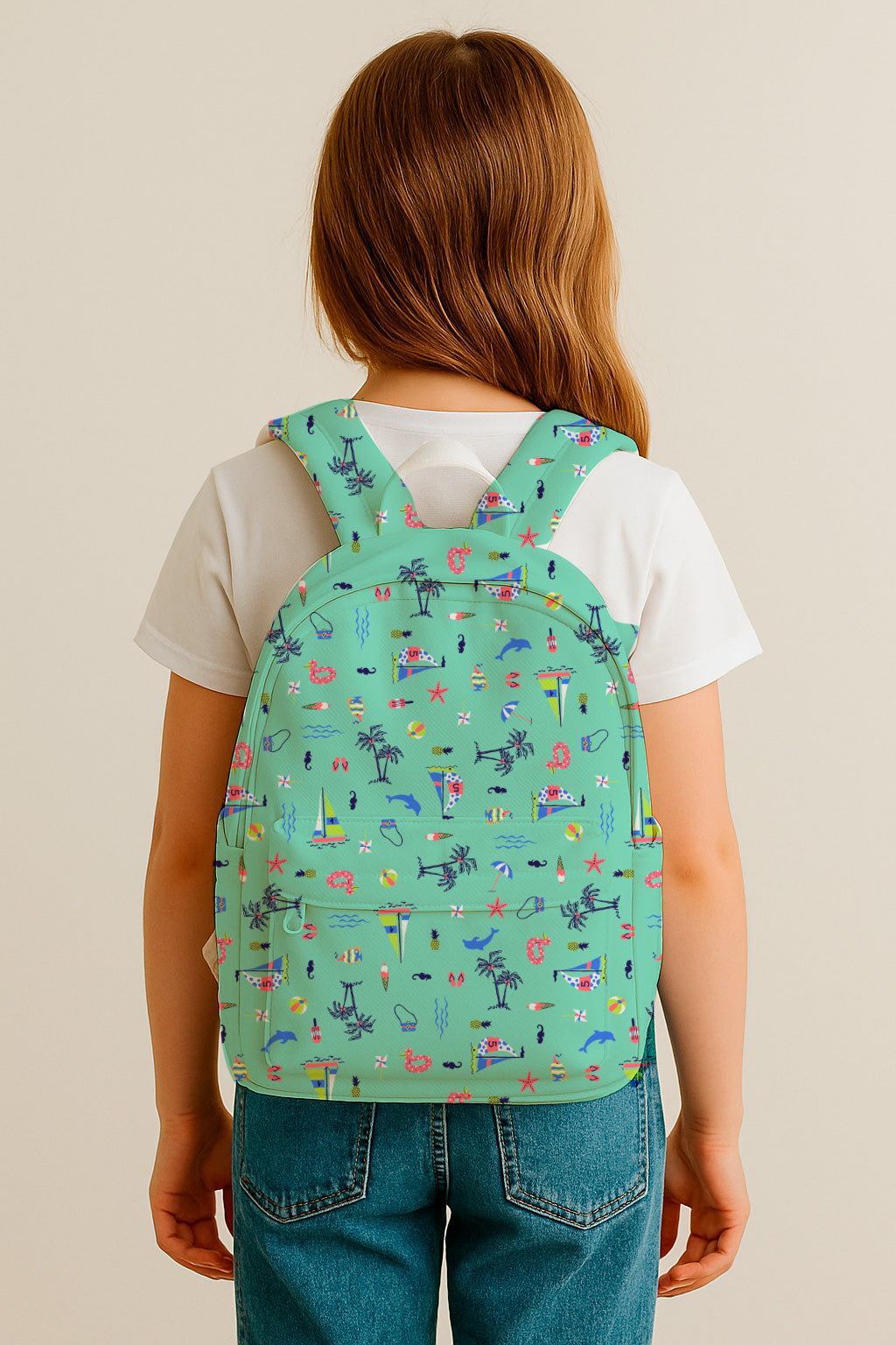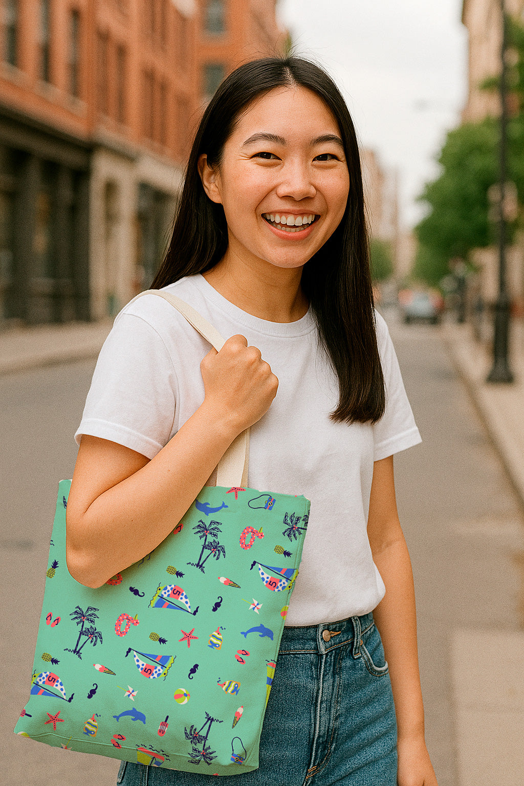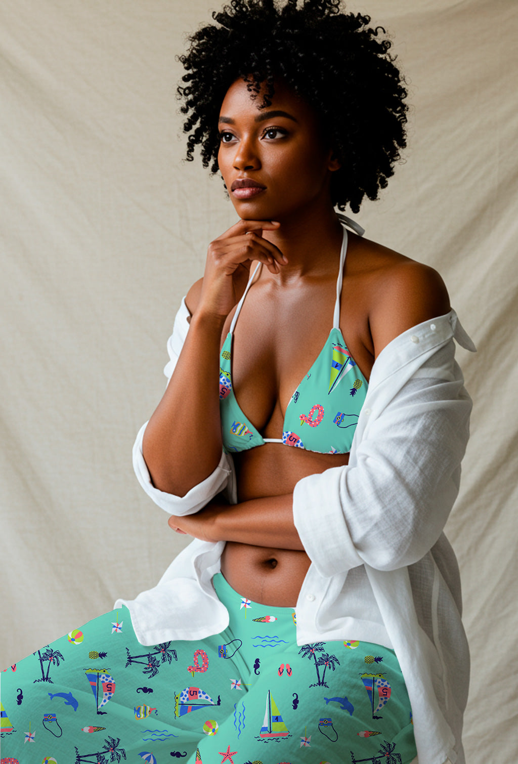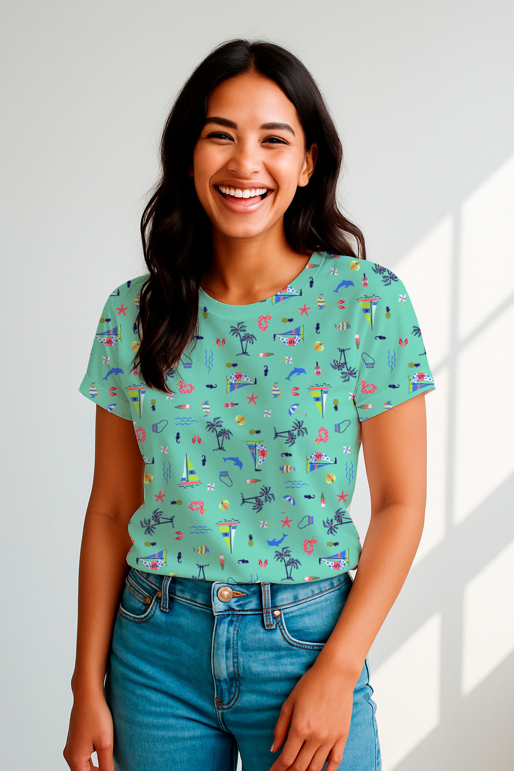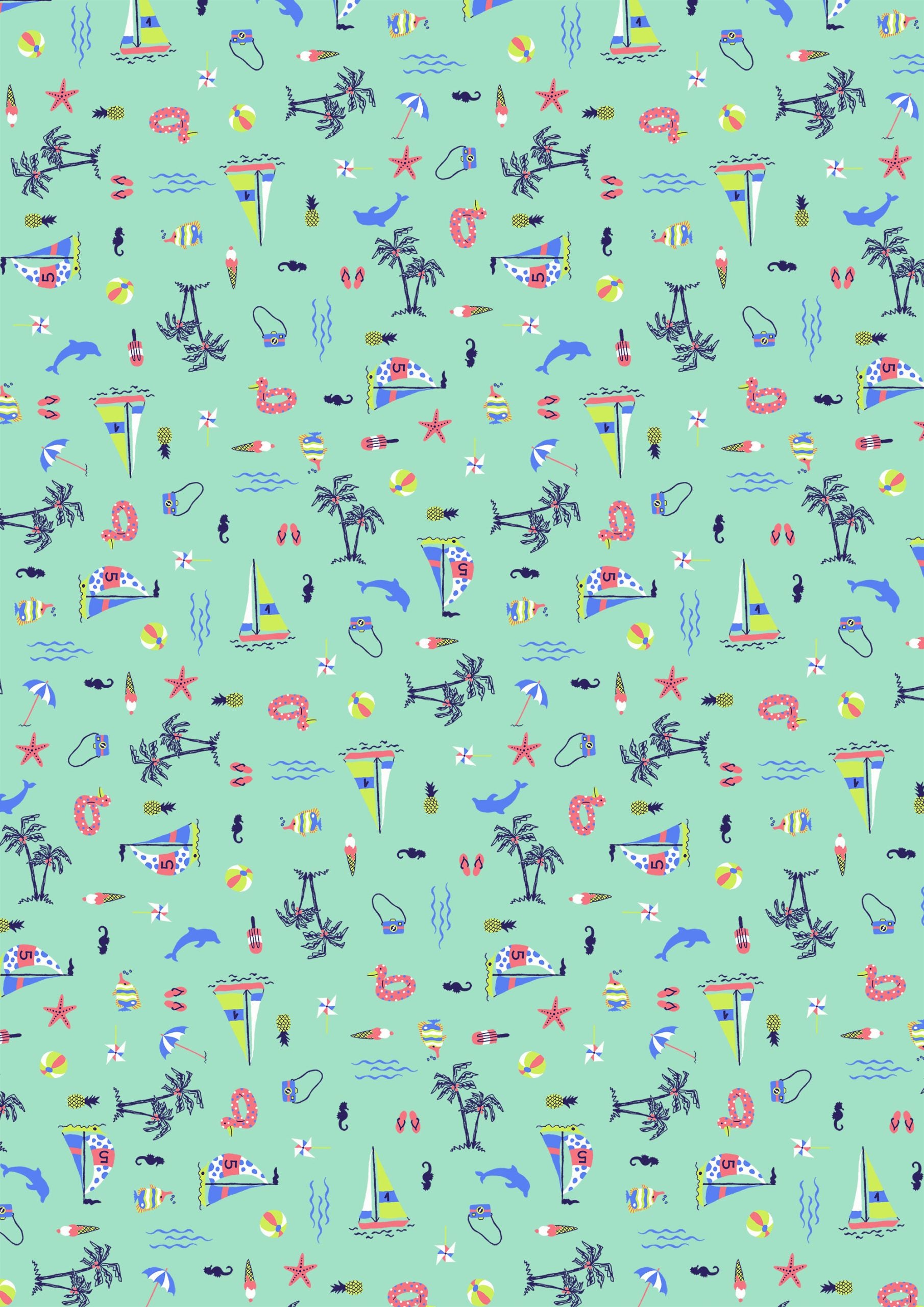 Divertido y colorido estampado veraniego con elementos tropicales como palmeras, delfines, pelotas de playa y veleros sobre un fondo verde menta.