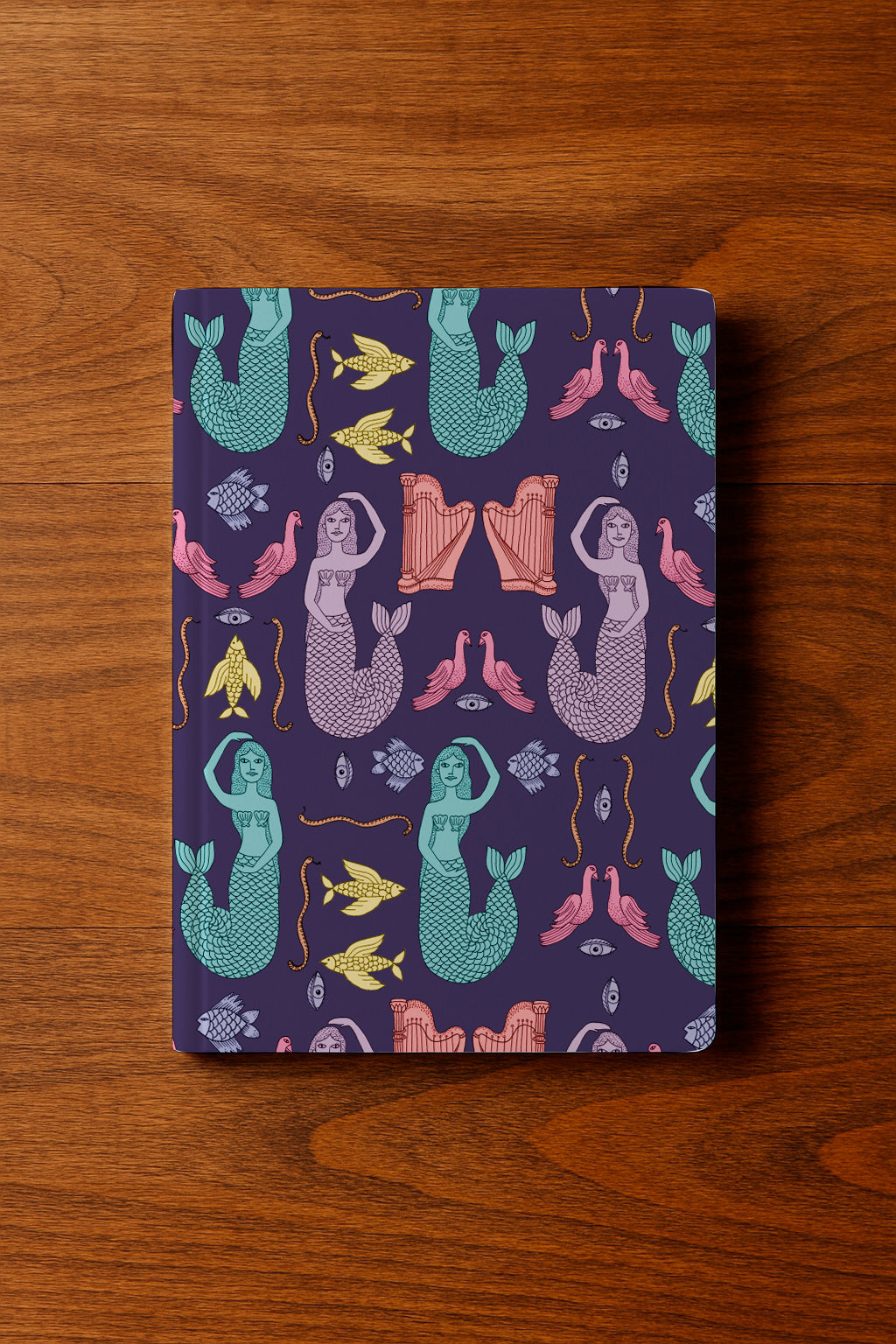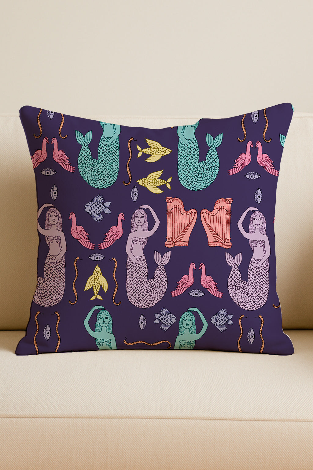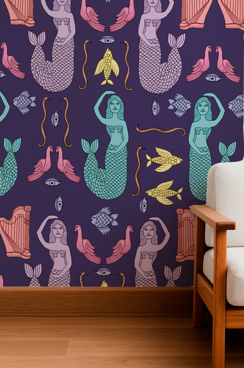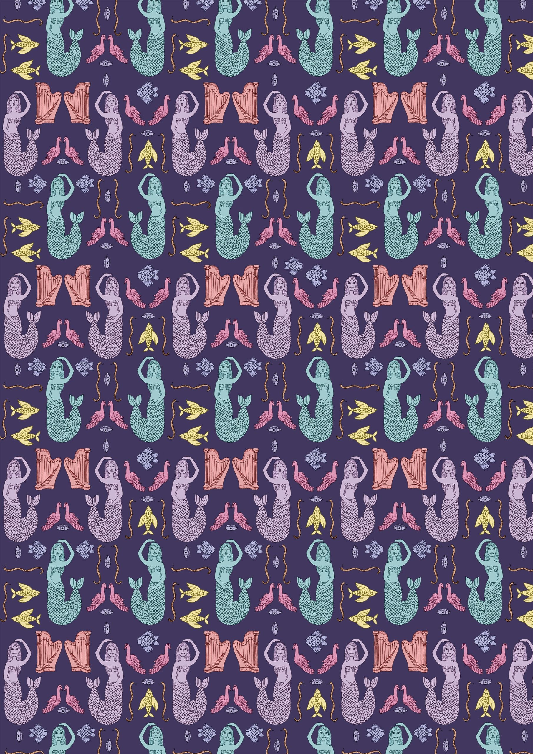 Estampado caprichoso y místico con sirenas, arpas, pájaros y conchas marinas en tonos pastel sobre un fondo morado intenso.