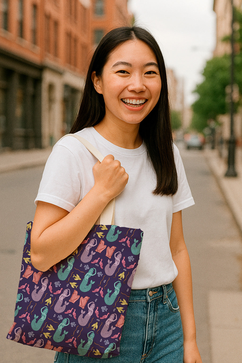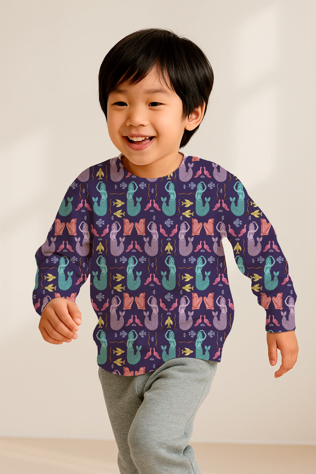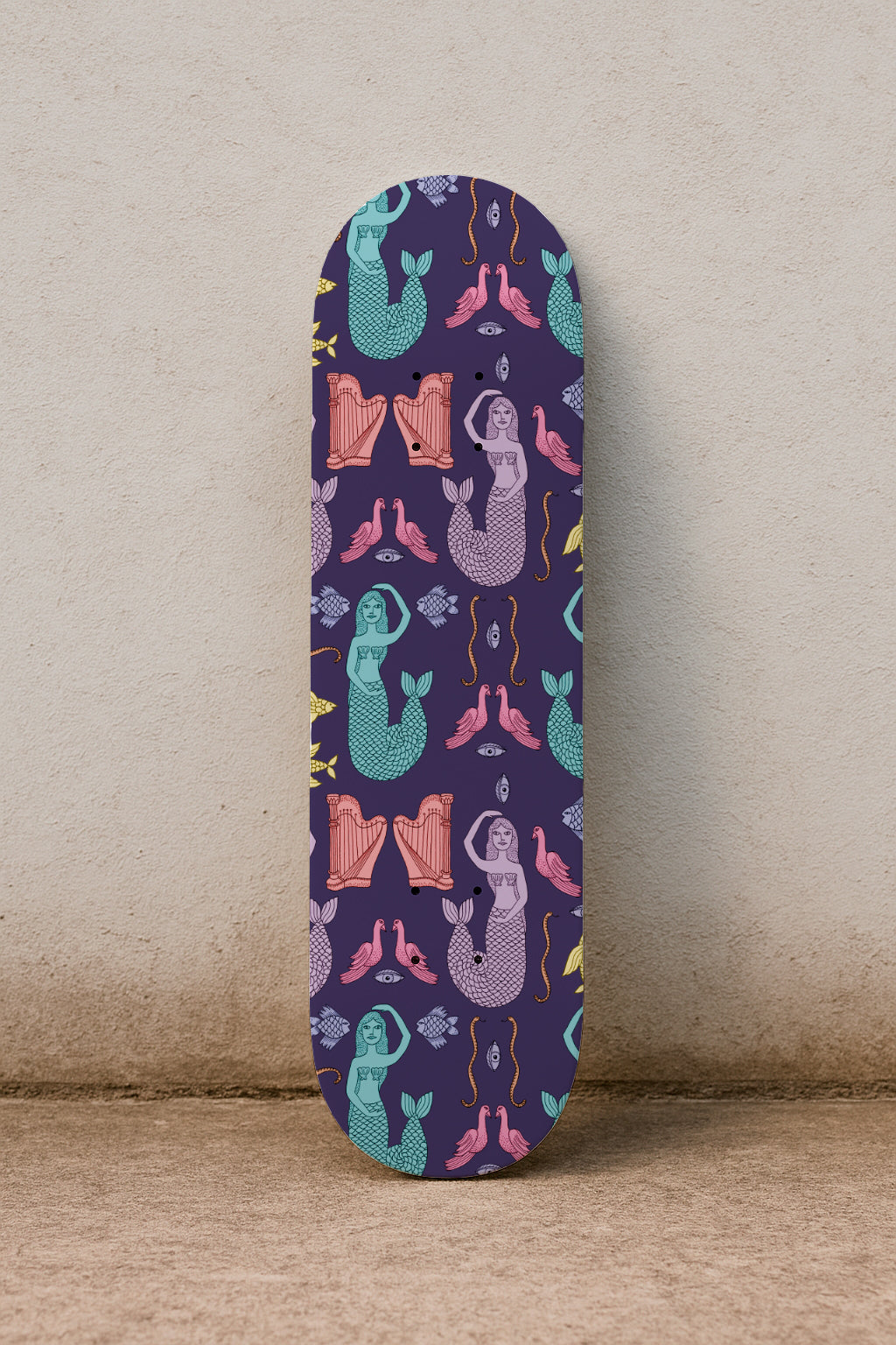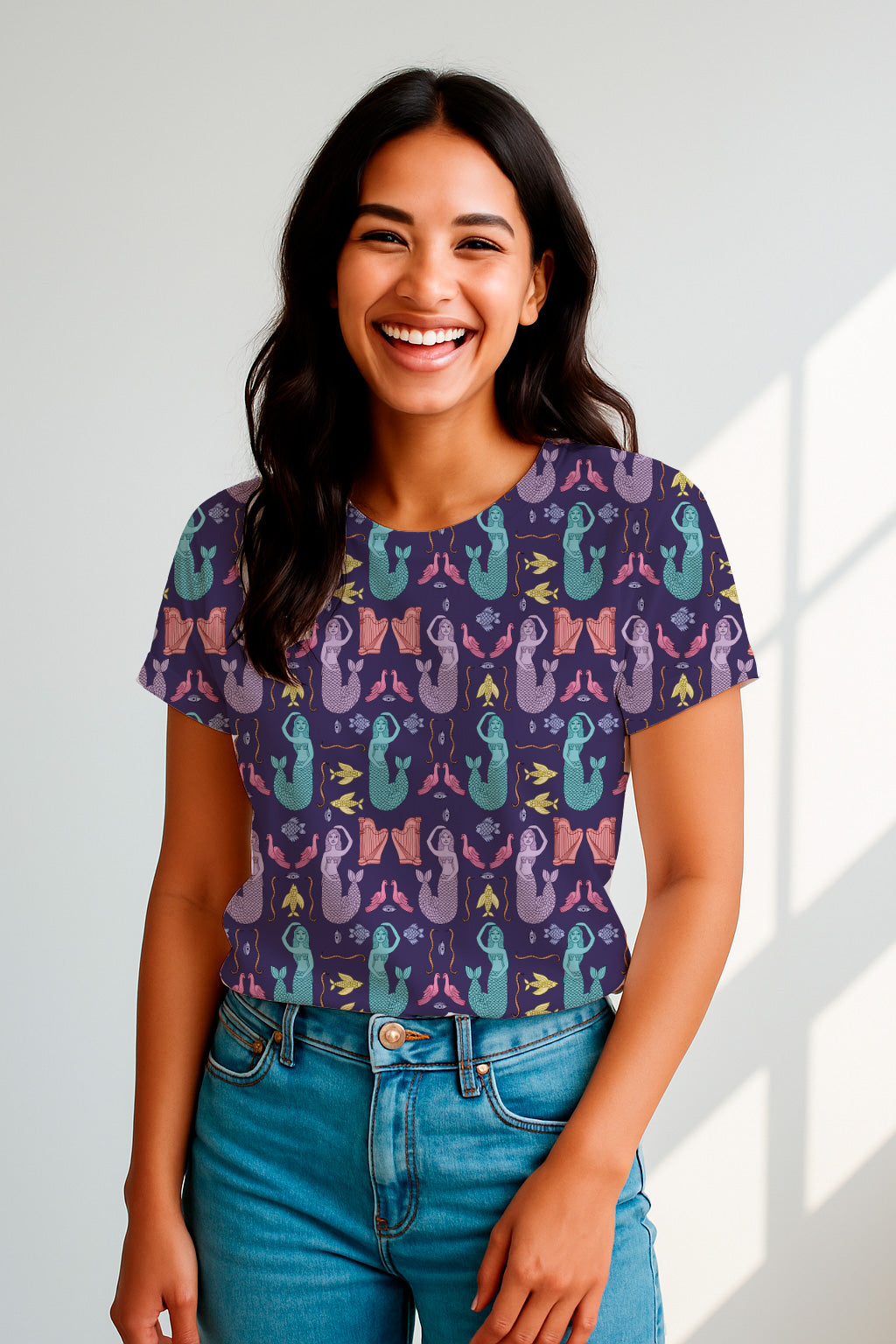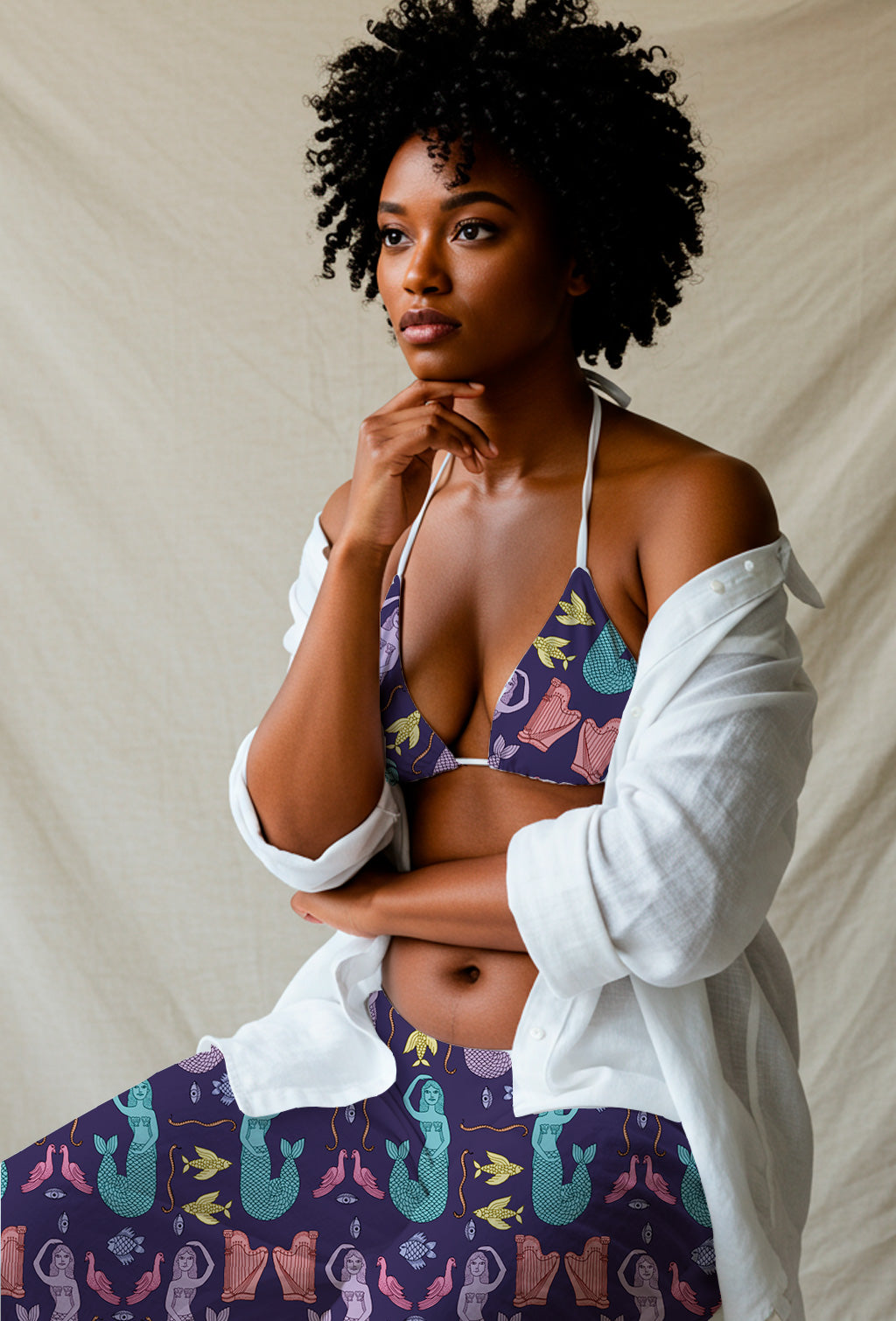 Estampado caprichoso y místico con sirenas, arpas, pájaros y conchas marinas en tonos pastel sobre un fondo morado intenso.