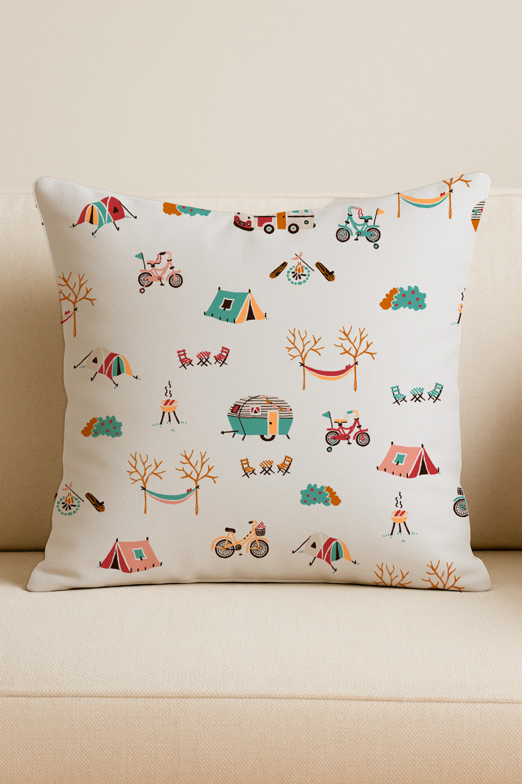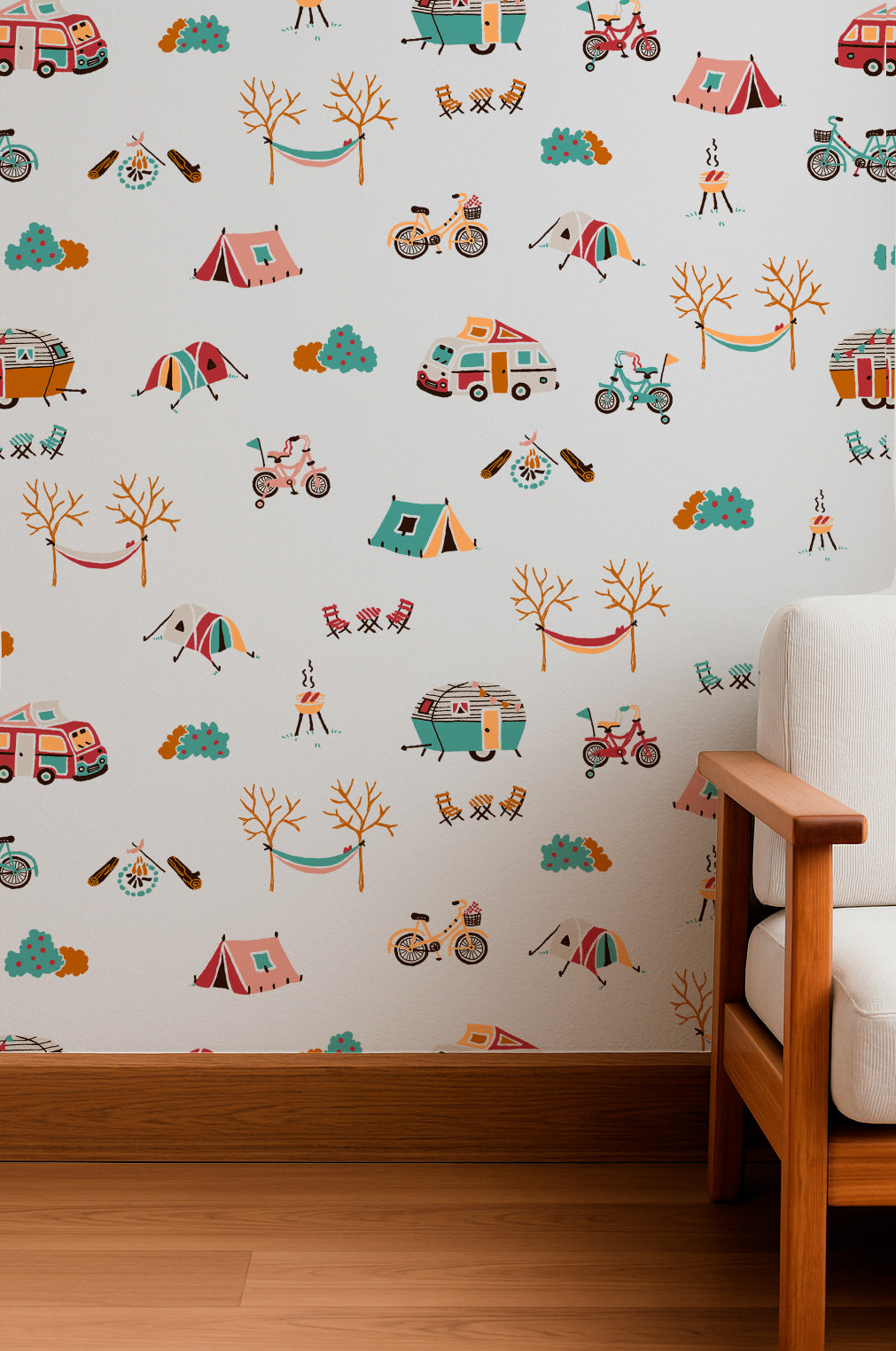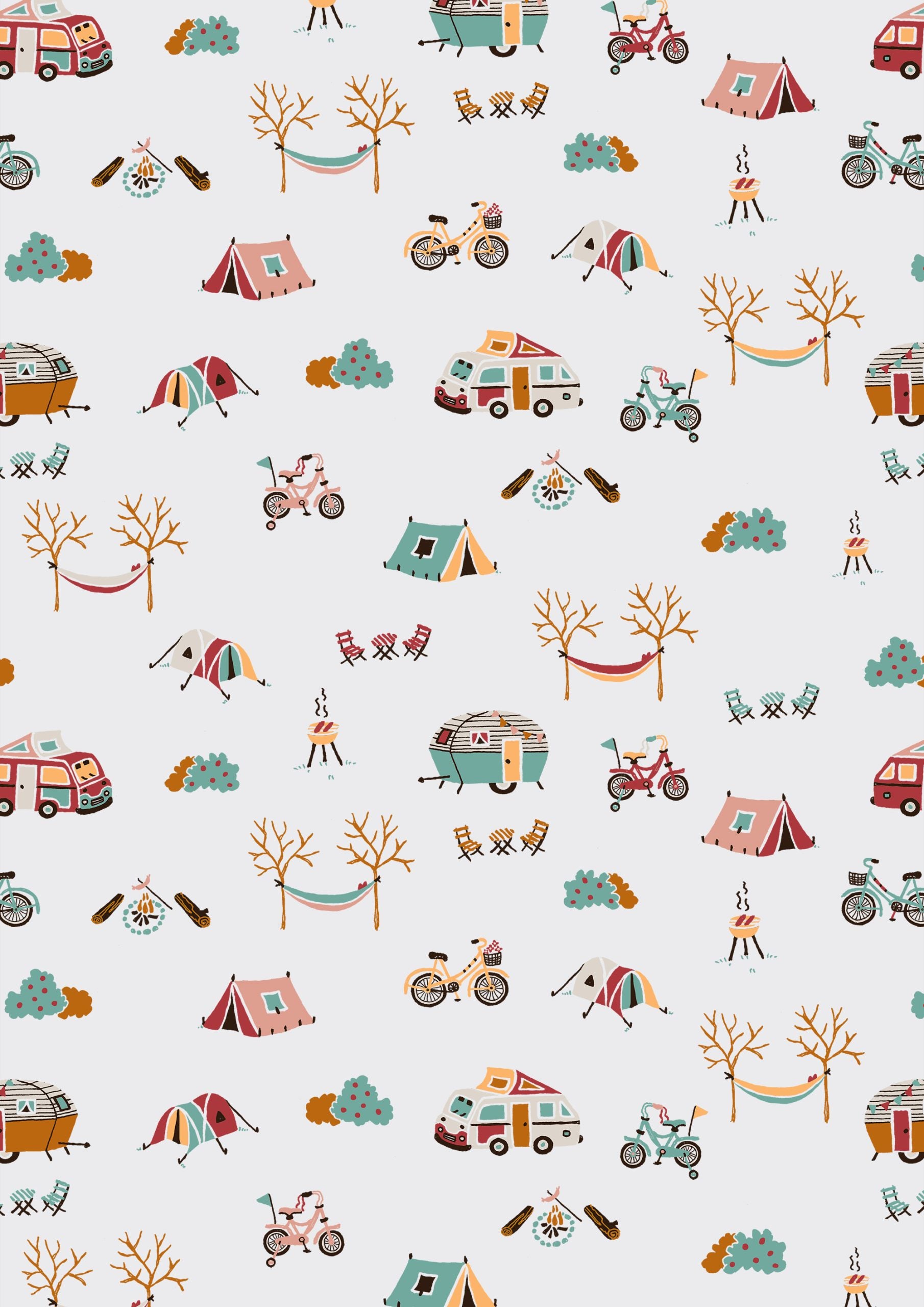Estampado original con temática de acampada, con tiendas de campaña, furgonetas, bicicletas y hogueras. Ideal para diseños infantiles y de exterior.