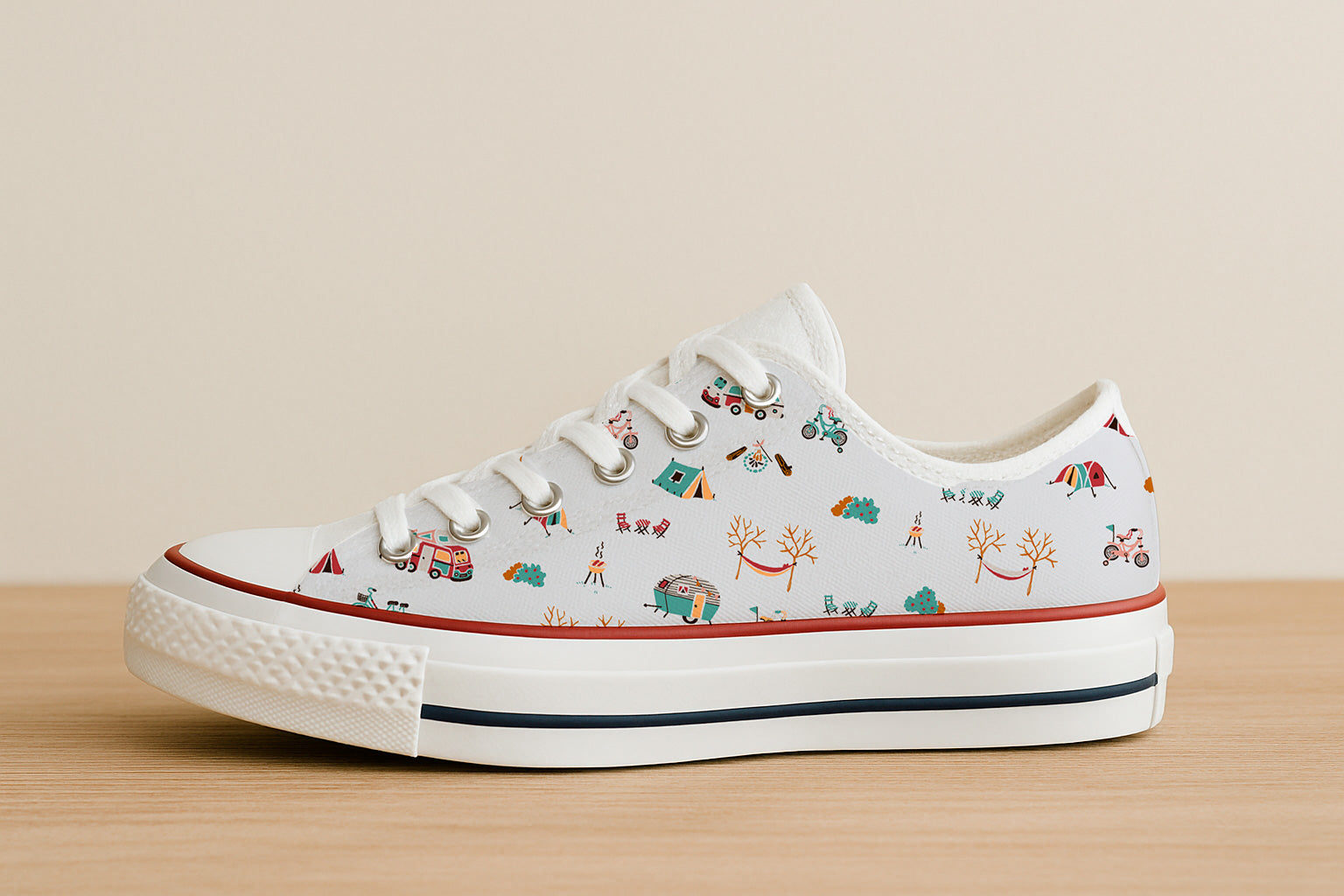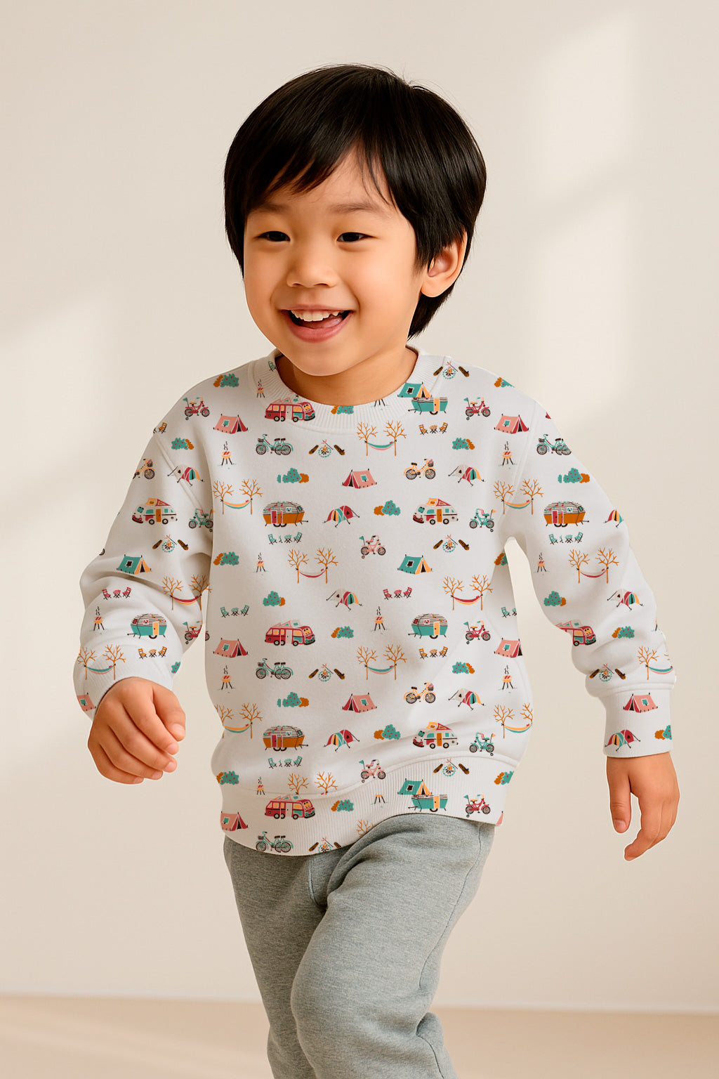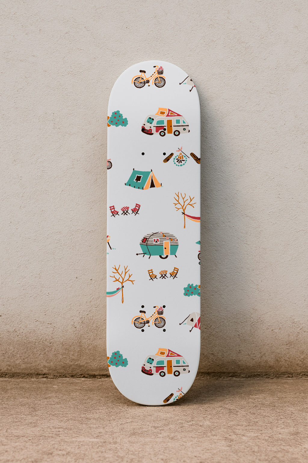 Estampado original con temática de acampada, con tiendas de campaña, furgonetas, bicicletas y hogueras. Ideal para diseños infantiles y de exterior.