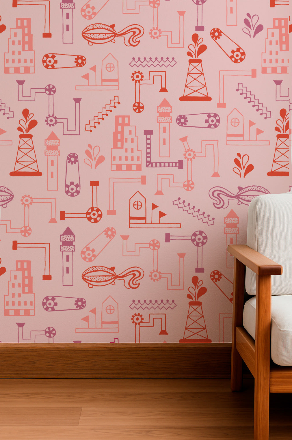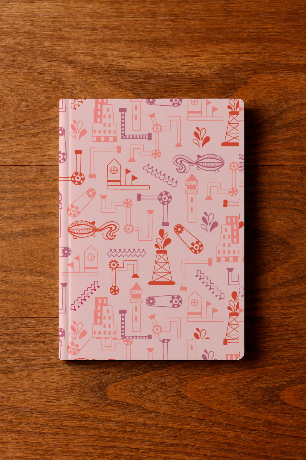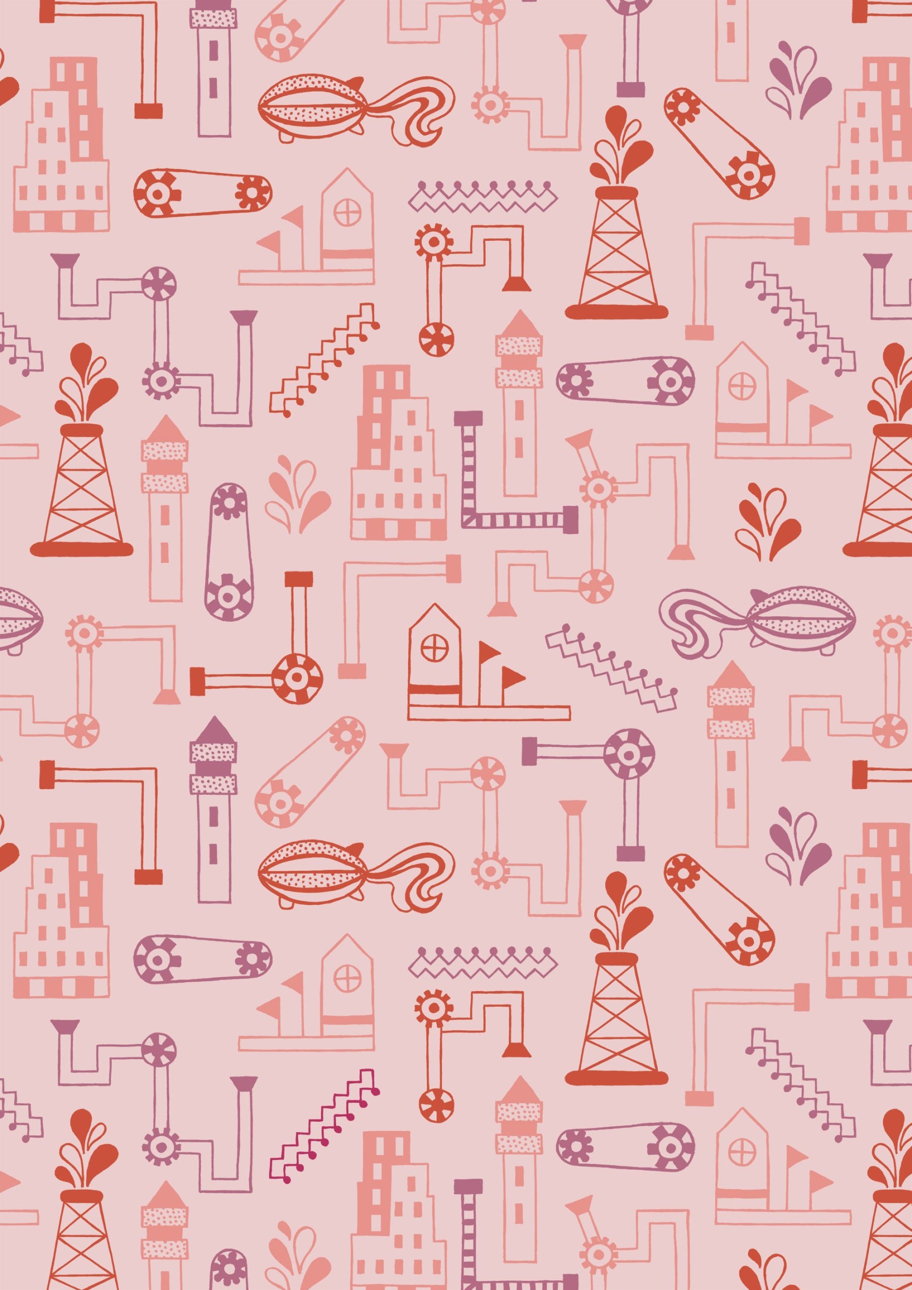 Estampado industrial surrealista con tuberías, engranajes y edificios fantásticos en tonos rosas y rojos. Ideal para proyectos originales e imaginativos.