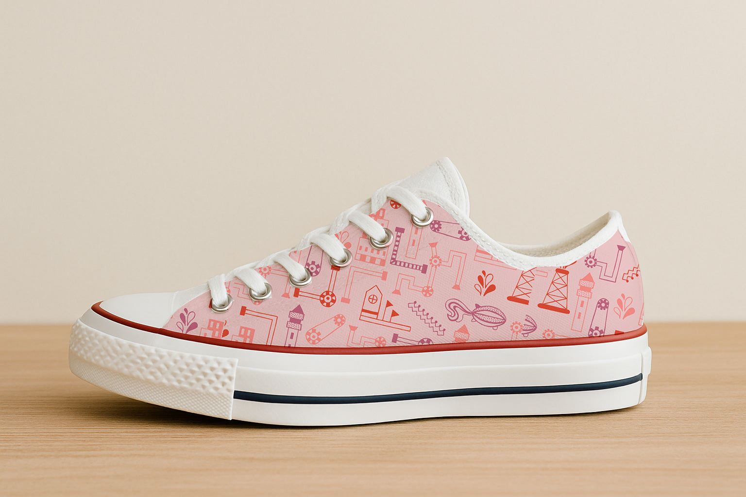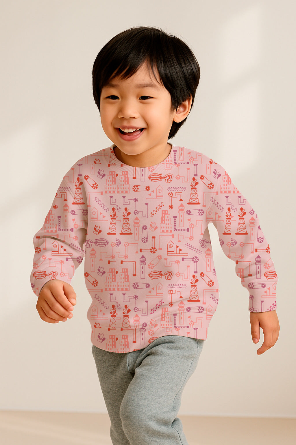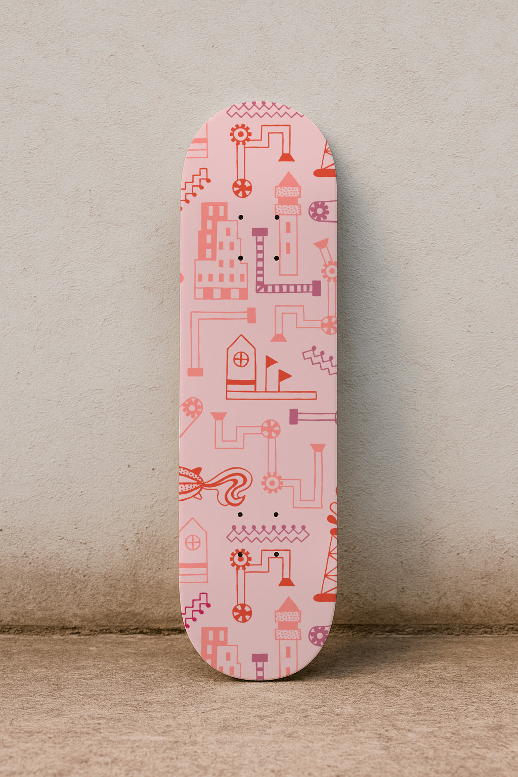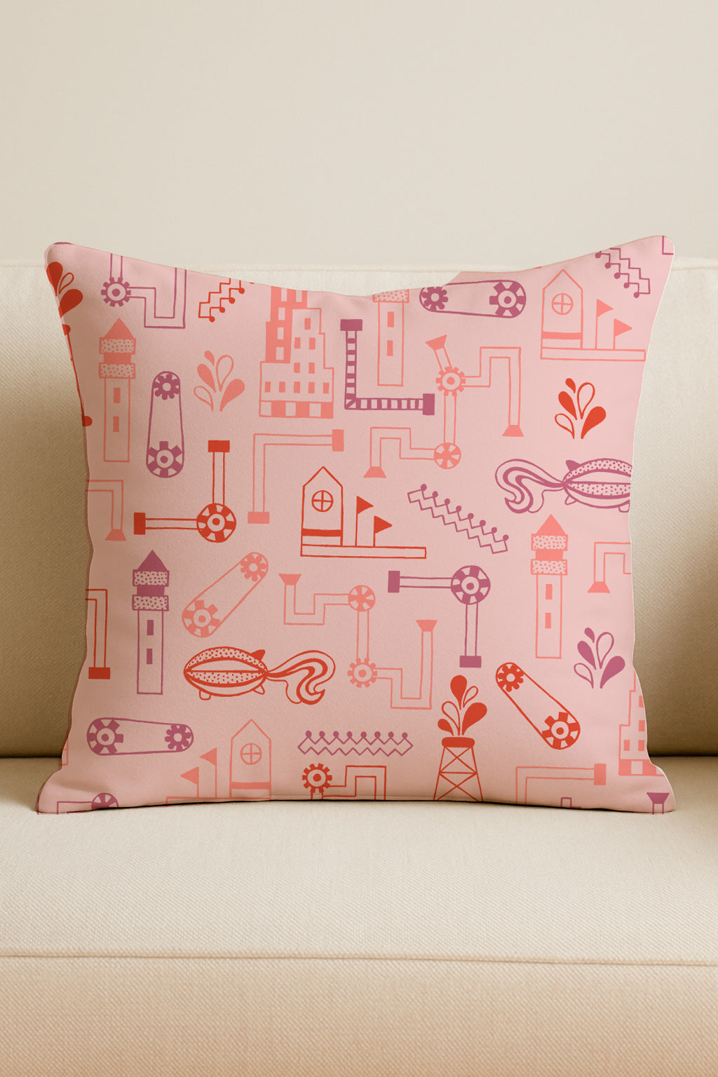 Estampado industrial surrealista con tuberías, engranajes y edificios fantásticos en tonos rosas y rojos. Ideal para proyectos originales e imaginativos.