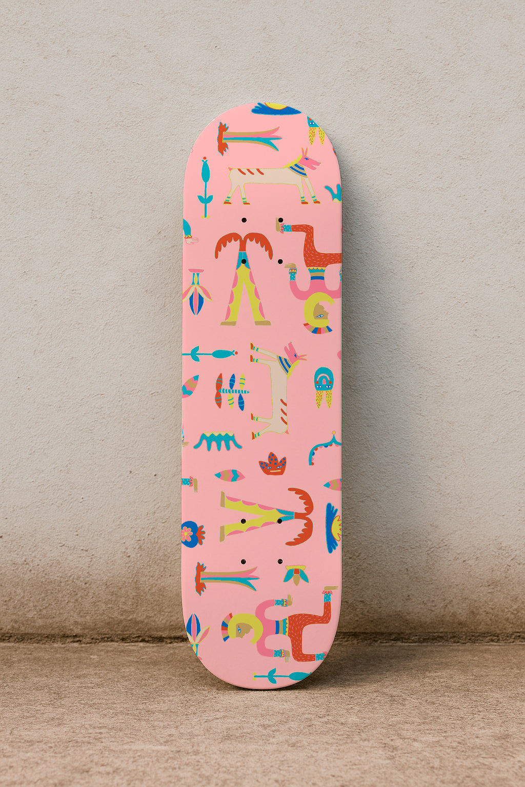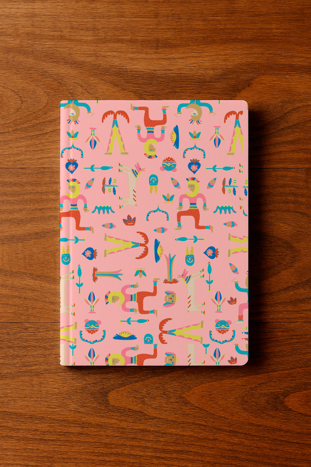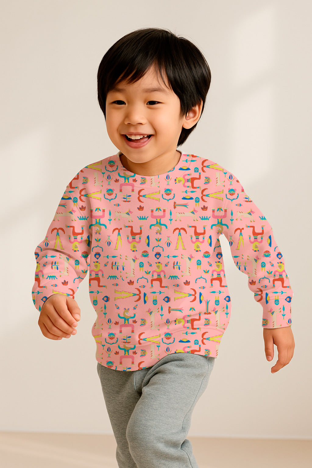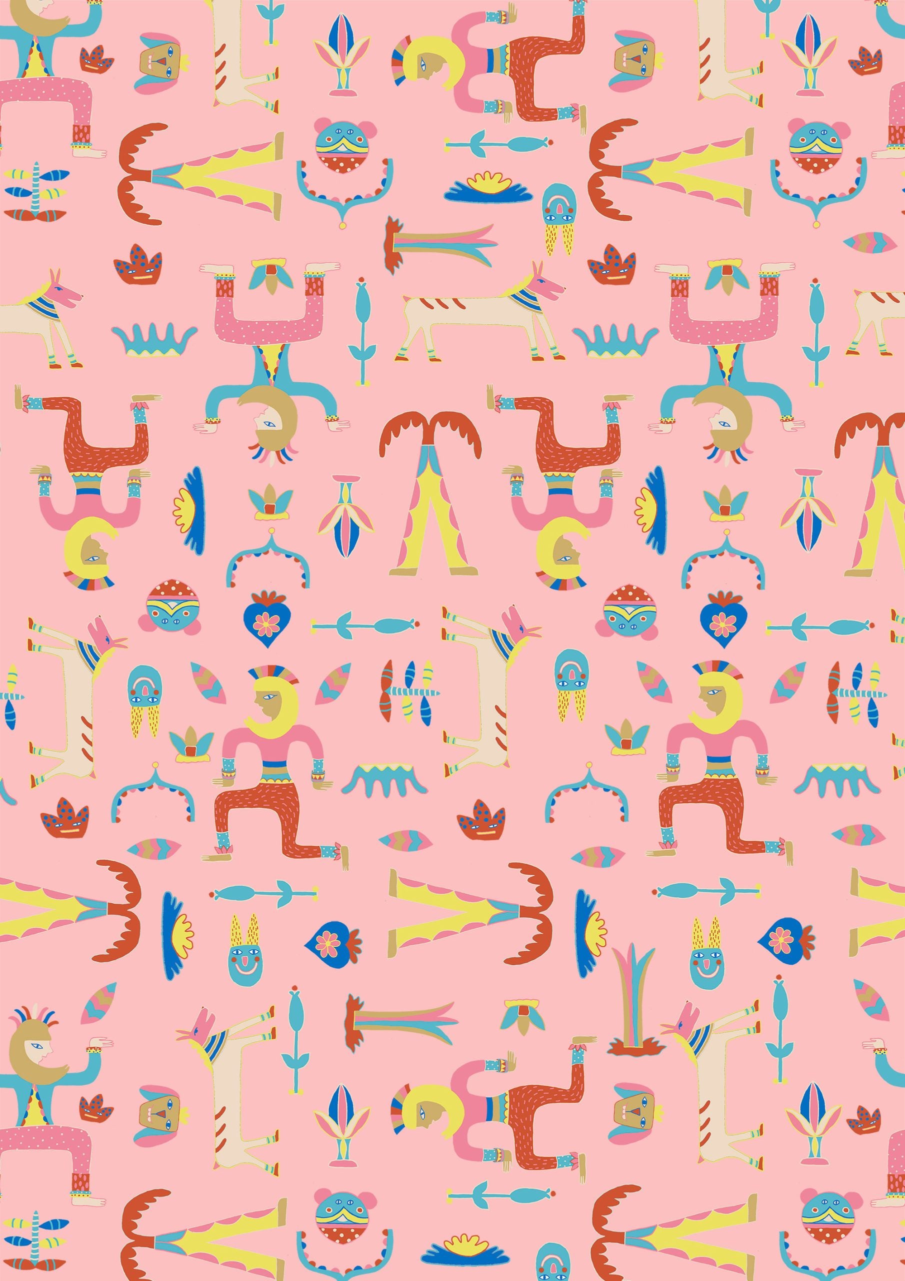 Figuras originales estilo tótem y elementos caprichosos en tonos pastel sobre fondo rosa. Ideal para ropa infantil y temáticas divertidas.