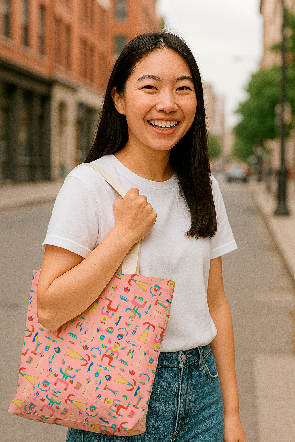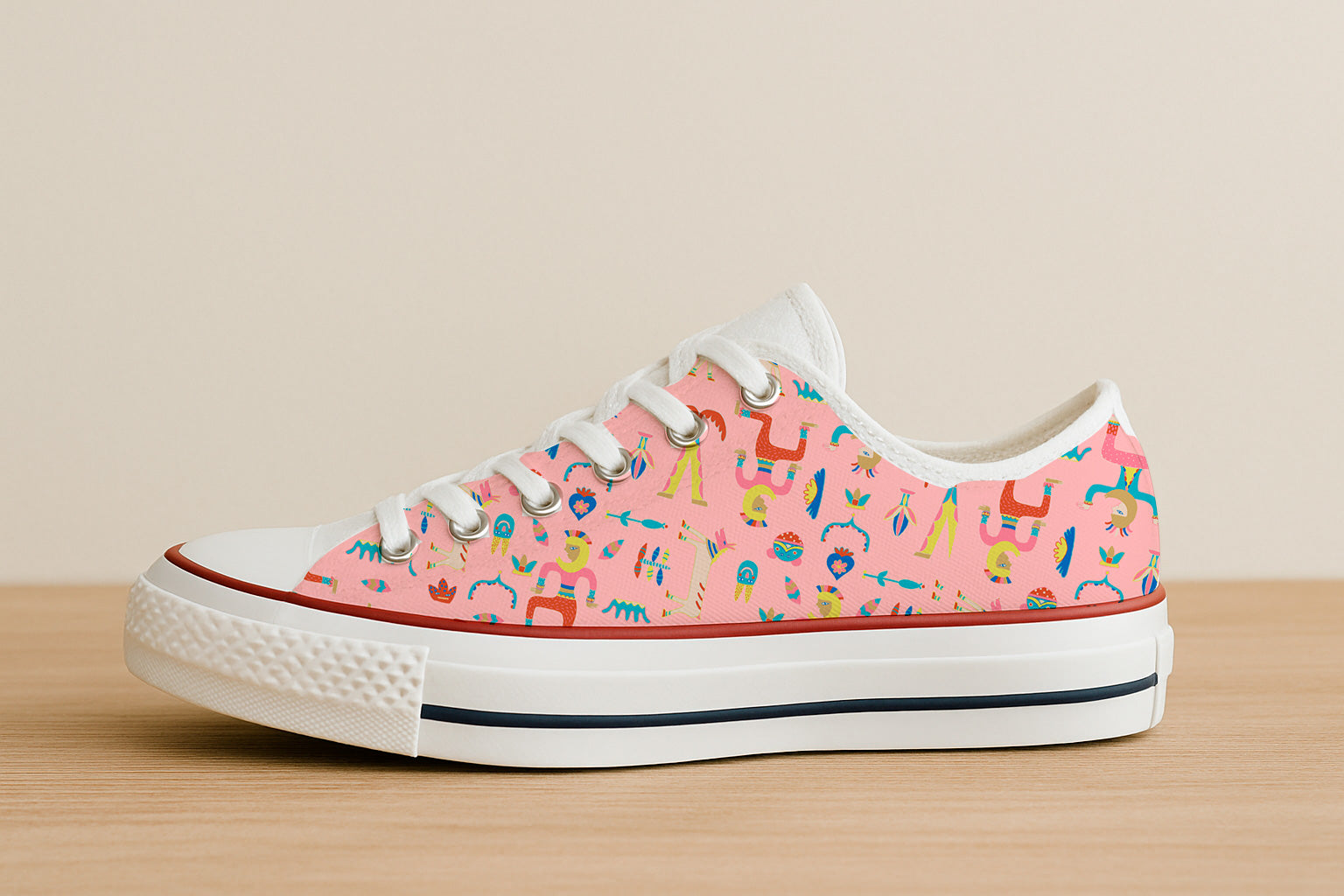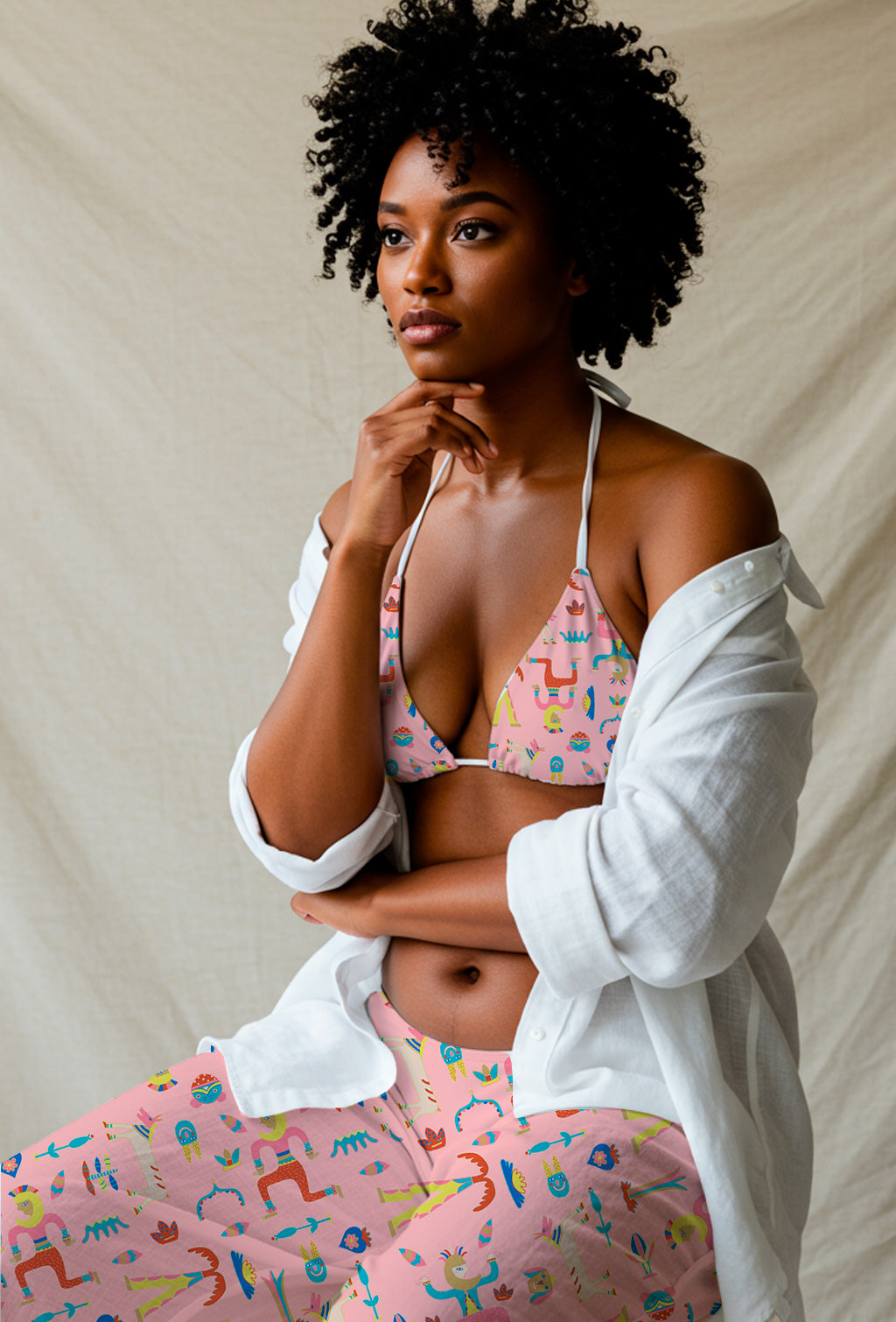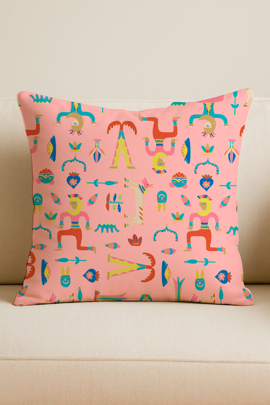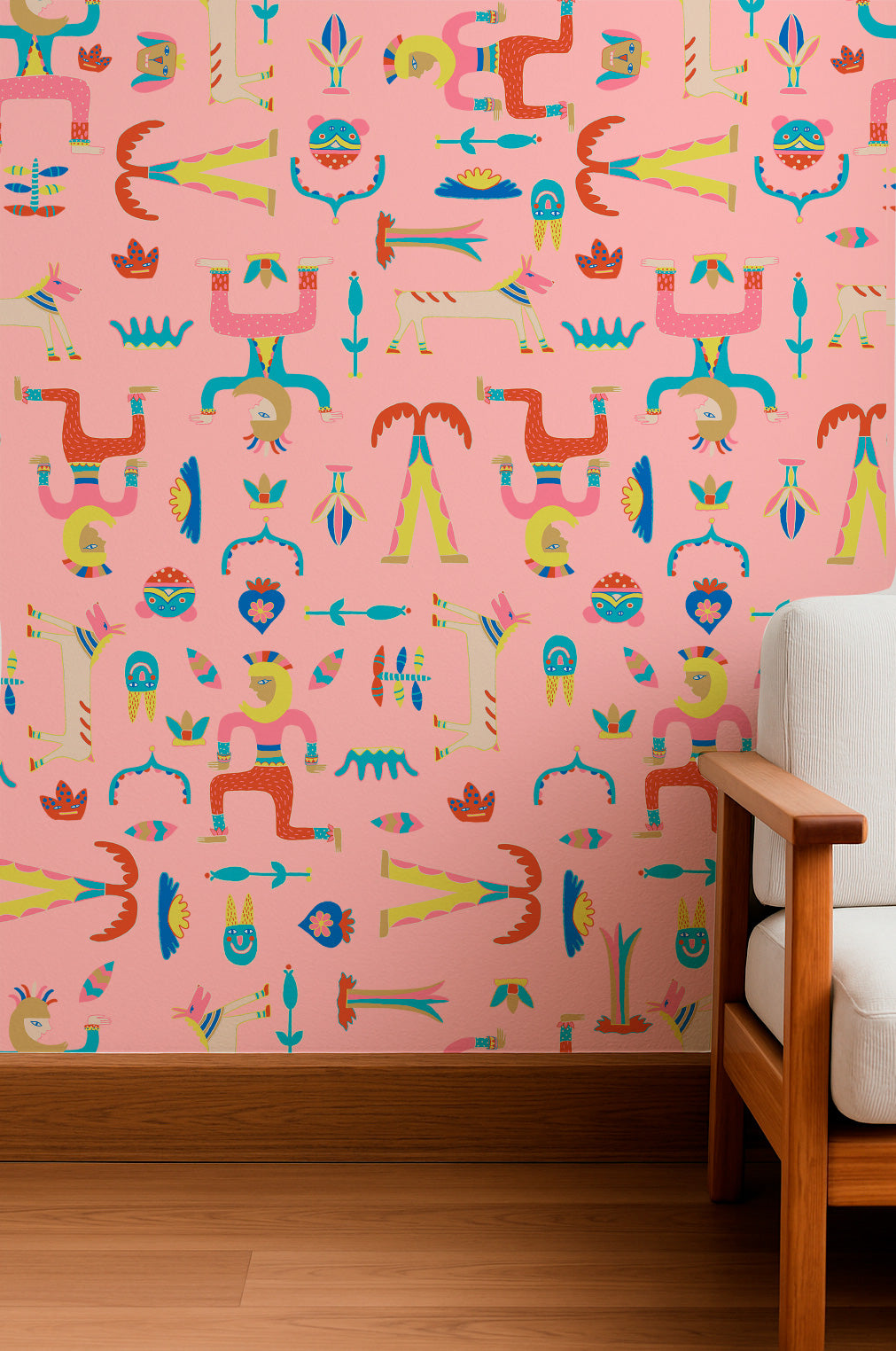 Figuras originales estilo tótem y elementos caprichosos en tonos pastel sobre fondo rosa. Ideal para ropa infantil y temáticas divertidas.