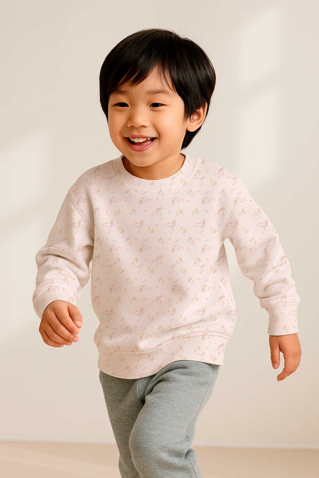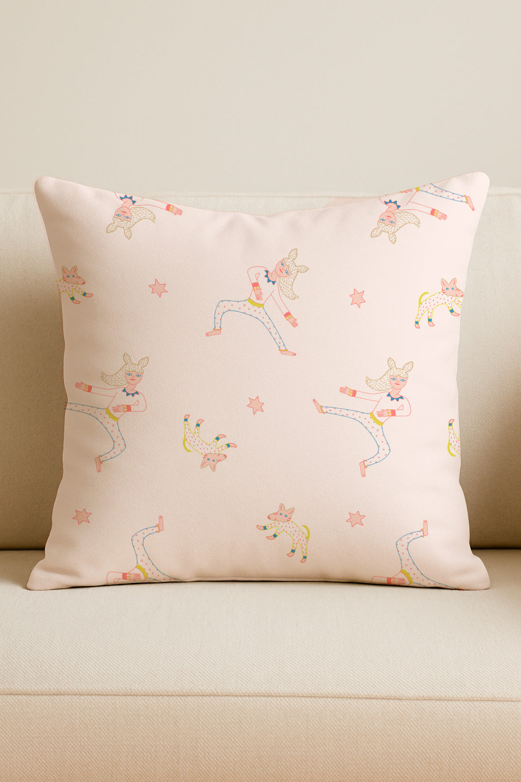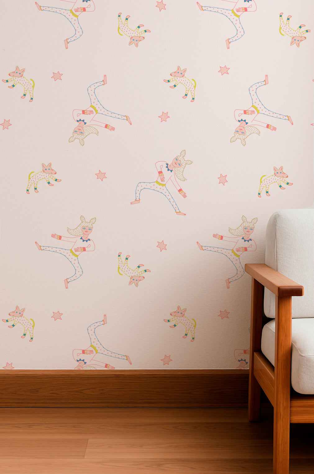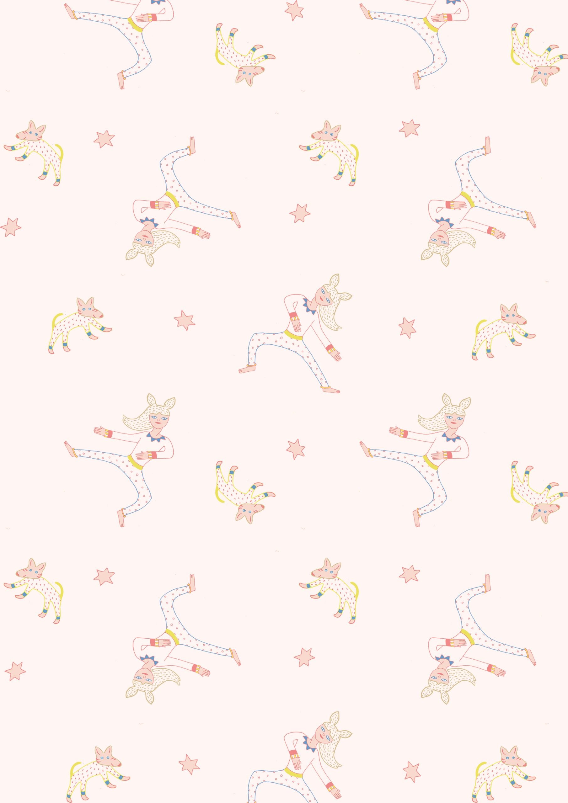 Estampado delicado con niños en pijama y animales adorables sobre un fondo rosa suave. Dulce y encantador, ideal para telas infantiles.