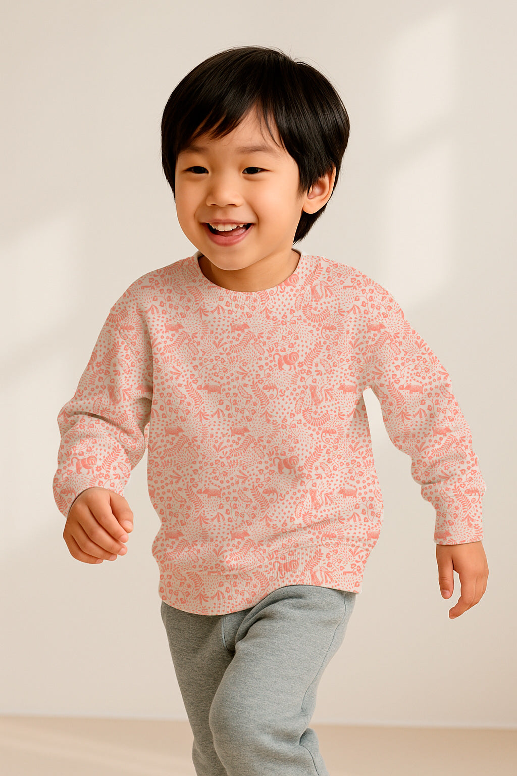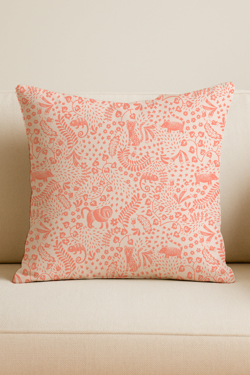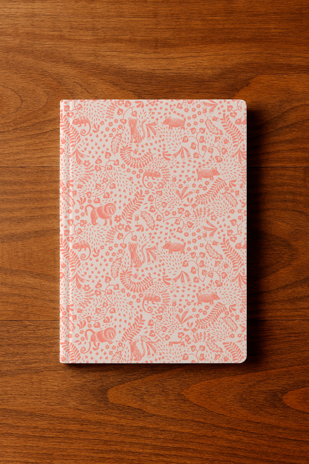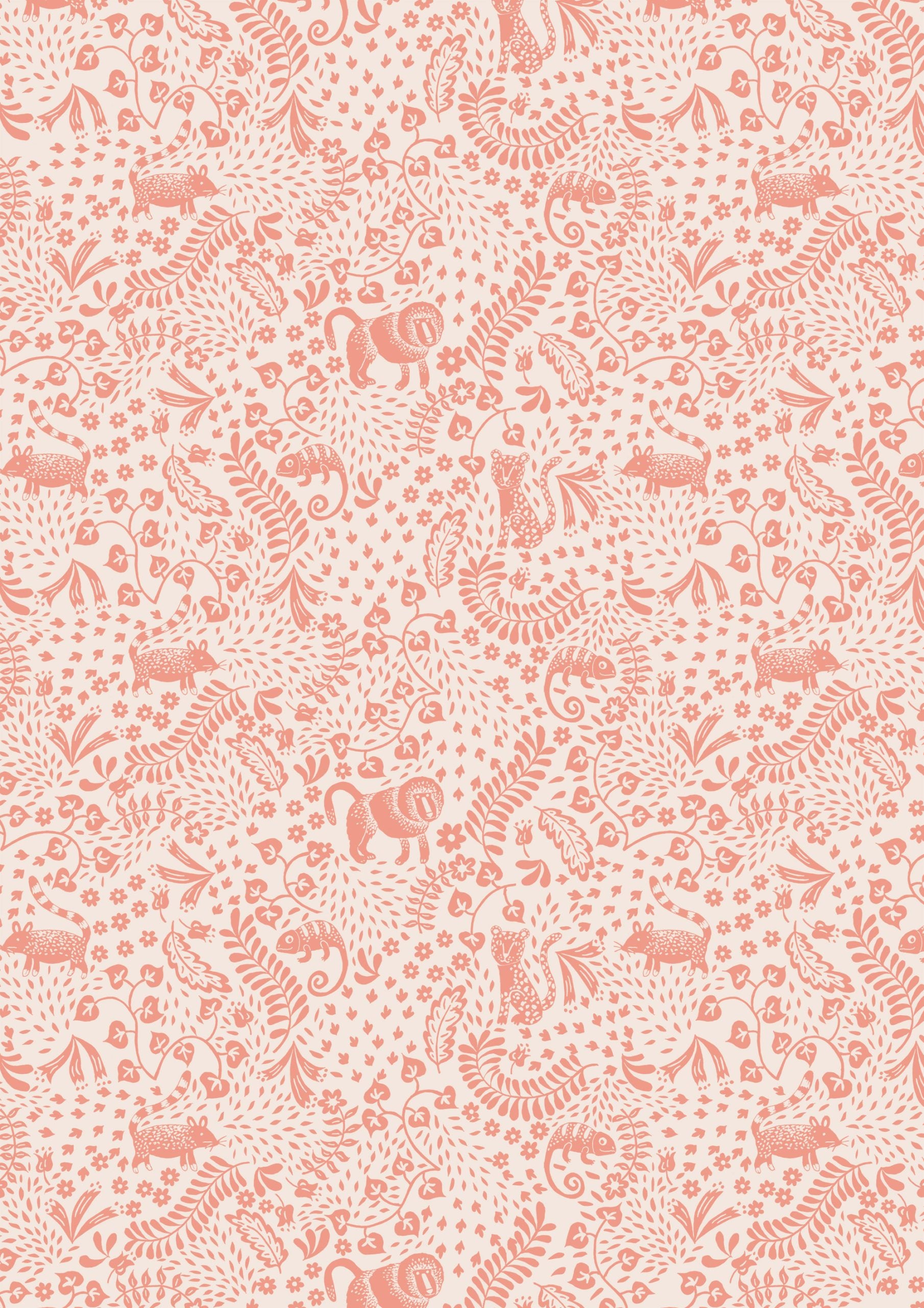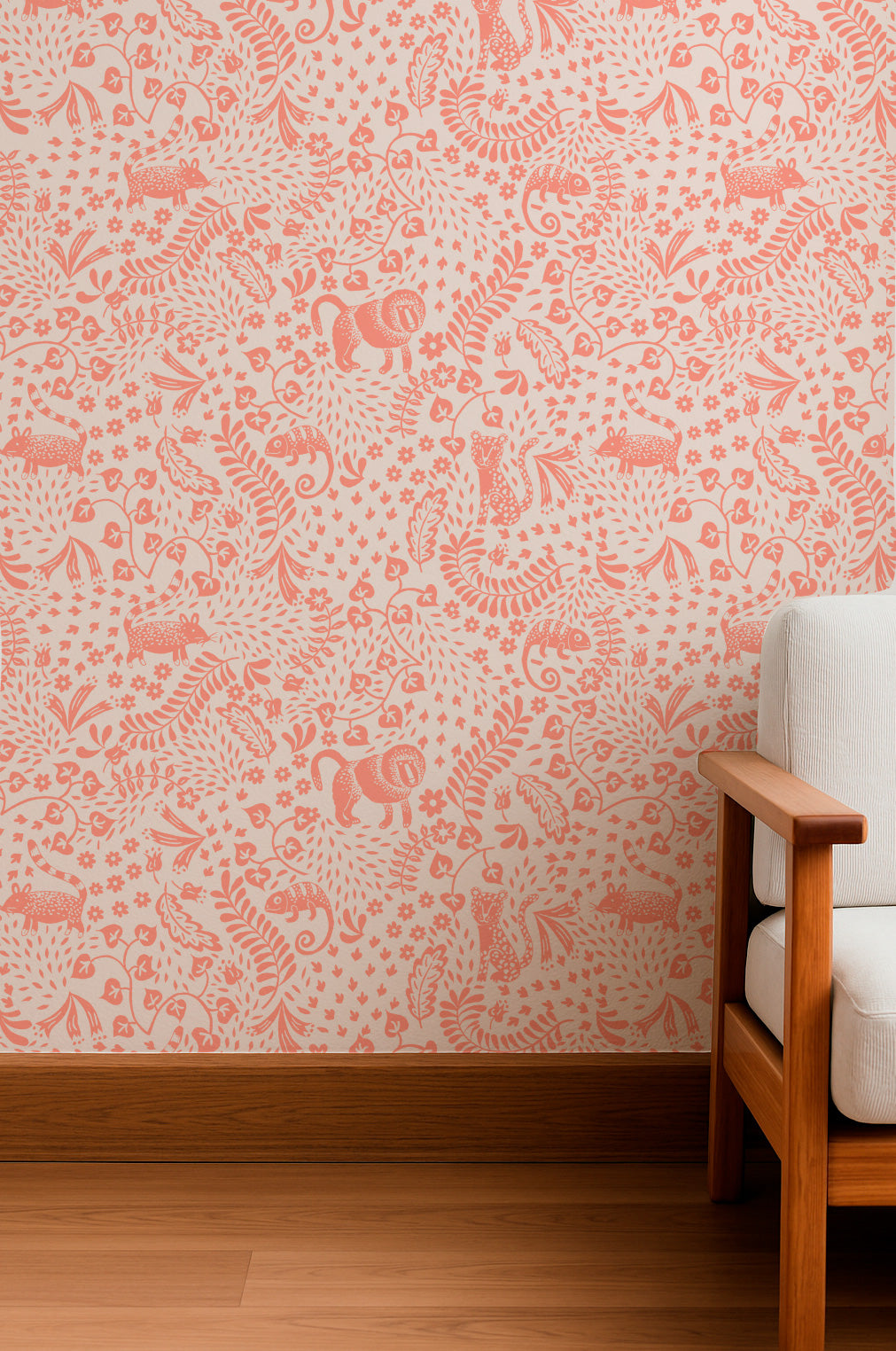 Encantadores animales y follaje de la selva en un único y cálido tono terracota, que recuerda al arte popular impreso a mano.