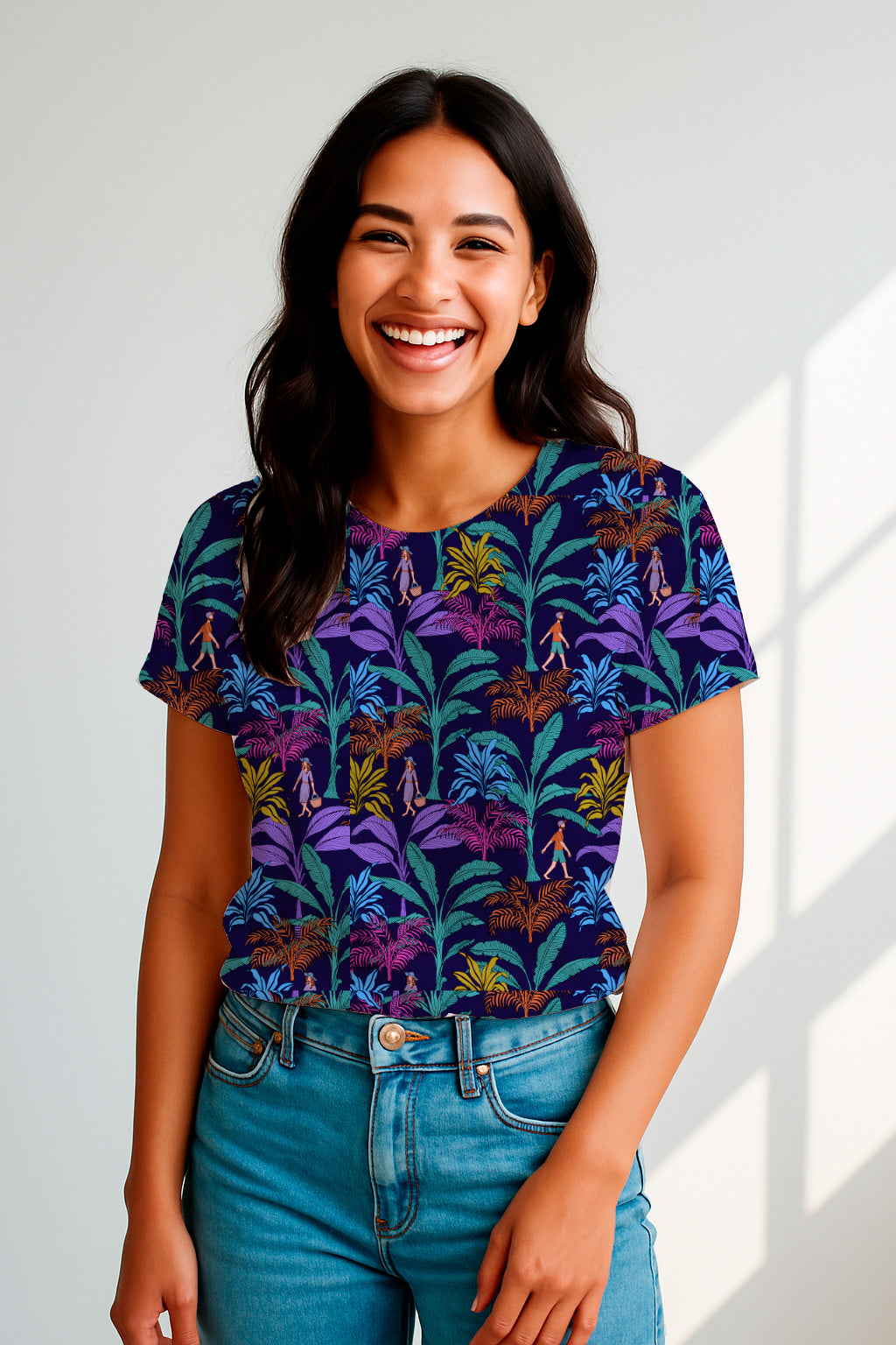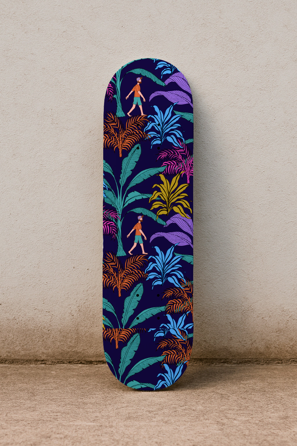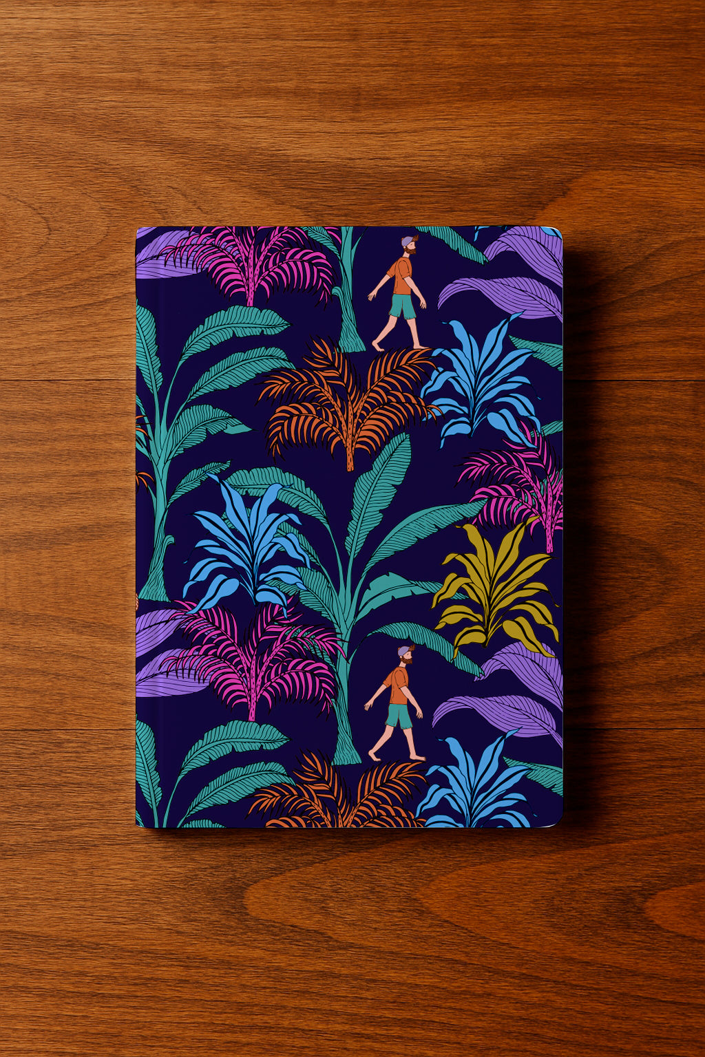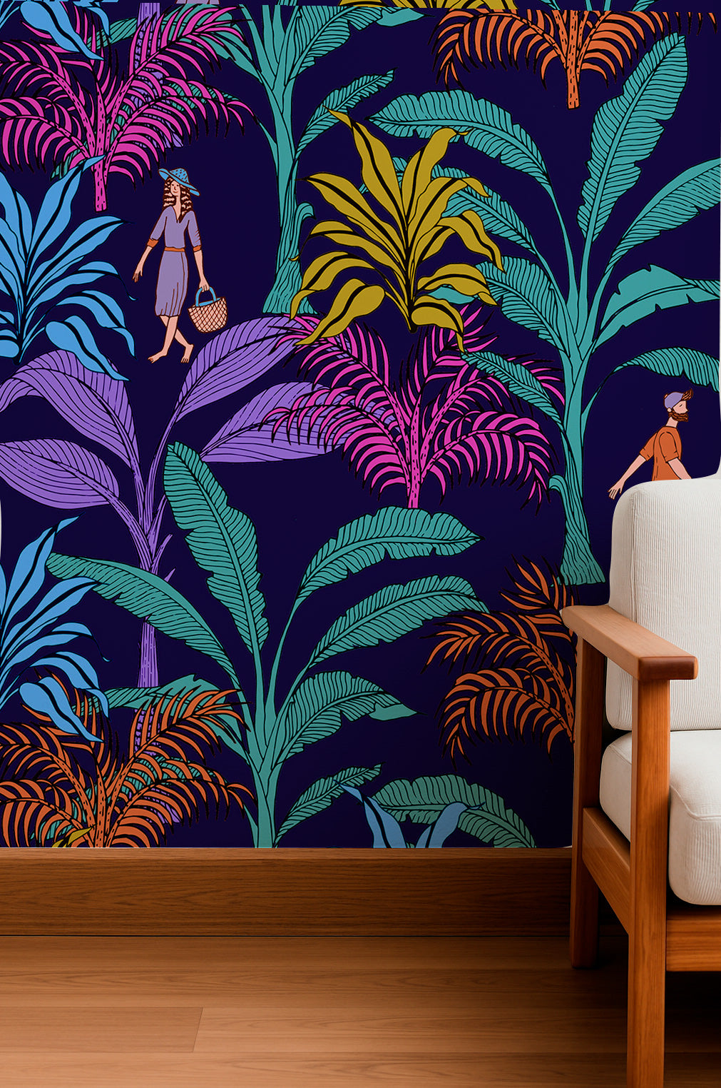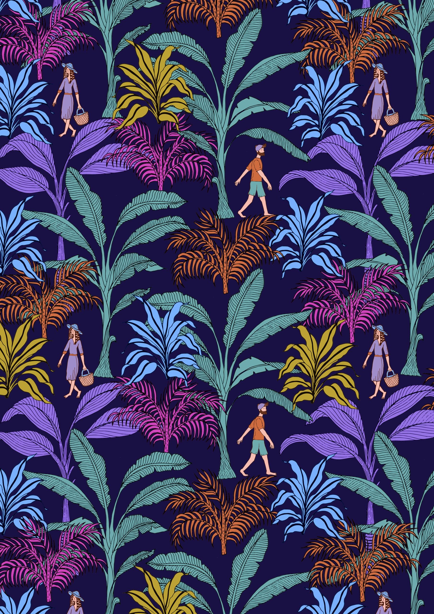 Hojas tropicales de colores con pequeñas figuras ilustradas que caminan entre las plantas.