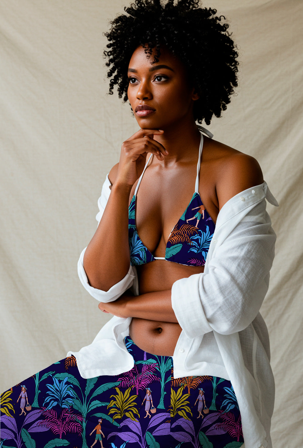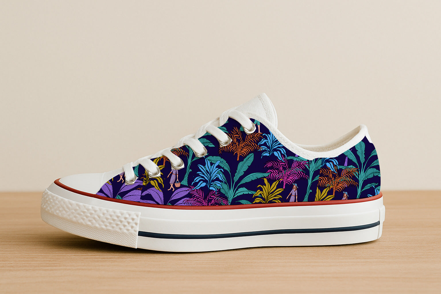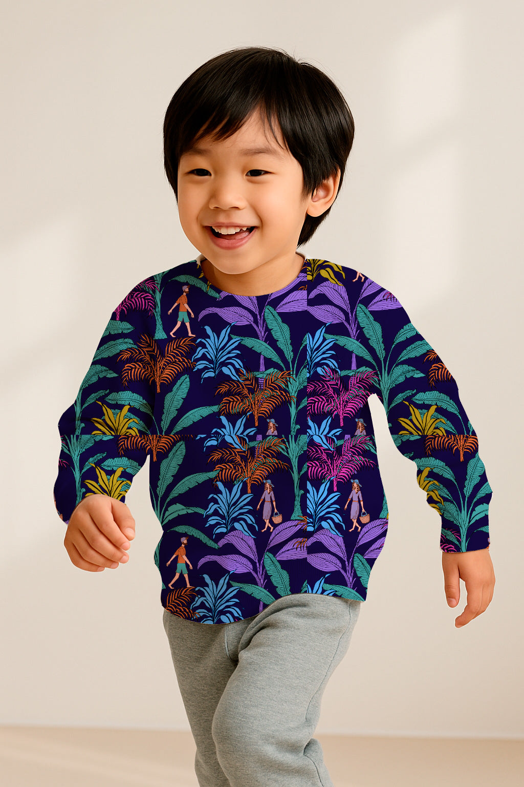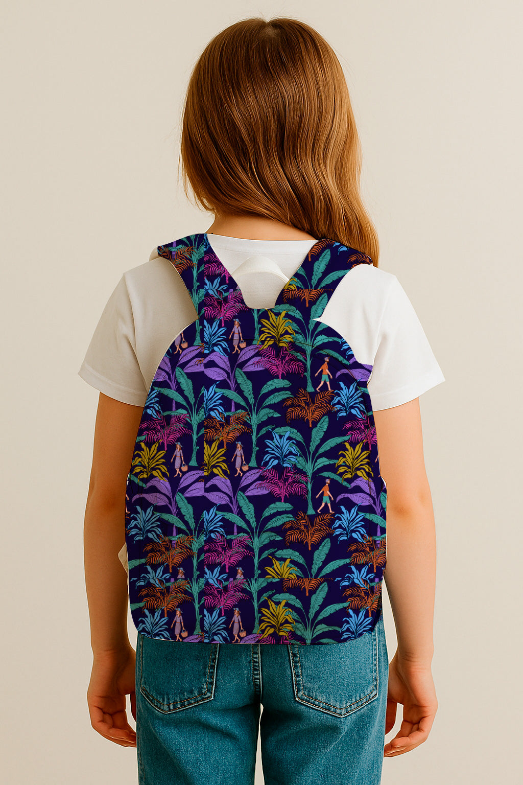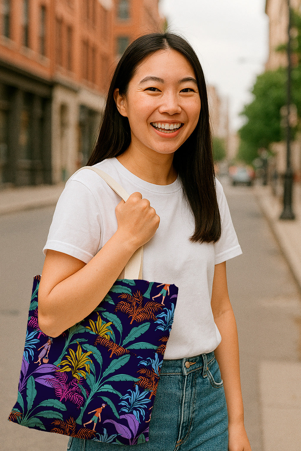 Hojas tropicales de colores con pequeñas figuras ilustradas que caminan entre las plantas.