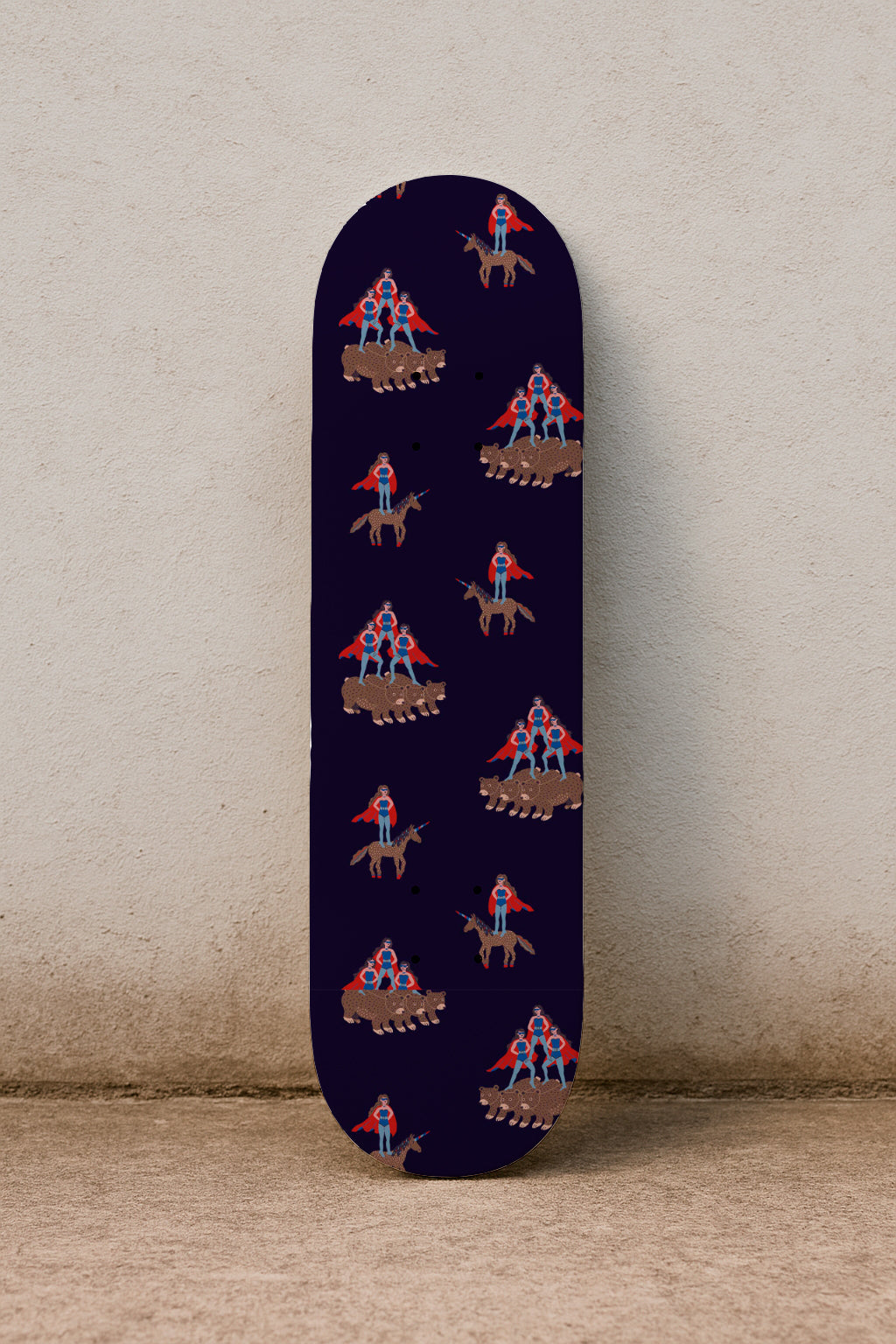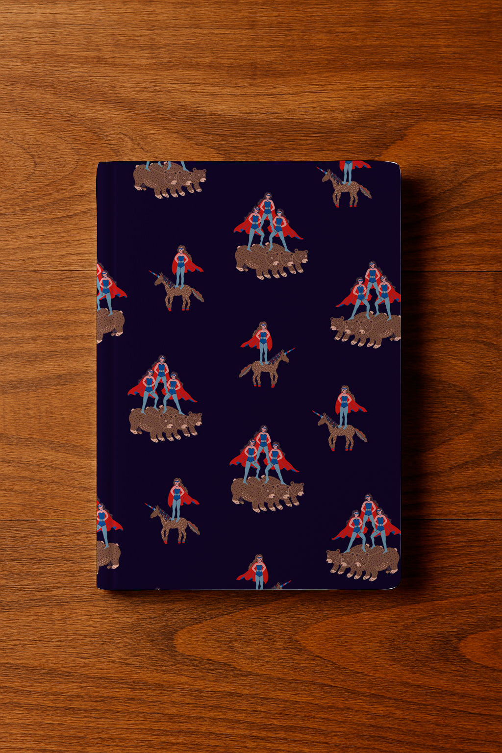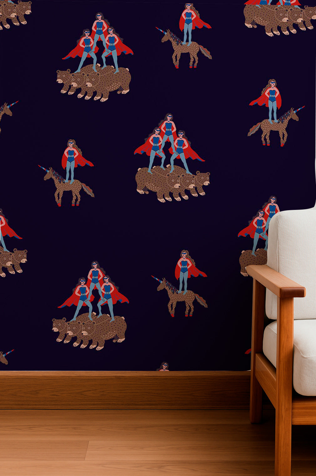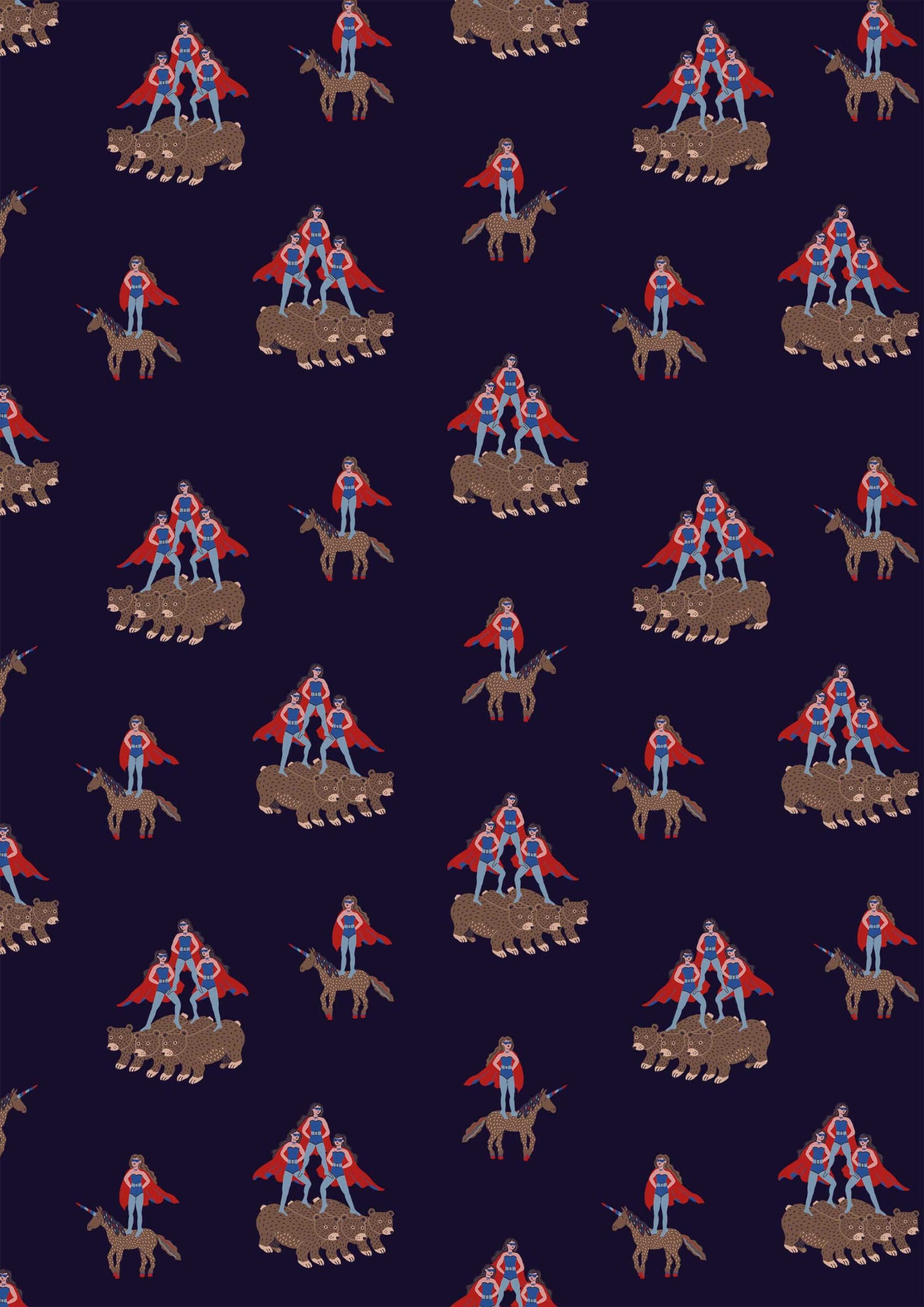 Patrón caprichoso y repetitivo de figuras con capa montando unicornios y osos. Concepto original y divertido sobre fondo azul marino.