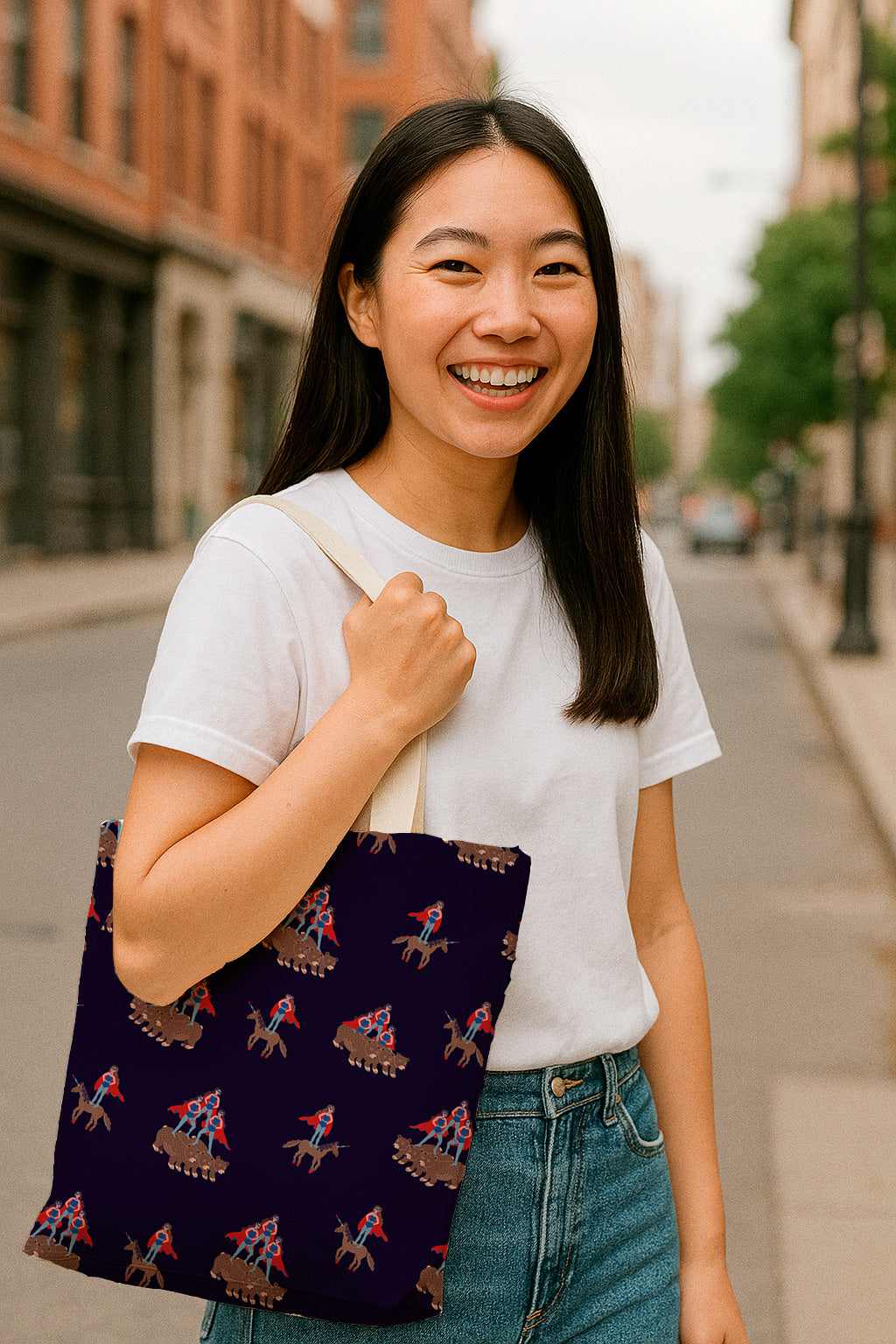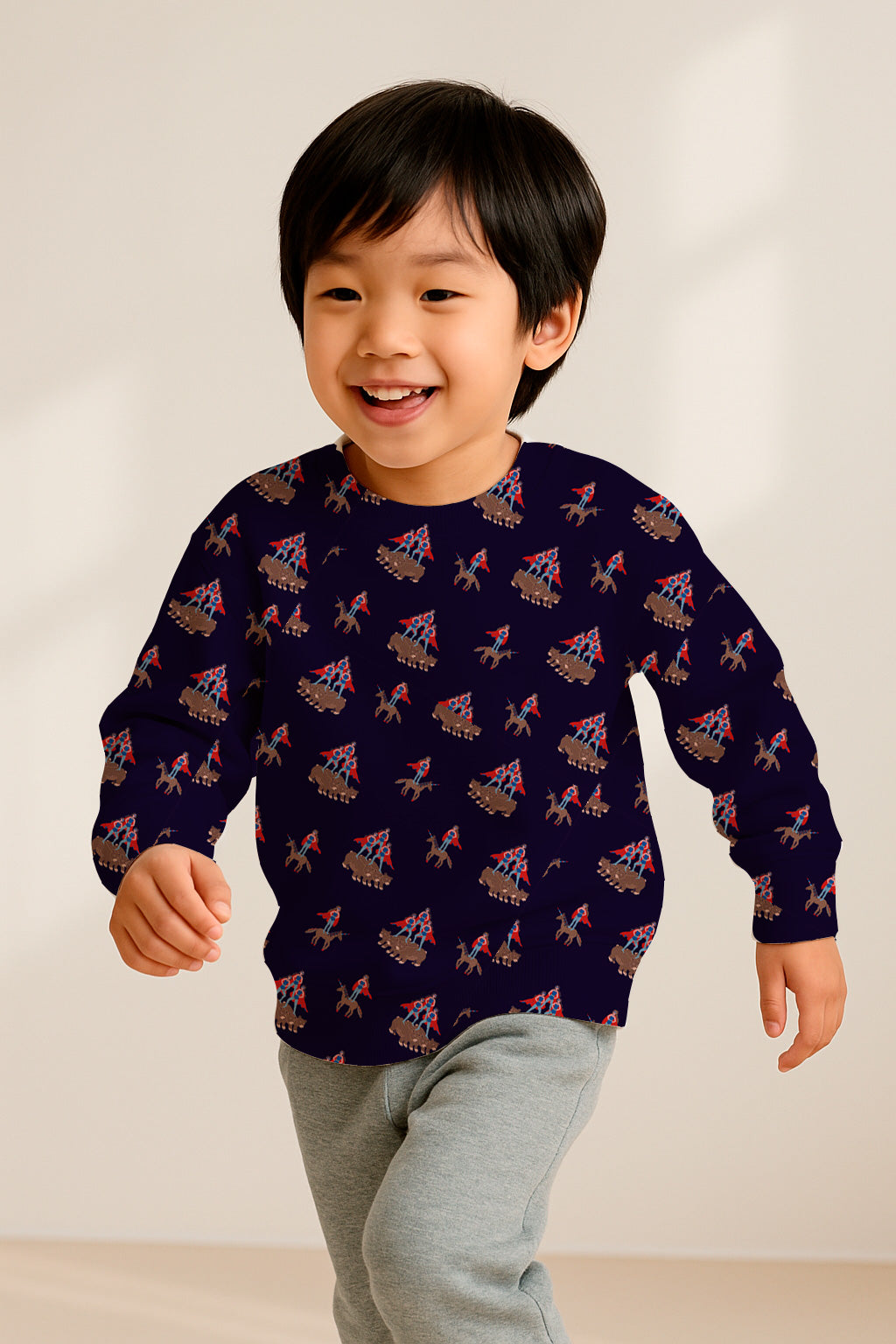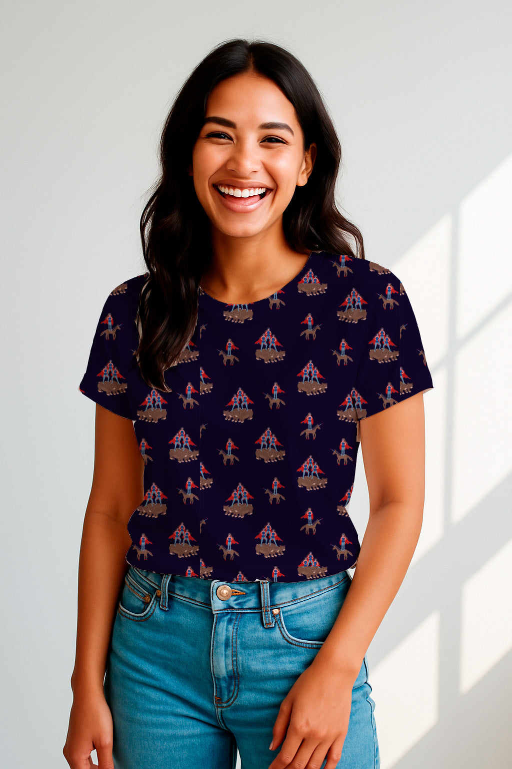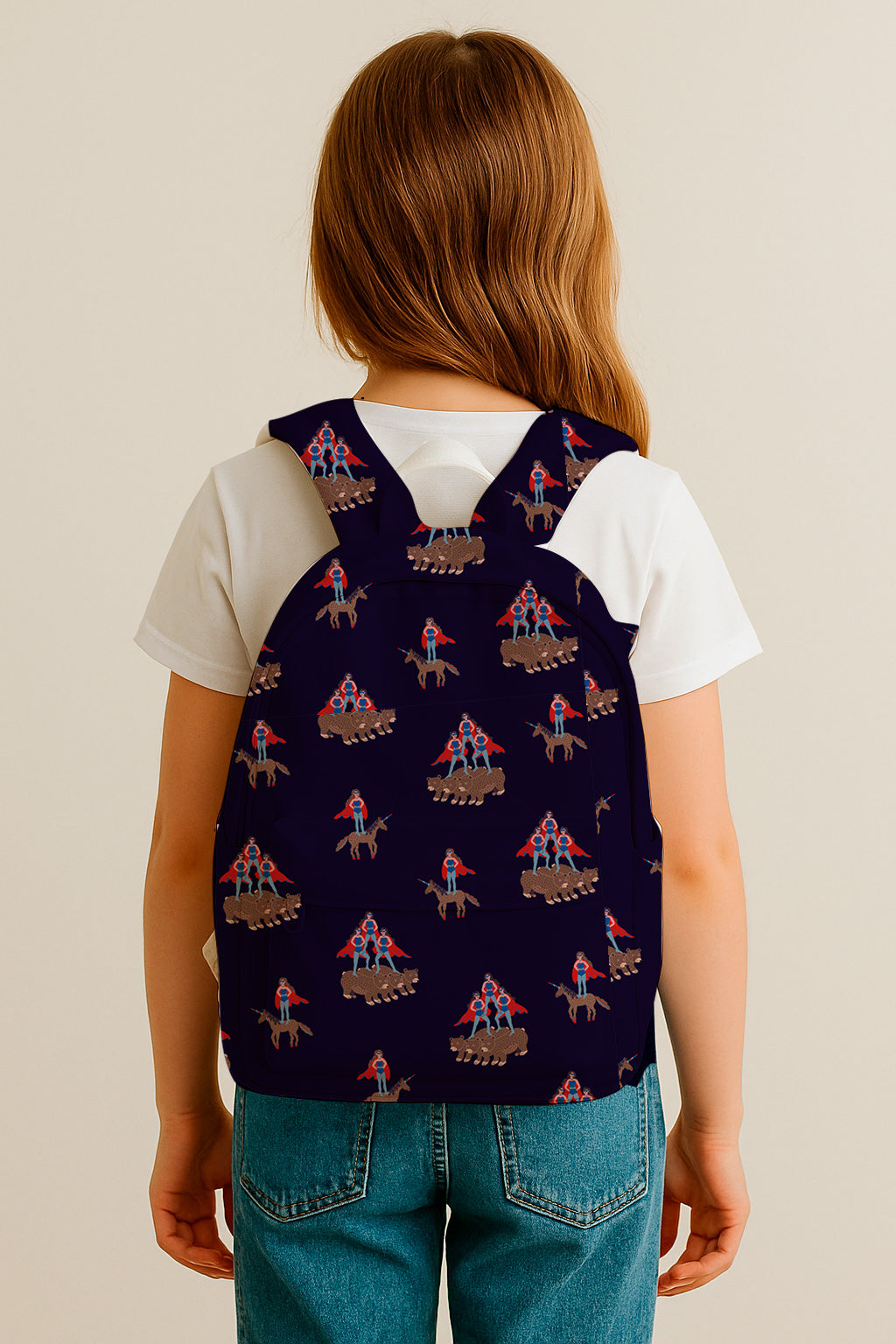 Patrón caprichoso y repetitivo de figuras con capa montando unicornios y osos. Concepto original y divertido sobre fondo azul marino.