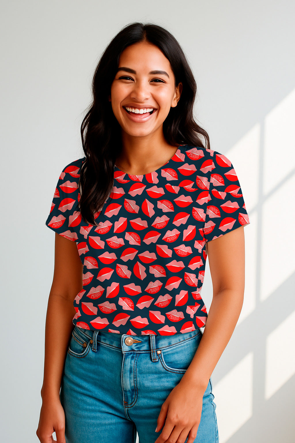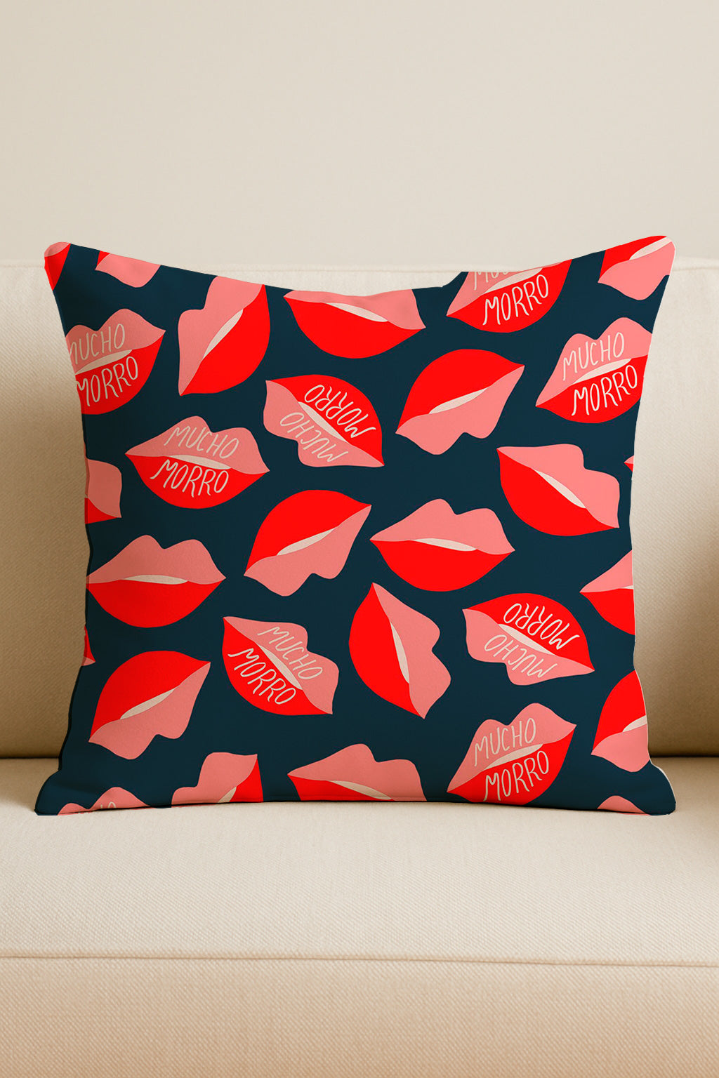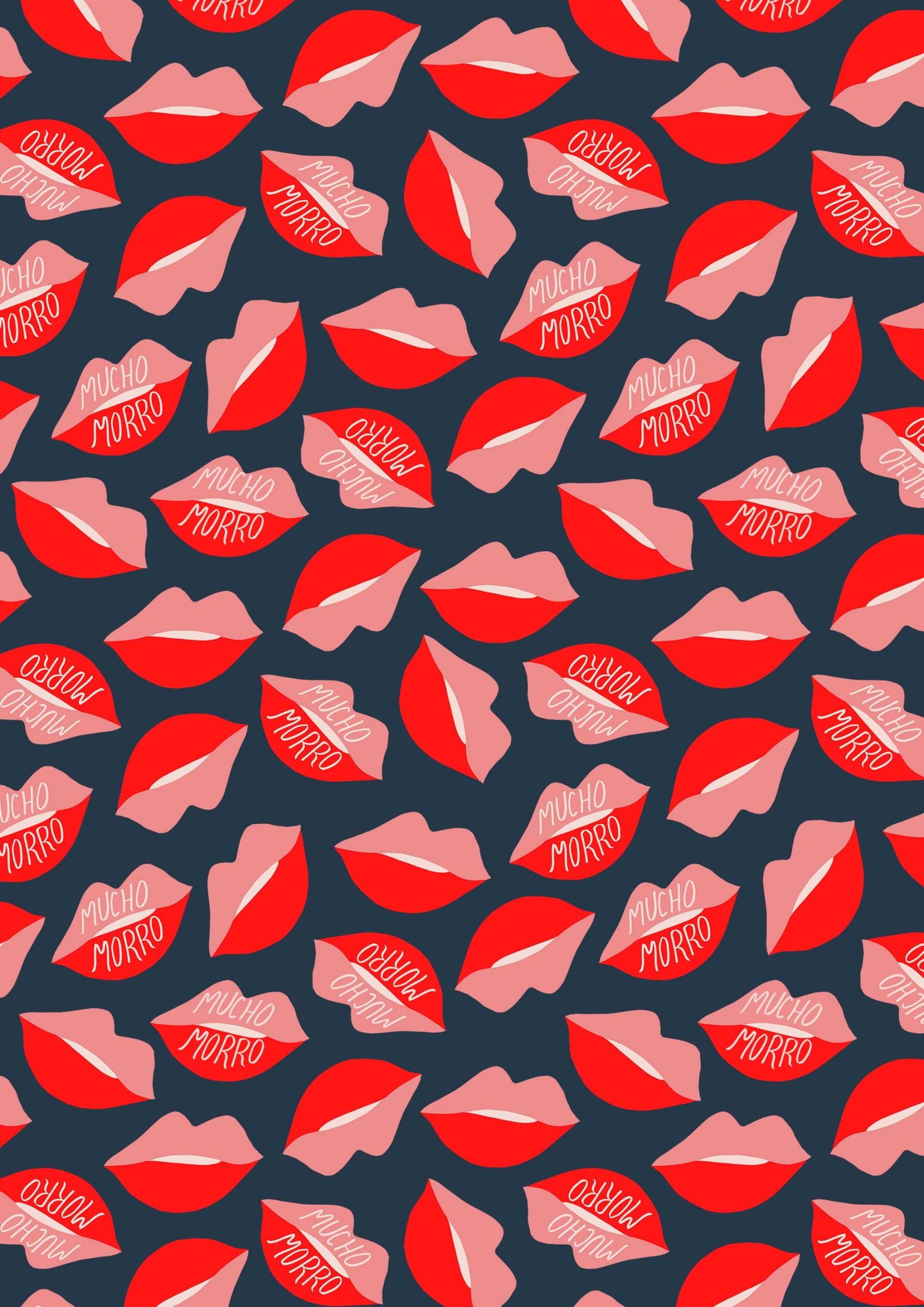Estampado lúdico y atrevido con labios rojos y rosas, algunos con el texto 'Mucho Morro' —jerga española que significa 'descaro' o 'atrevimiento'.