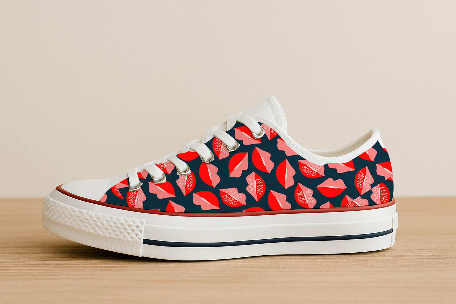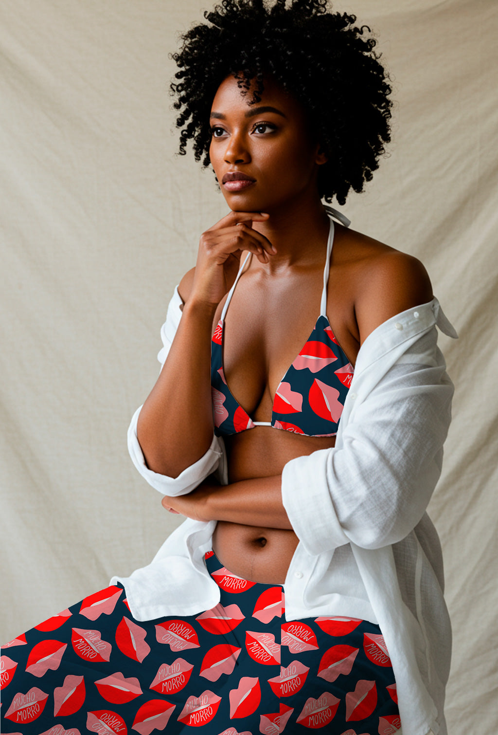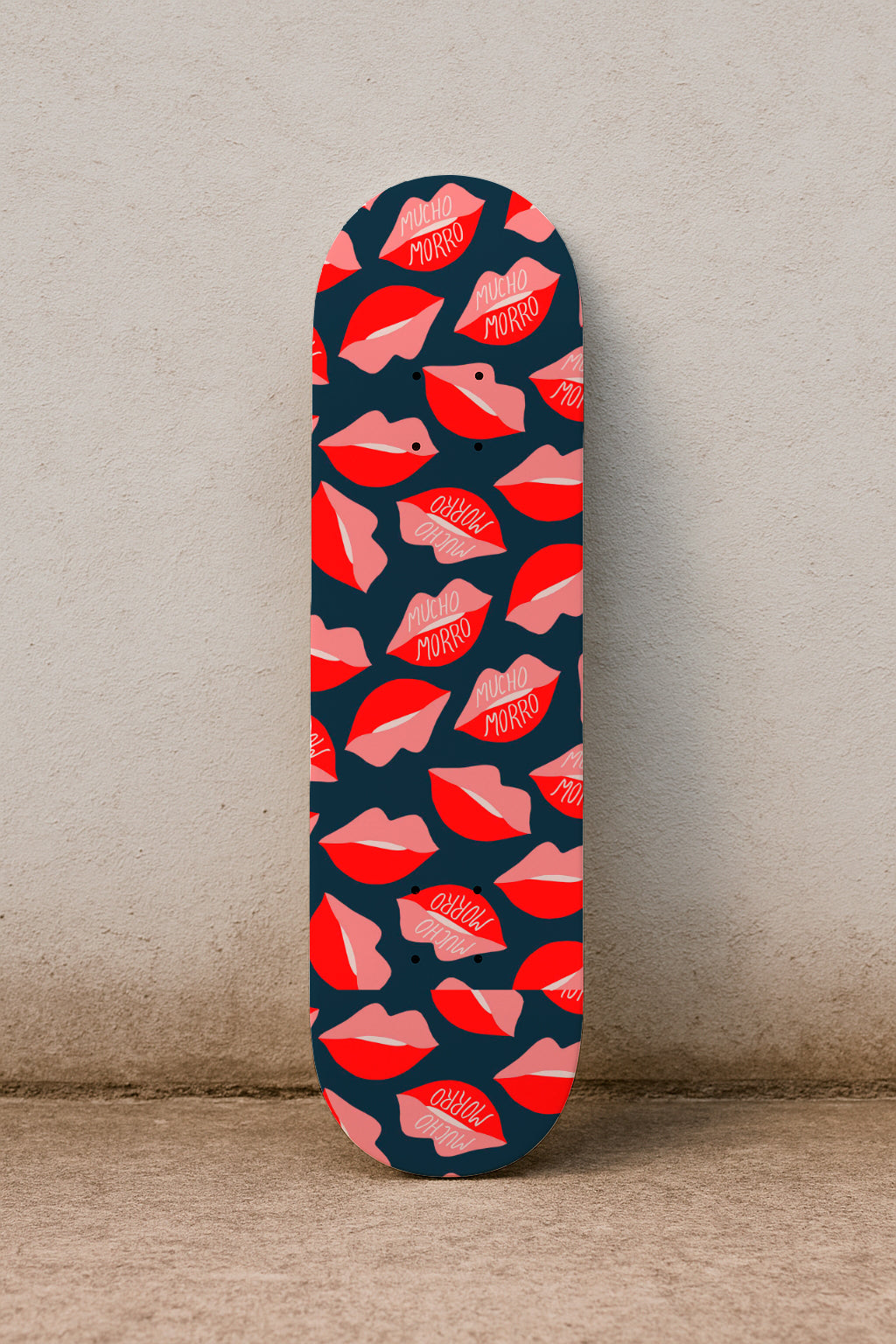 Estampado lúdico y atrevido con labios rojos y rosas, algunos con el texto 'Mucho Morro' —jerga española que significa 'descaro' o 'atrevimiento'.