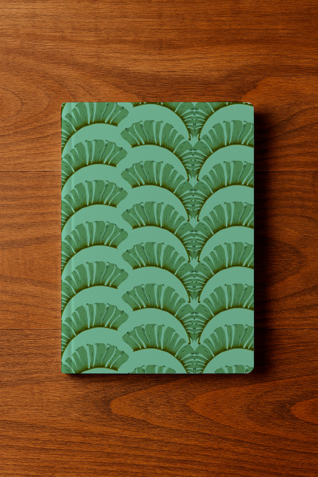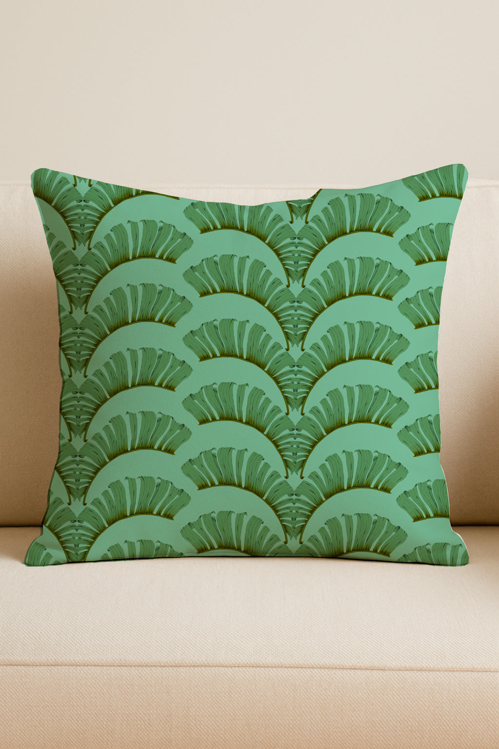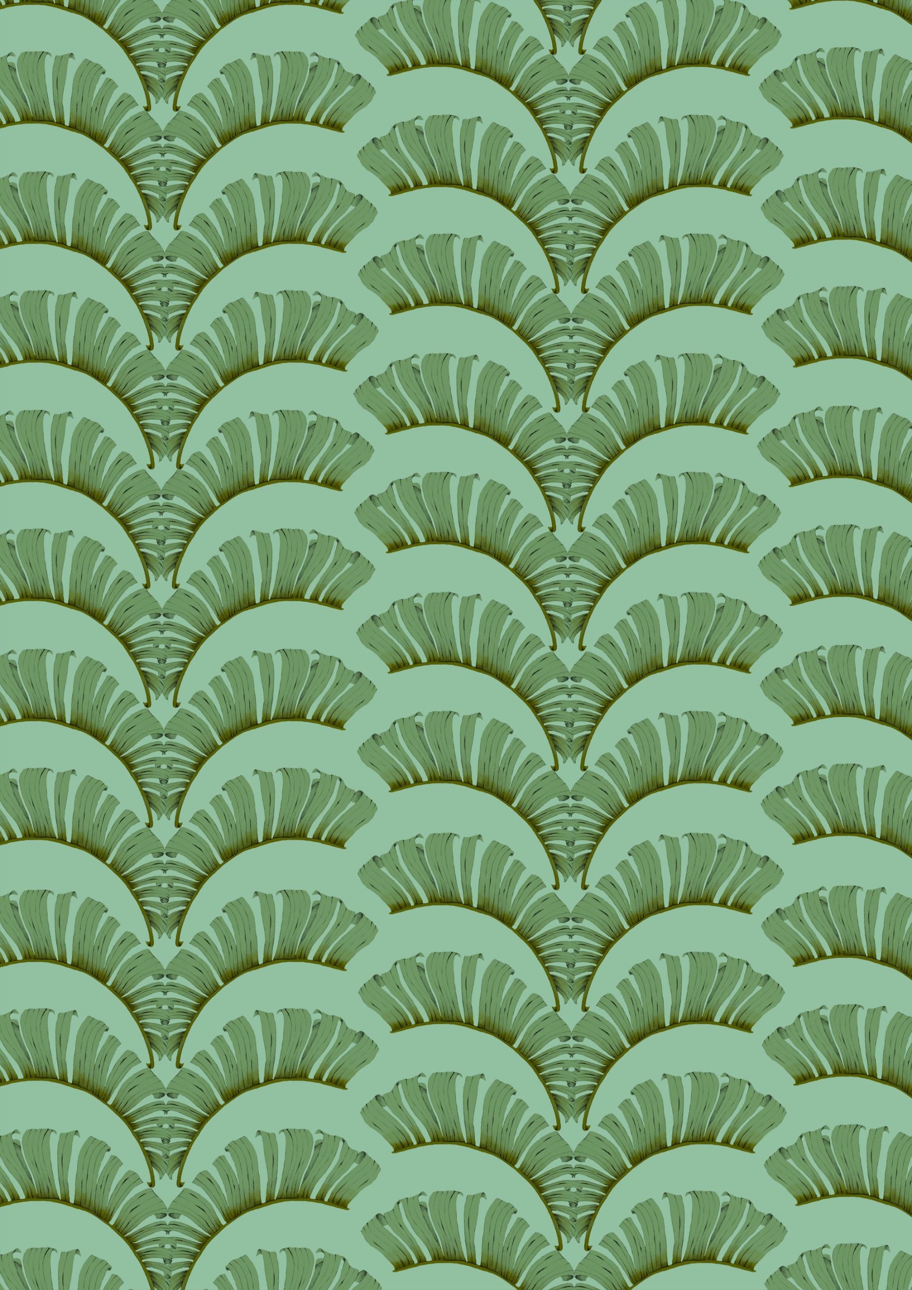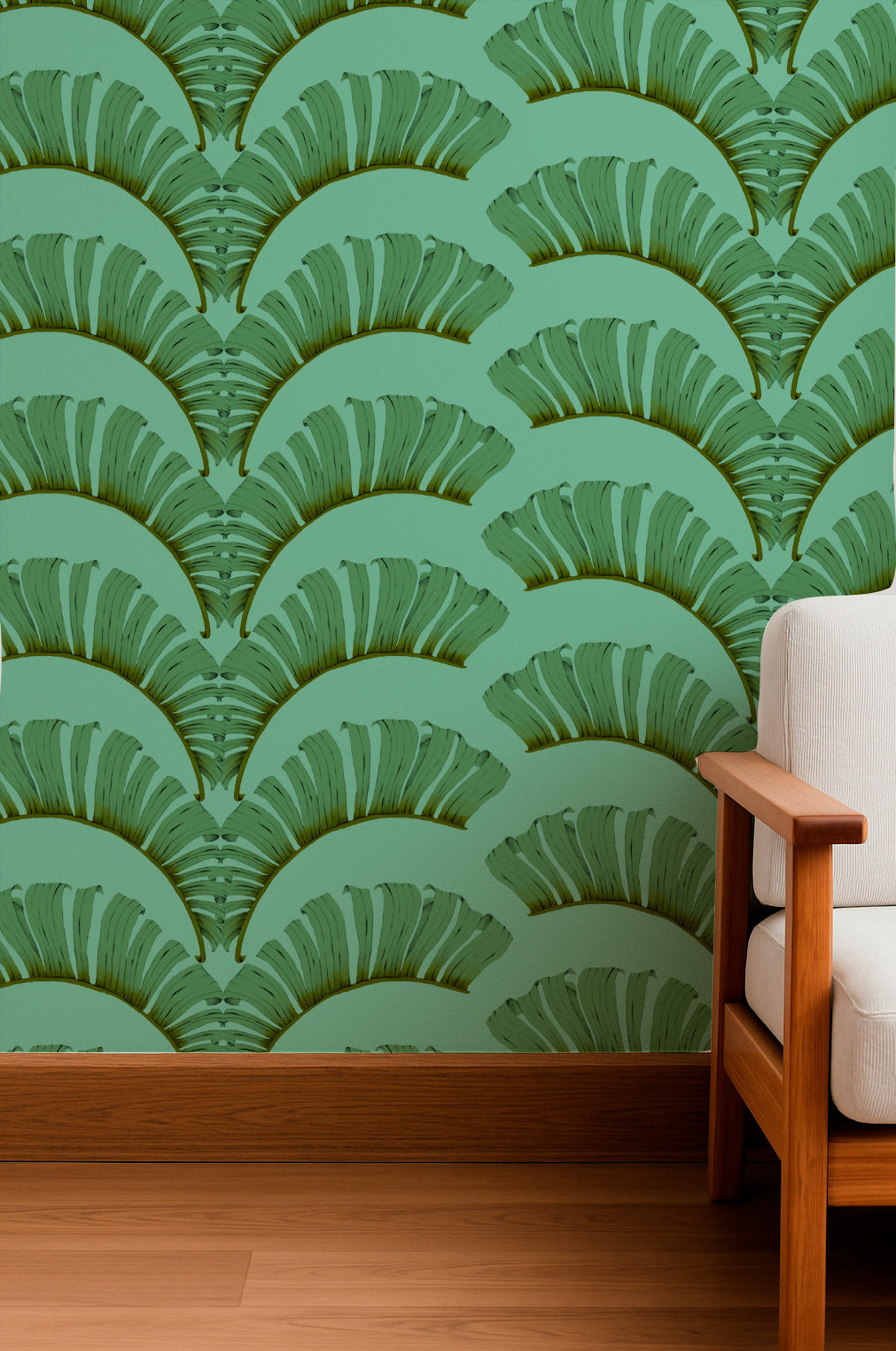 Hojas de palma verdes estilizadas en una disposición geométrica en forma de abanico sobre un fondo verde menta, ofreciendo un motivo fresco y repetitivo.