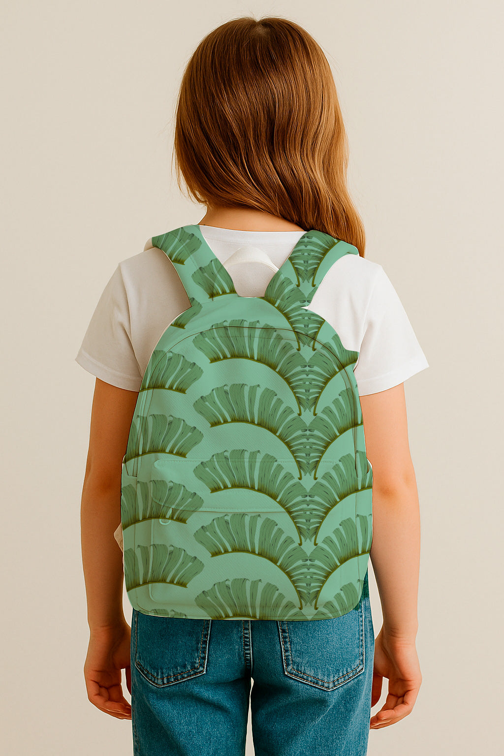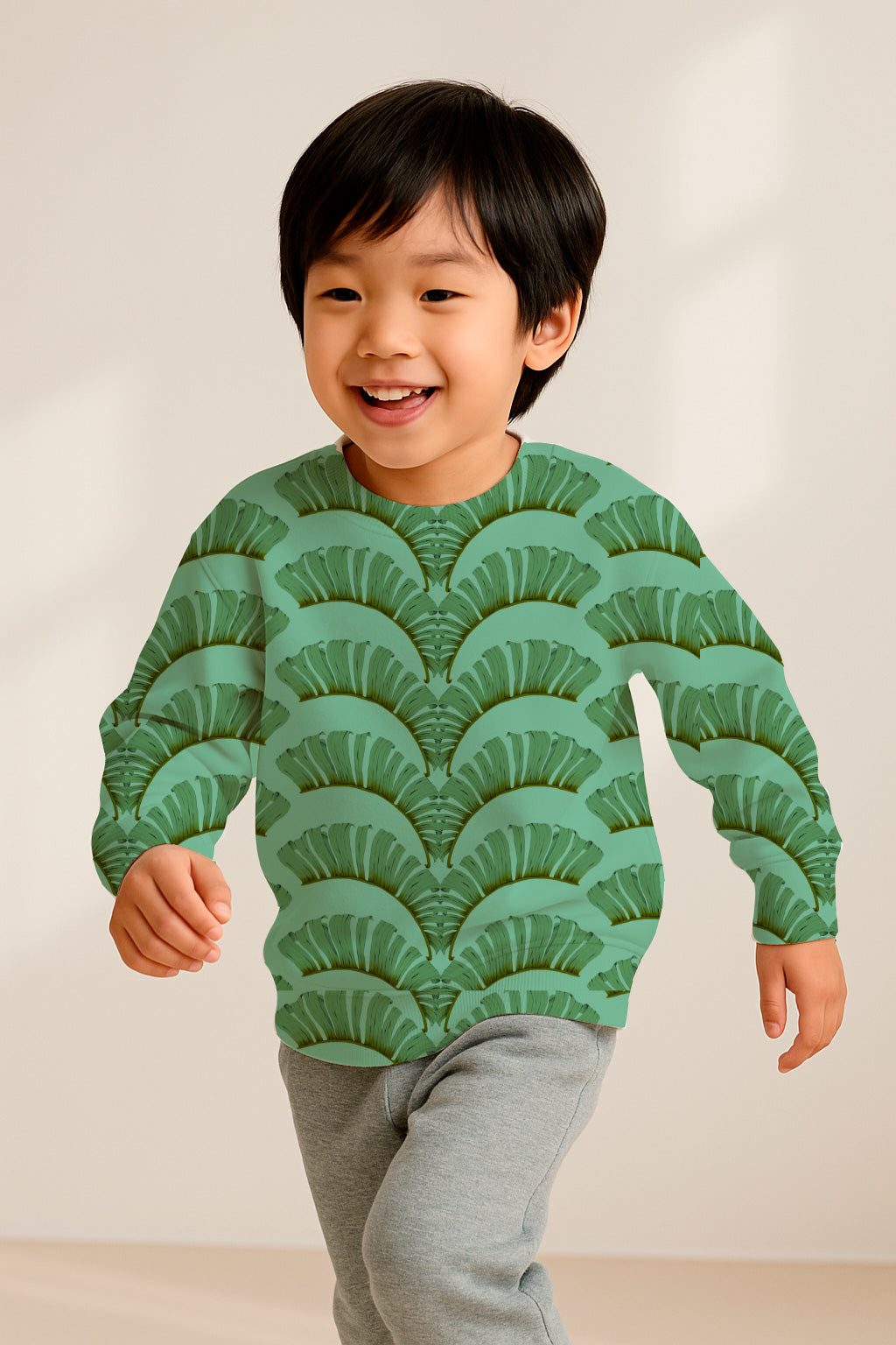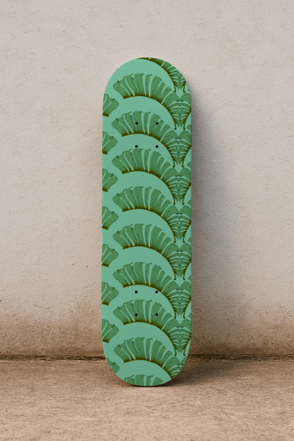 Hojas de palma verdes estilizadas en una disposición geométrica en forma de abanico sobre un fondo verde menta, ofreciendo un motivo fresco y repetitivo.