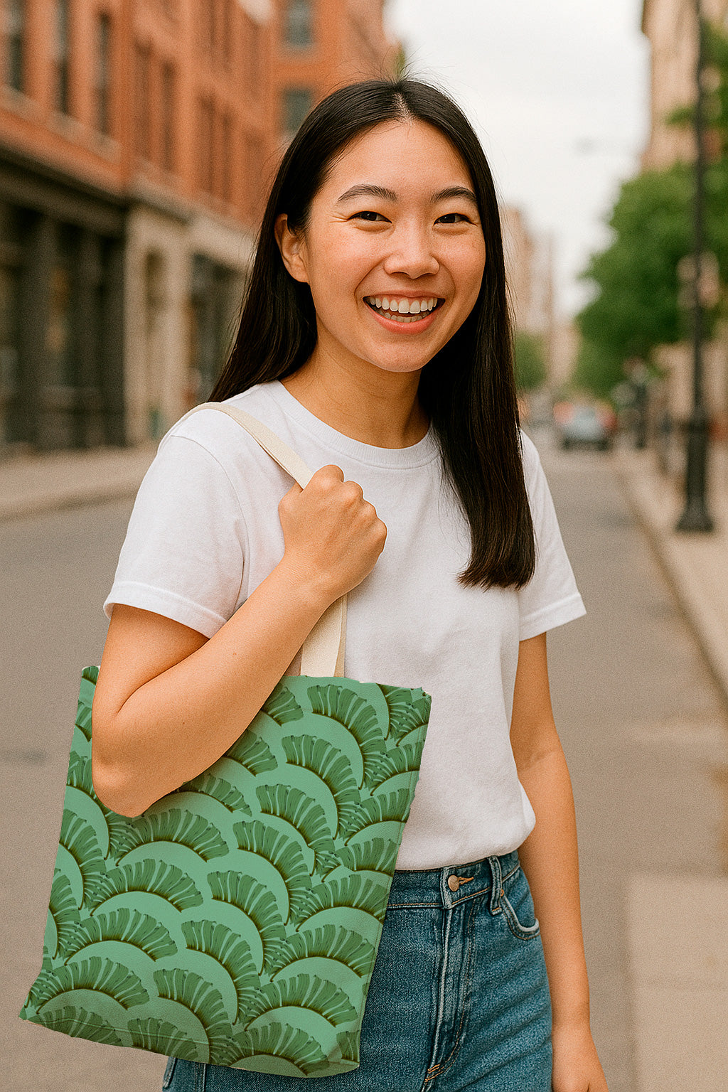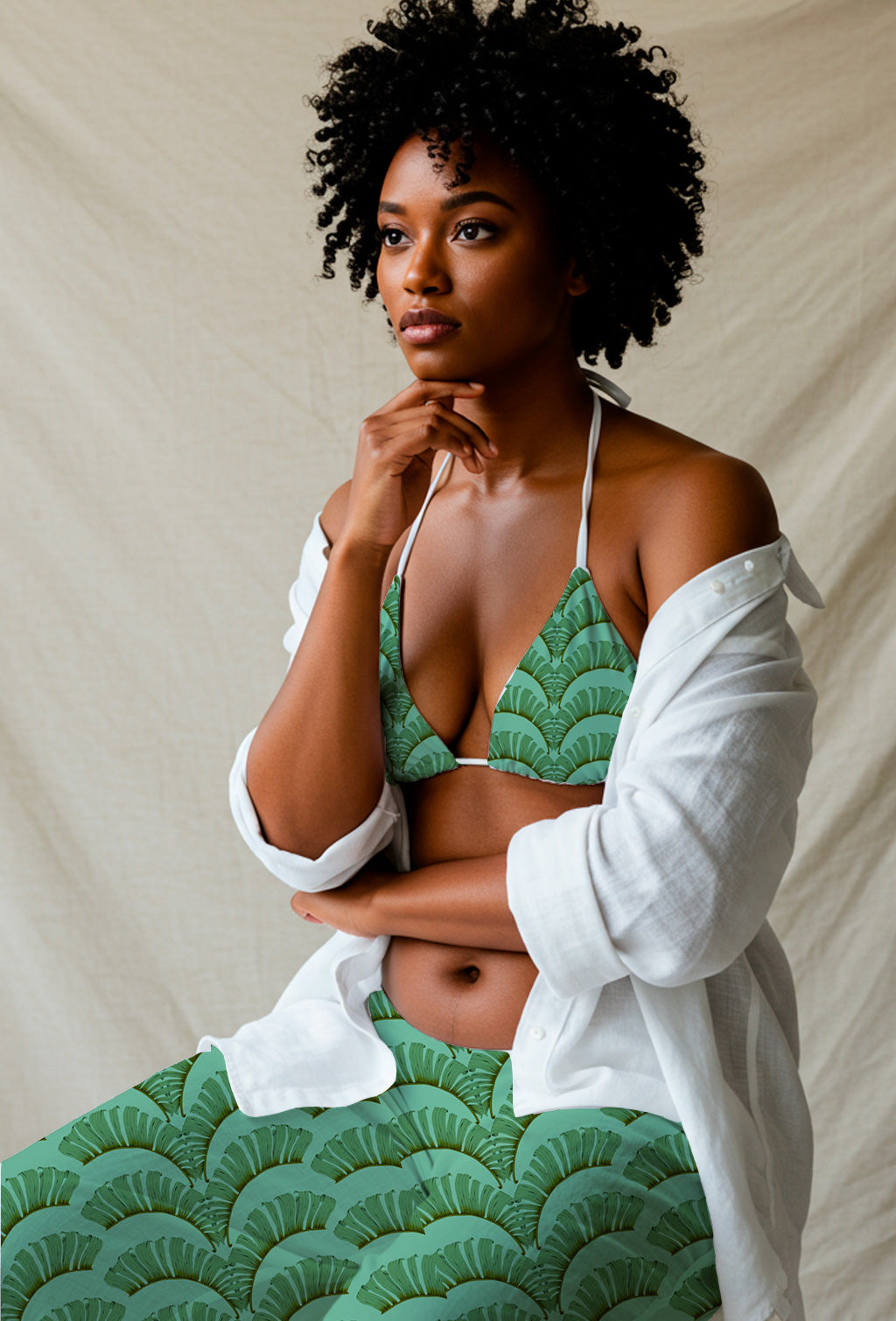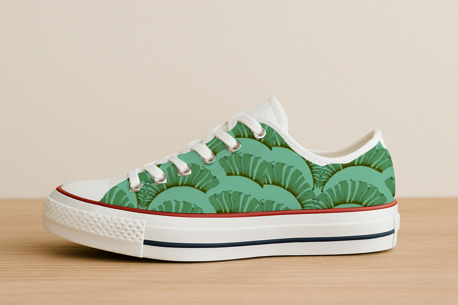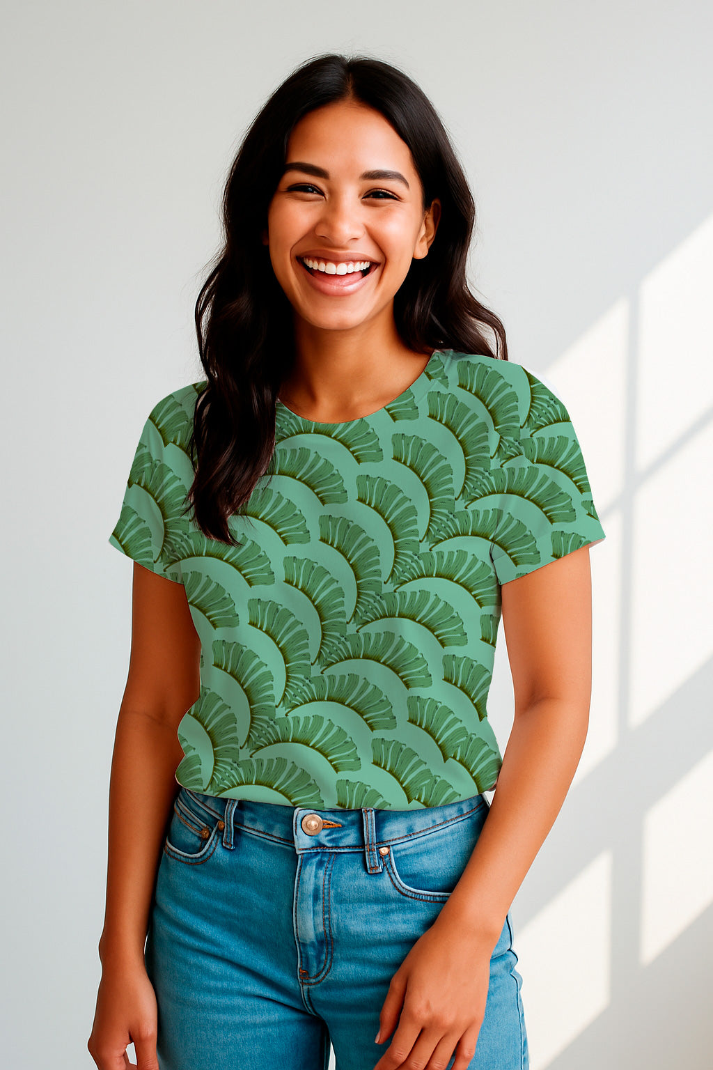 Hojas de palma verdes estilizadas en una disposición geométrica en forma de abanico sobre un fondo verde menta, ofreciendo un motivo fresco y repetitivo.