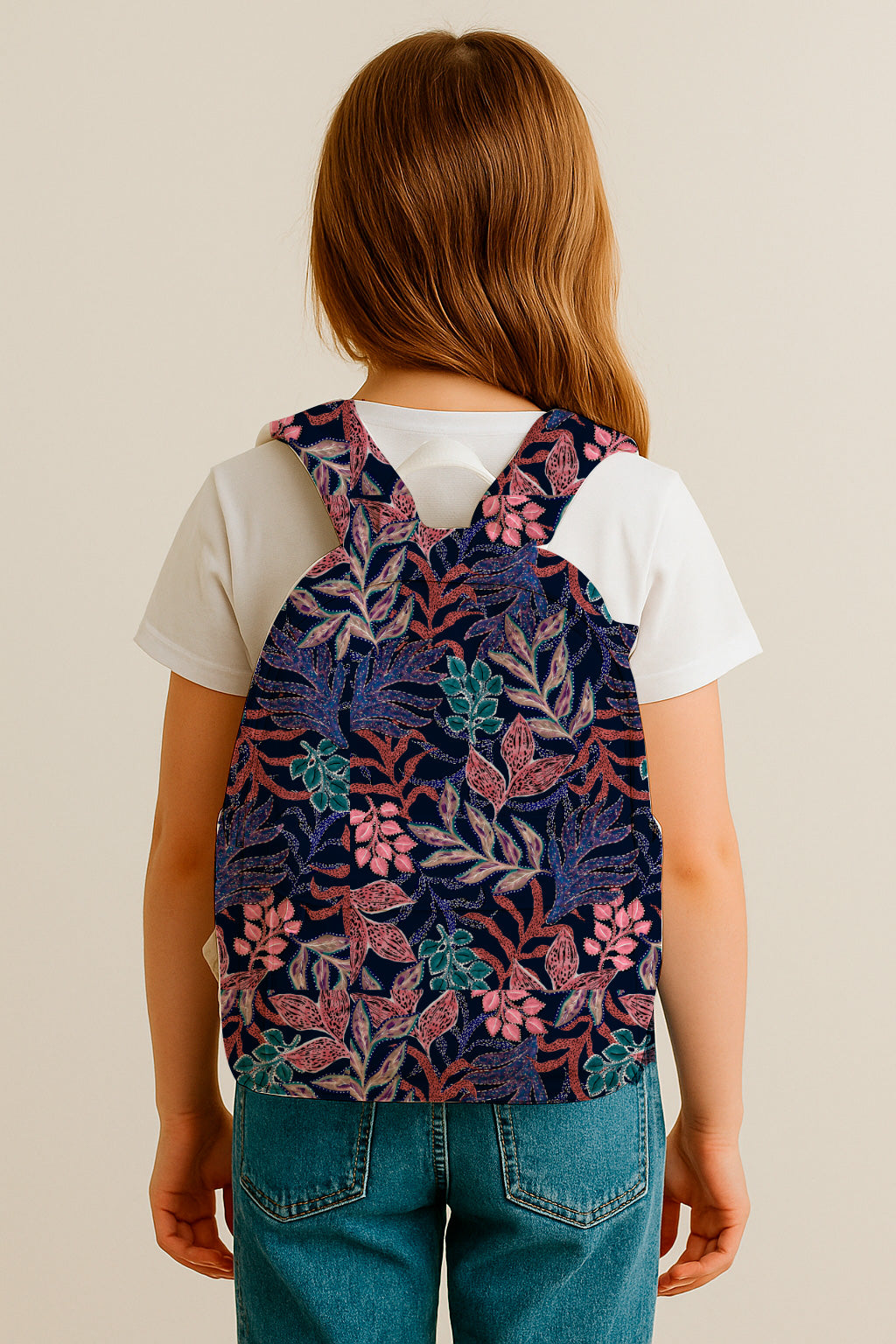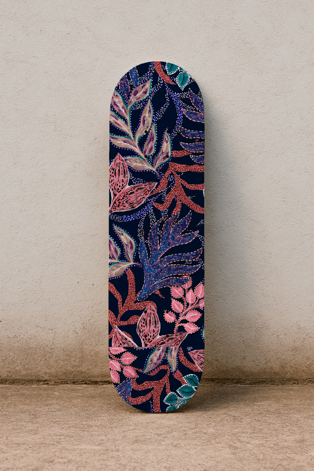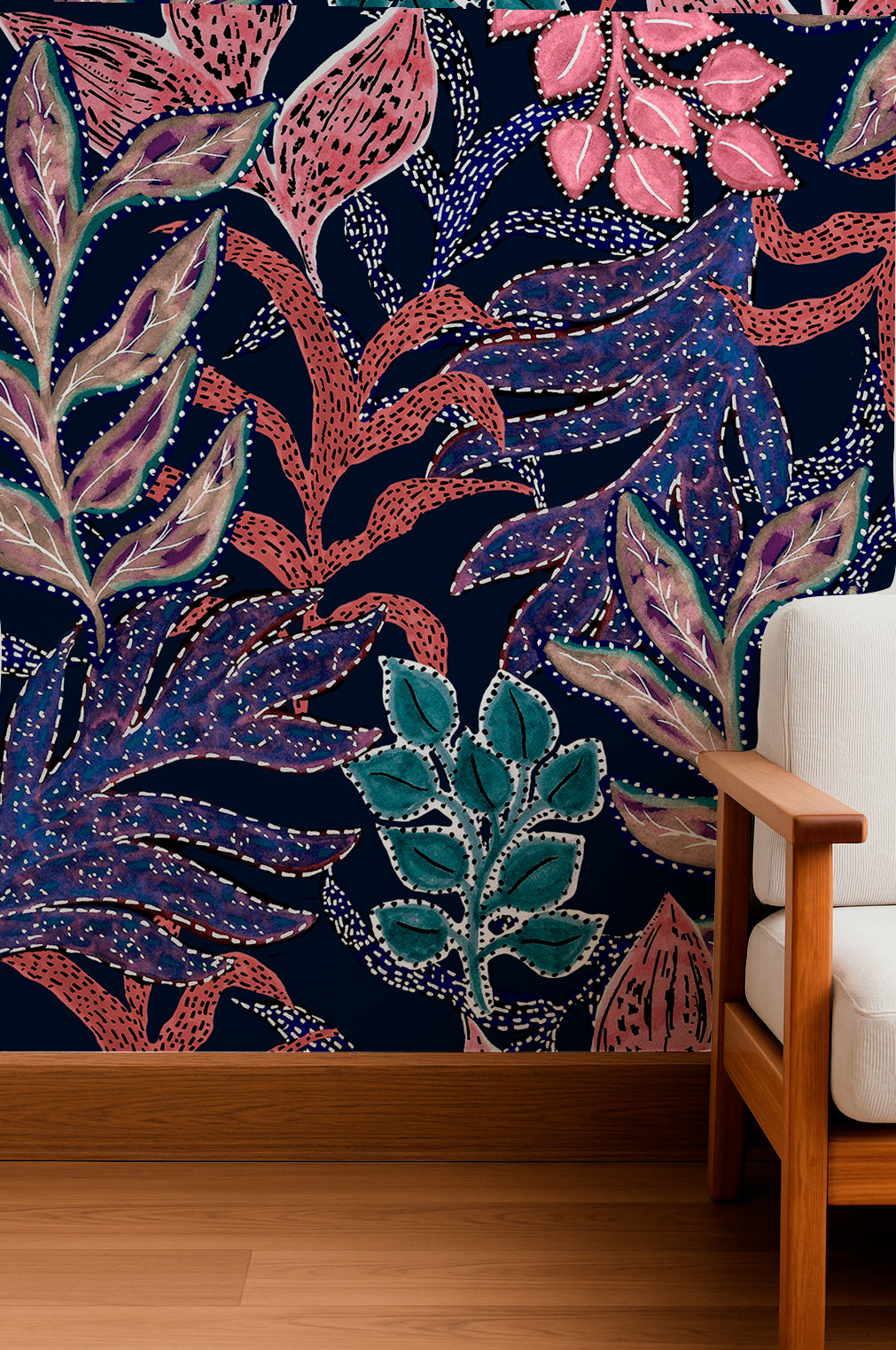 Fondo oscuro repleto de grandes hojas pintadas a mano en tonos rosas, morados y azules apagados.