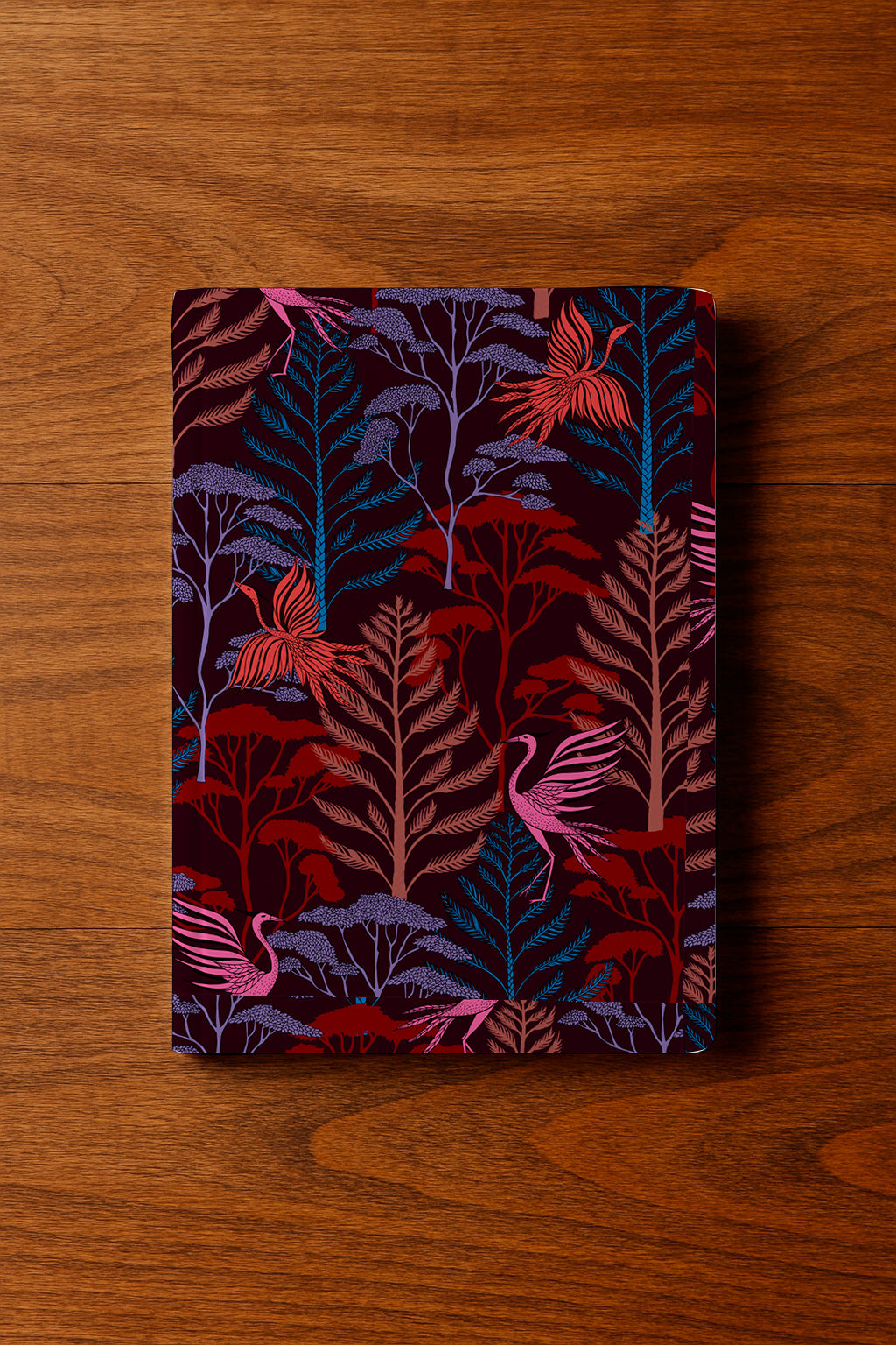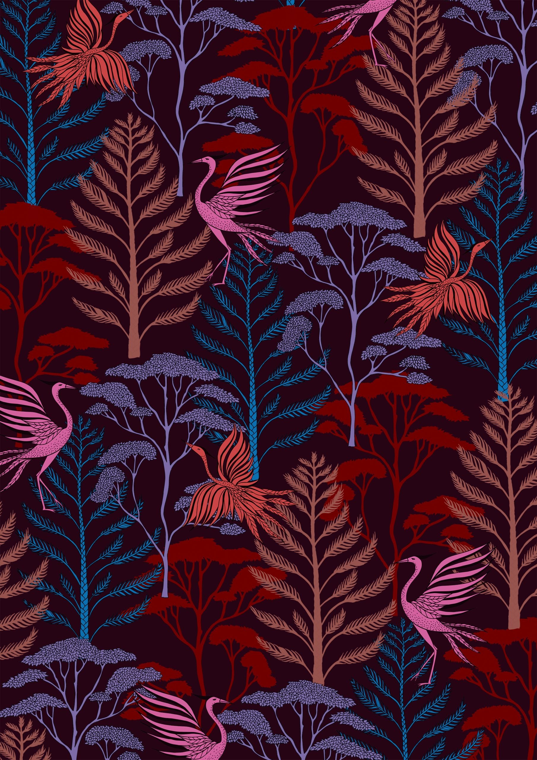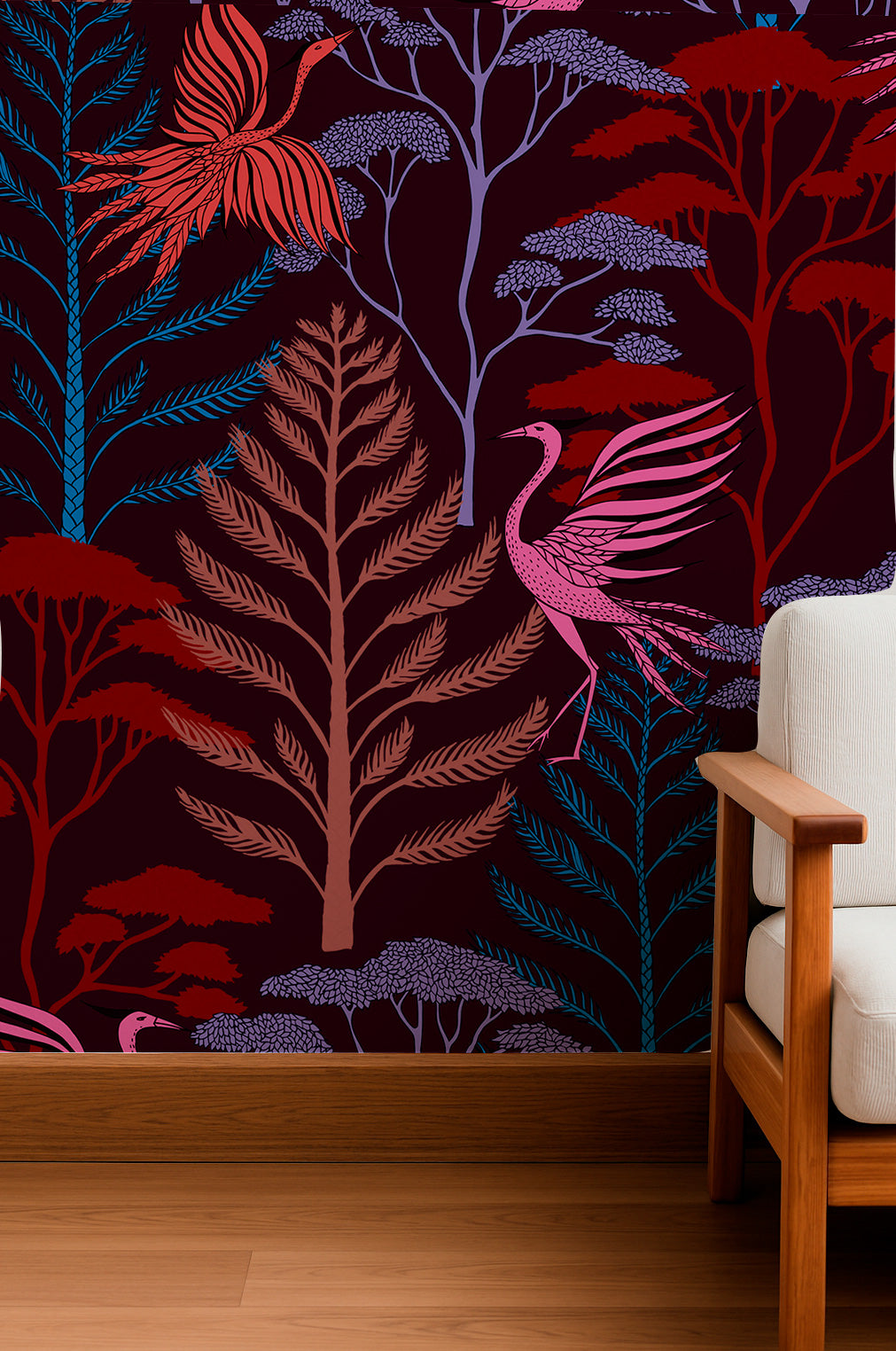 Grullas volando y posadas entre árboles estilizados en tonos contrastantes de rosa y azul.