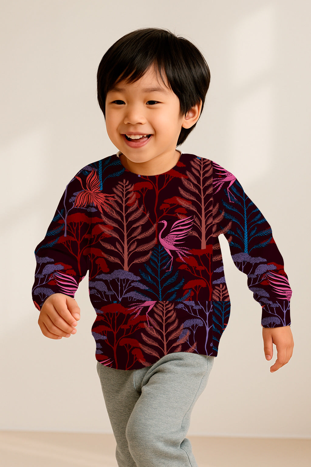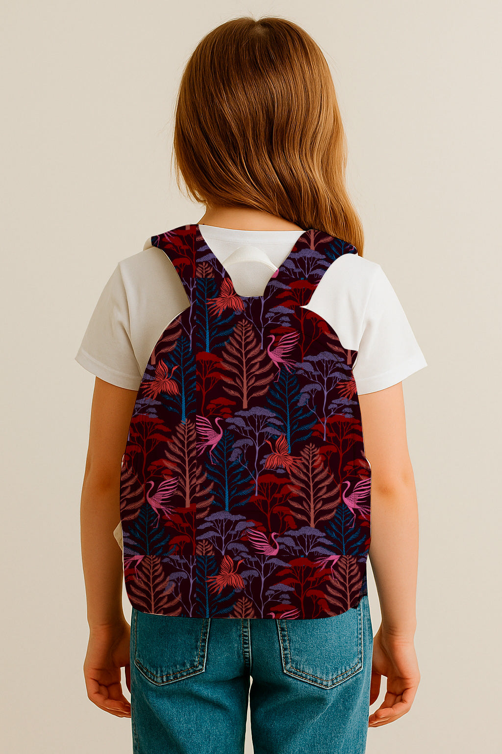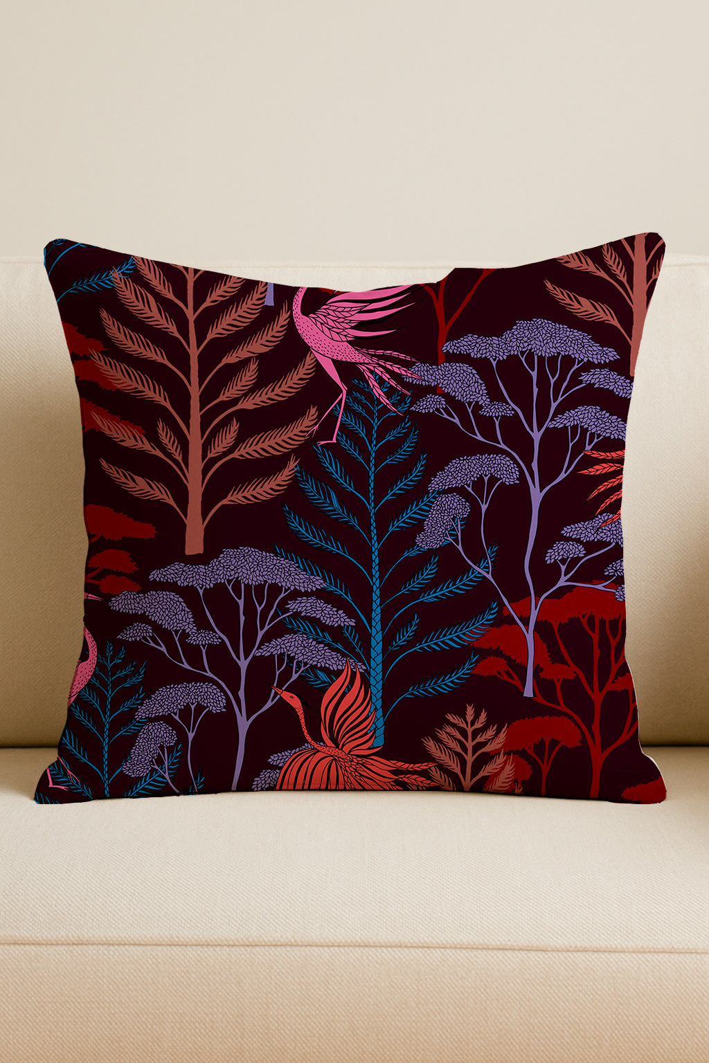 Grullas volando y posadas entre árboles estilizados en tonos contrastantes de rosa y azul.