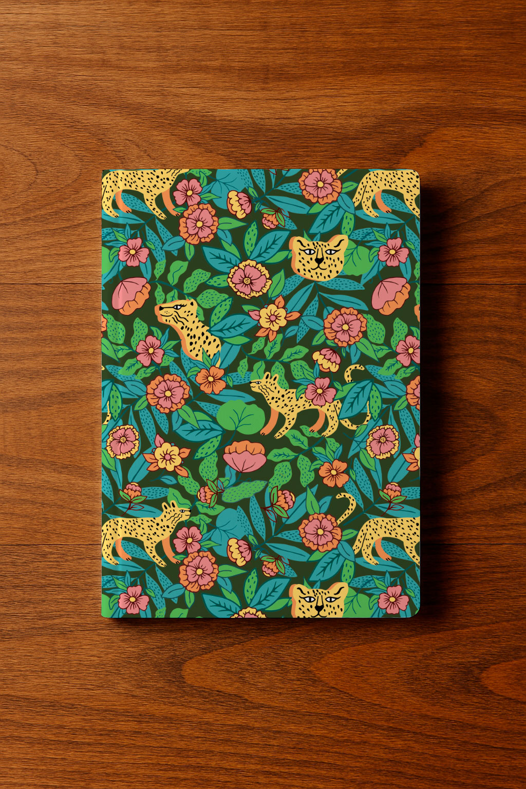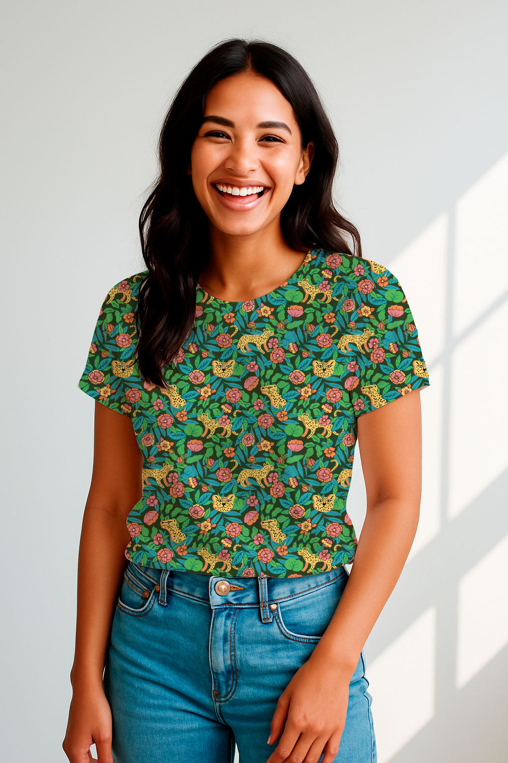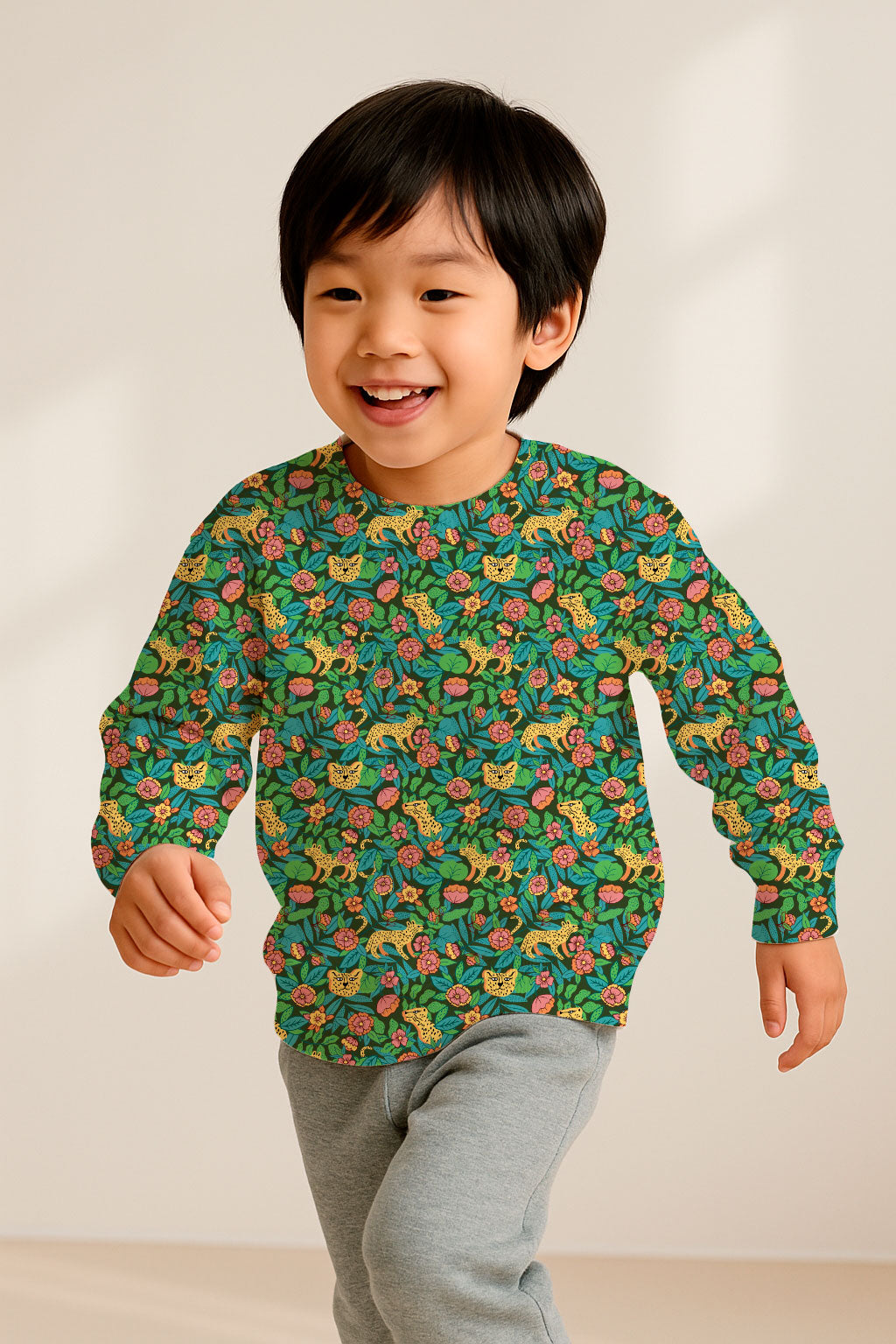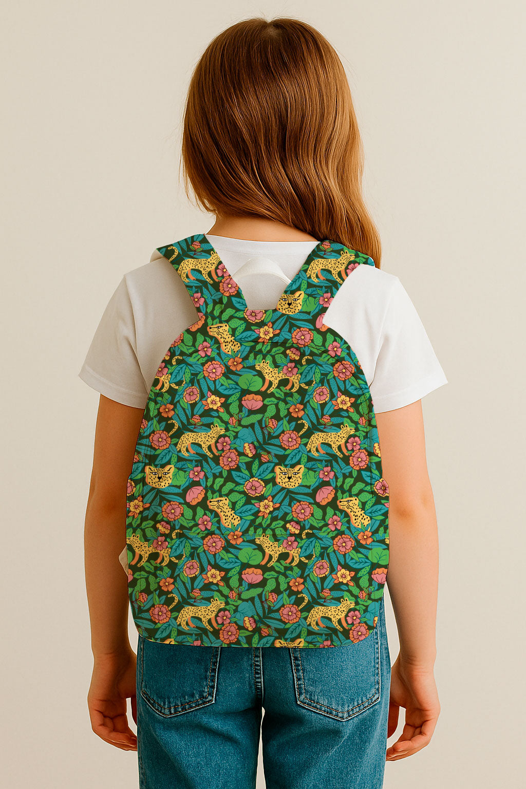 Follaje selvático colorido con leopardos juguetones escondidos entre flores tropicales brillantes. Un estampado alegre y exótico, perfecto para niños o para quienes buscan un look atrevido.