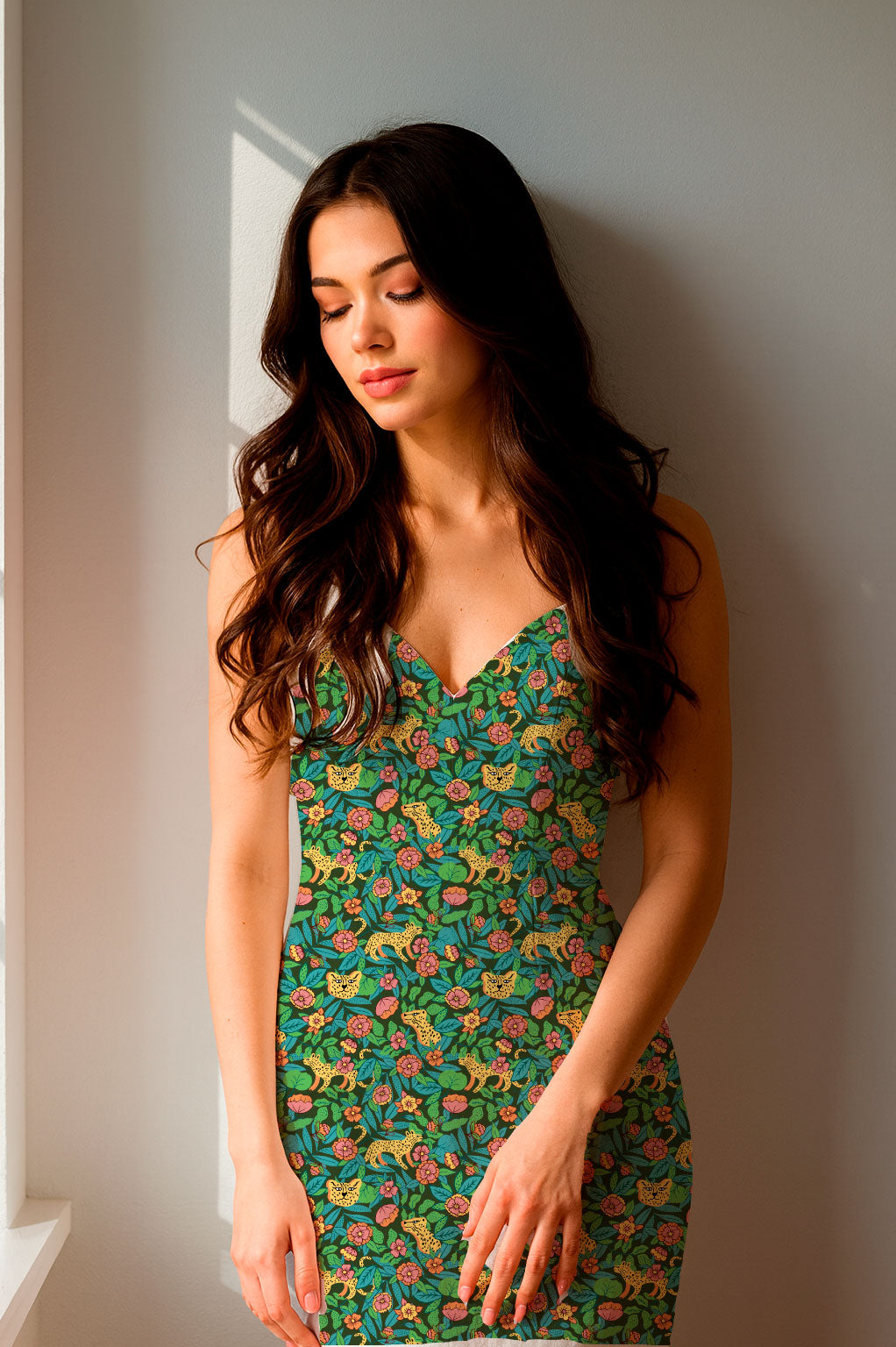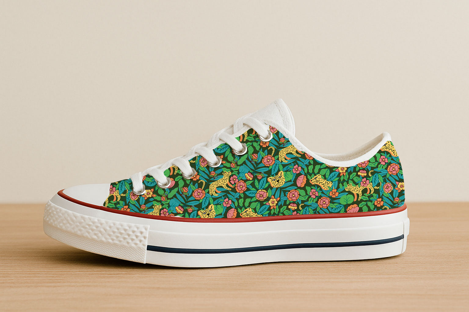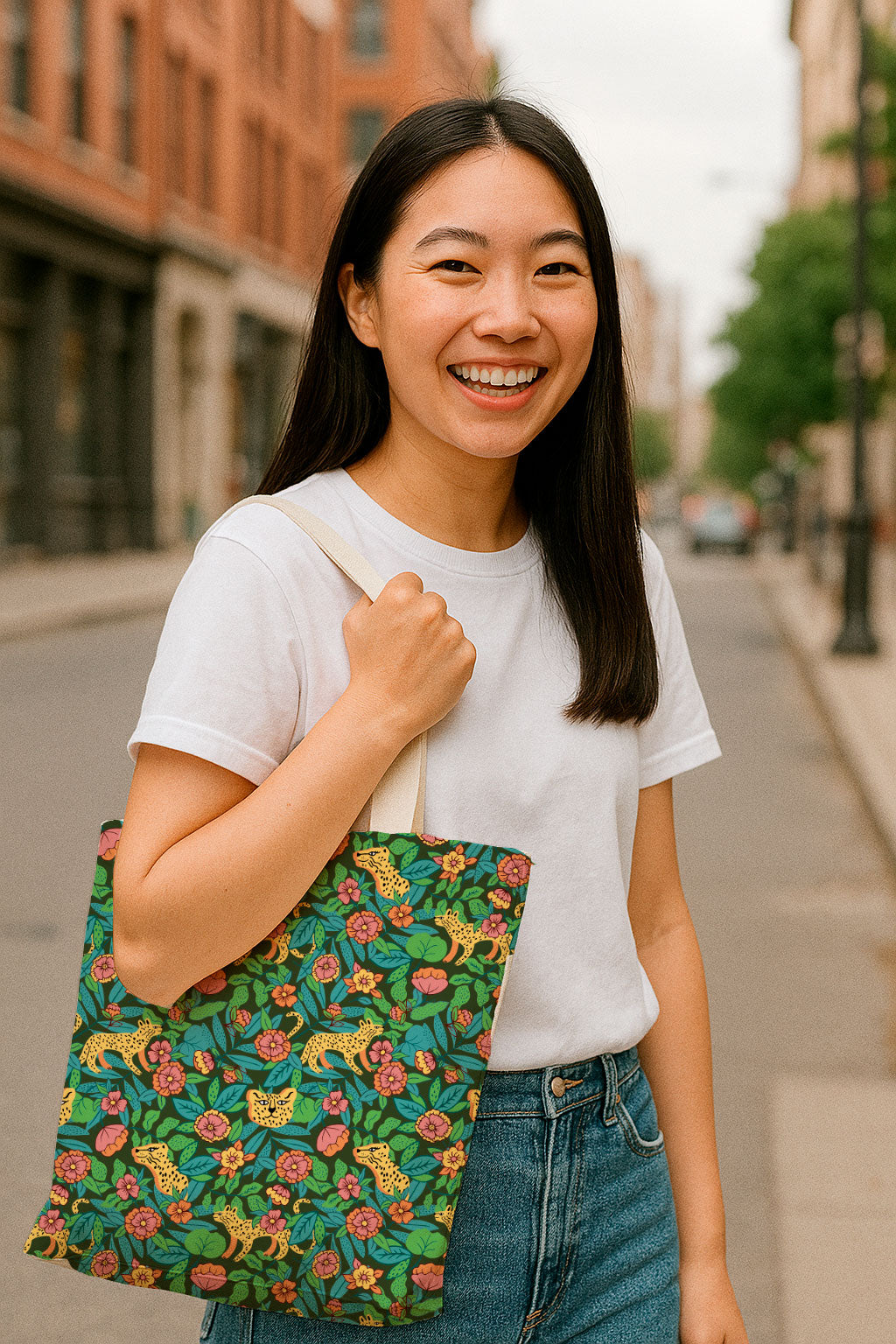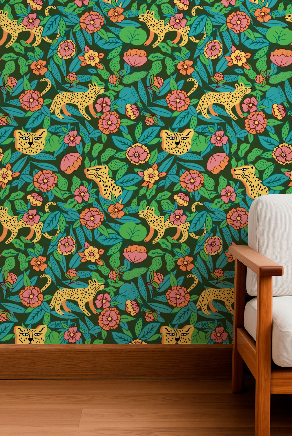 Follaje selvático colorido con leopardos juguetones escondidos entre flores tropicales brillantes. Un estampado alegre y exótico, perfecto para niños o para quienes buscan un look atrevido.